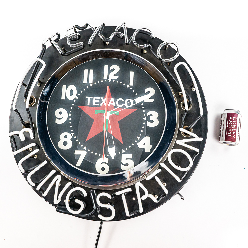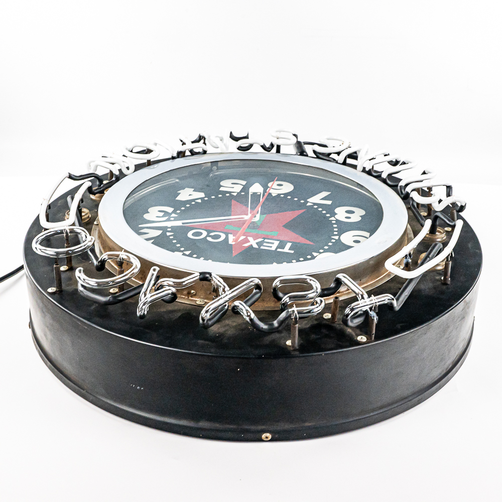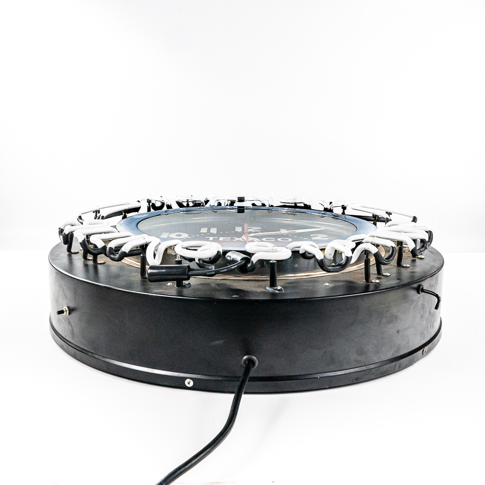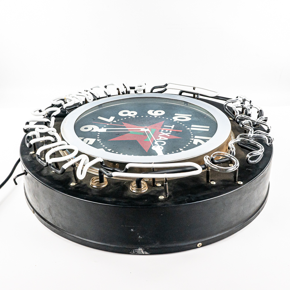 Large 26″ diameter can with an 18″ Texaco clock face ringed in orange neon. Border of can is ringed with external neon reading Texaco Filling Station. A switch on the side of the can turns the neon on and off. In VG condition with all neon perfect. Overall measures 26″ in diameter, 7″ deep. No shipping on this item. Customer pickup or 3rd party transport only.