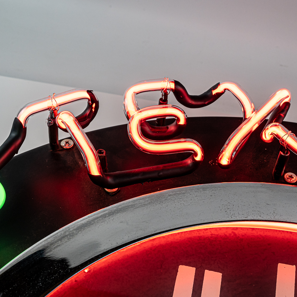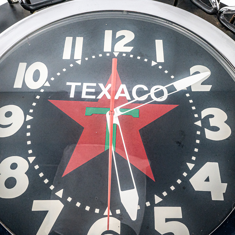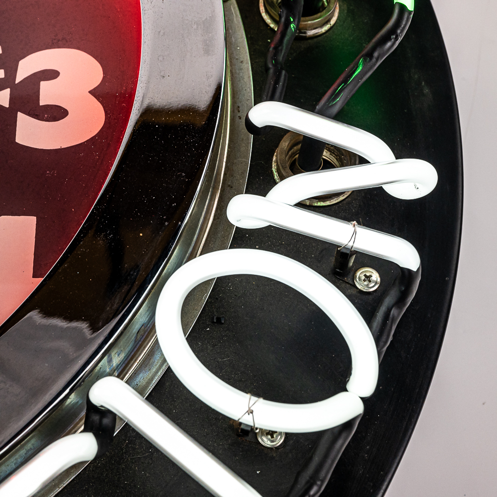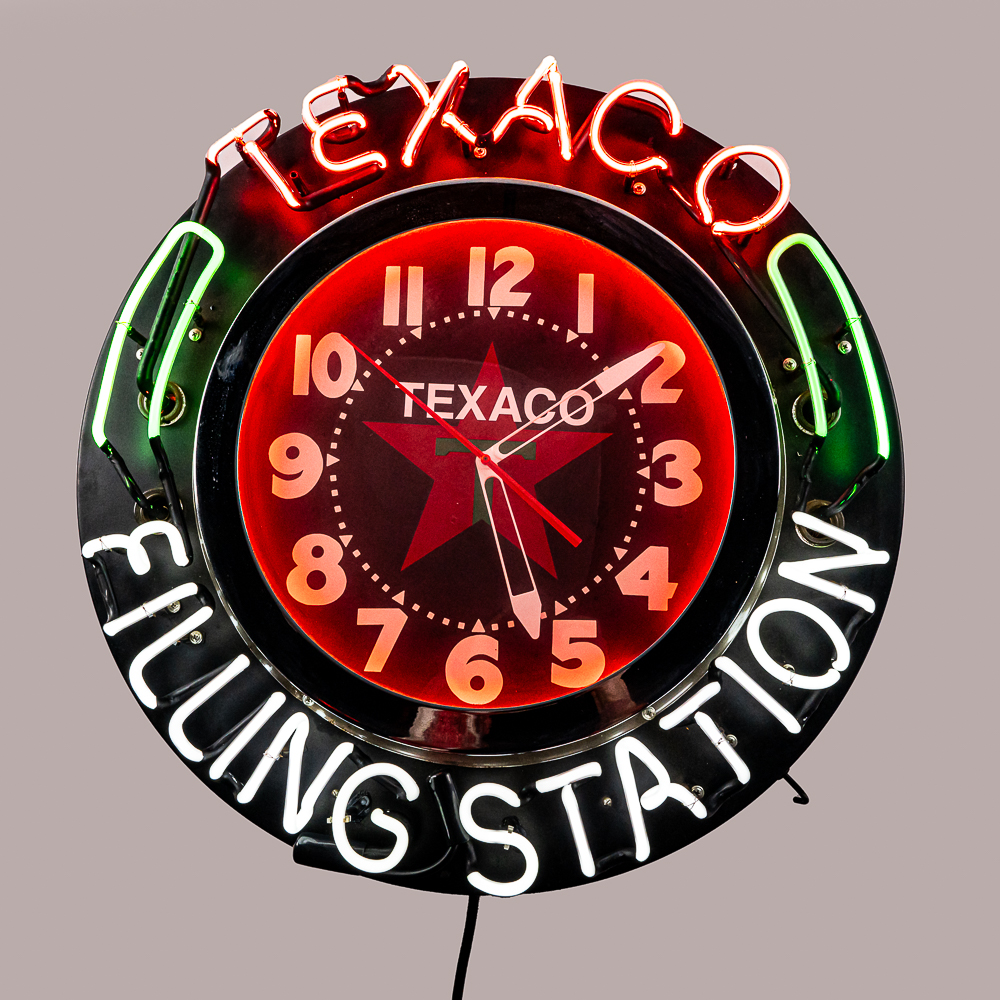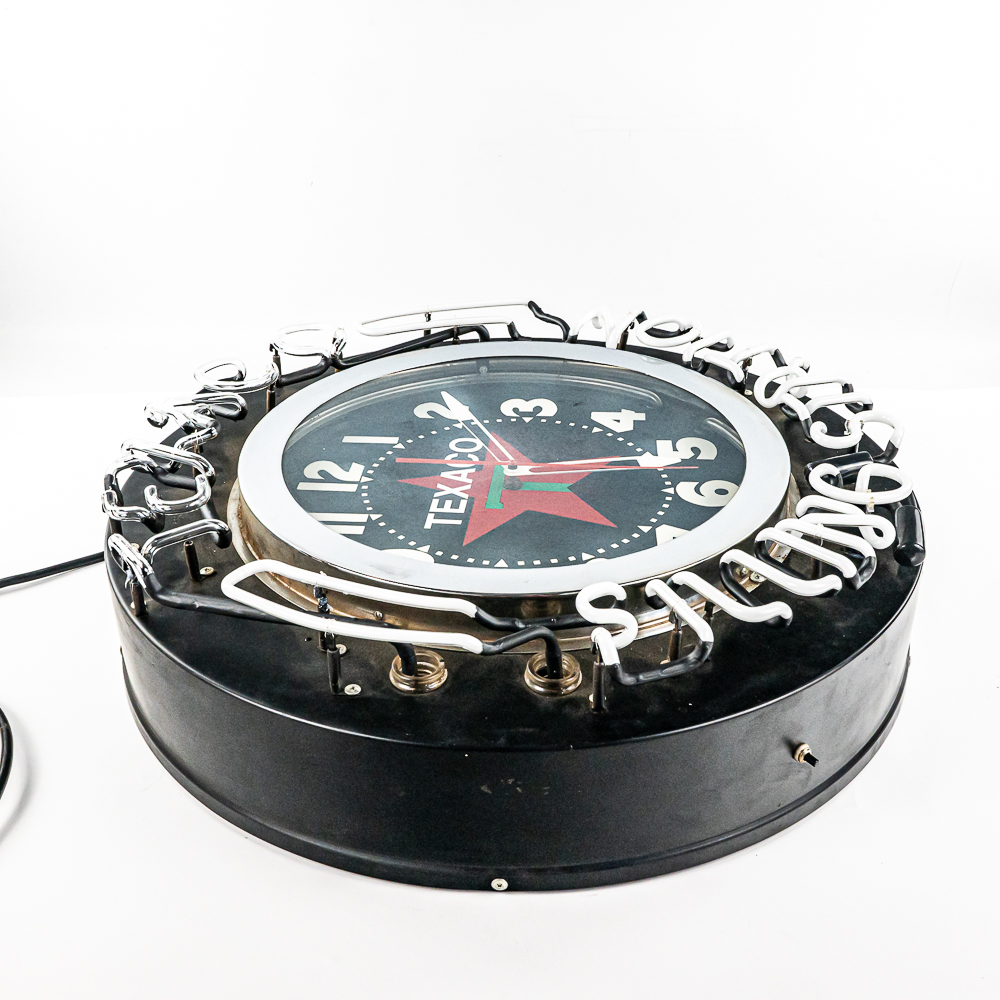 Large 26″ diameter can with an 18″ Texaco clock face ringed in orange neon. Border of can is ringed with external neon reading Texaco Filling Station. A switch on the side of the can turns the neon on and off. In VG condition with all neon perfect. Overall measures 26″ in diameter, 7″ deep. No shipping on this item. Customer pickup or 3rd party transport only.