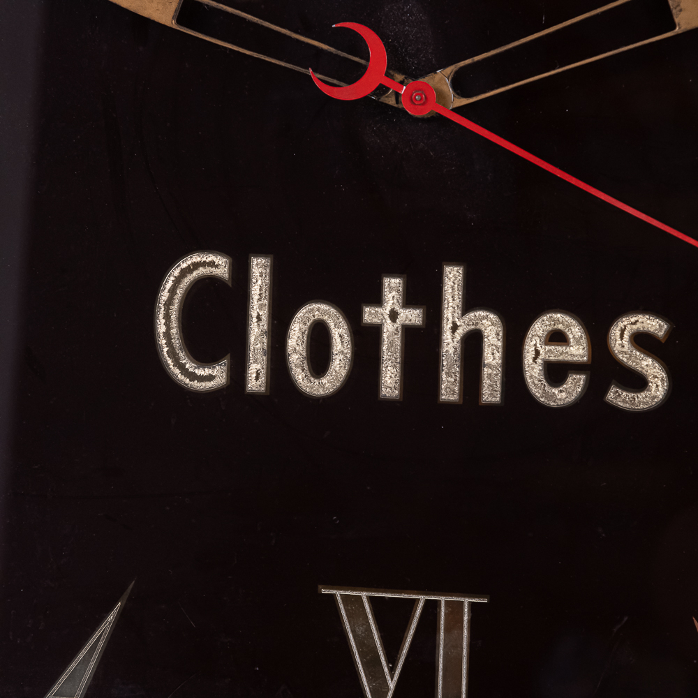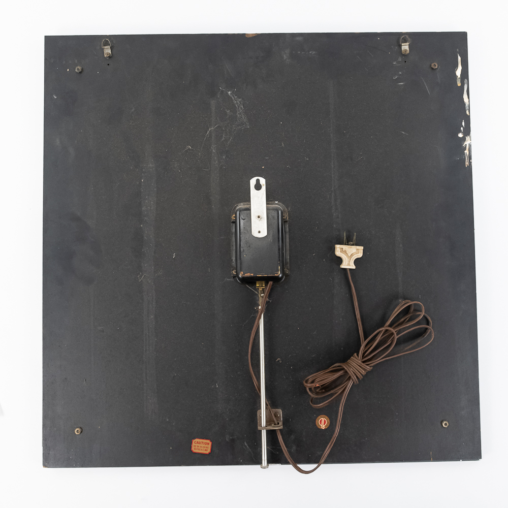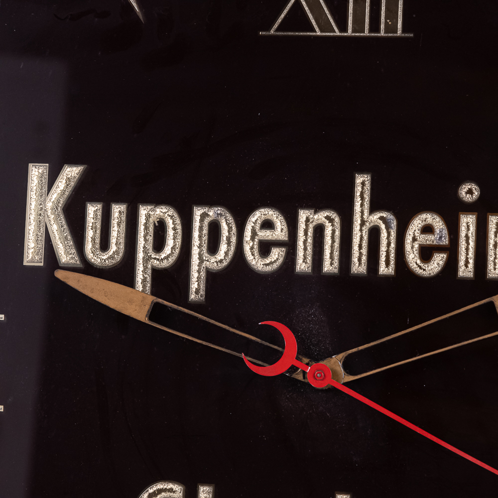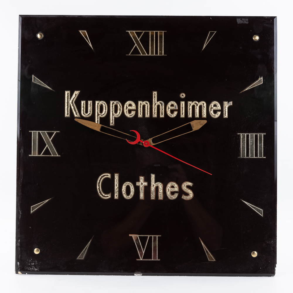 A nice working wall clock advertising Kuppenheimer & Co. Men’s Clothing Store, based in Chicago, IL until 1997 when purchased by Men’s Warehouse. Clock has a nice classic, elegant look. Has a little damage on lower right corner. Works well.