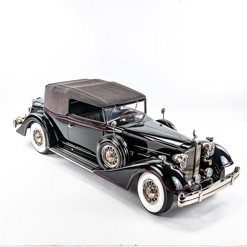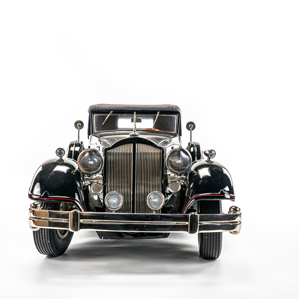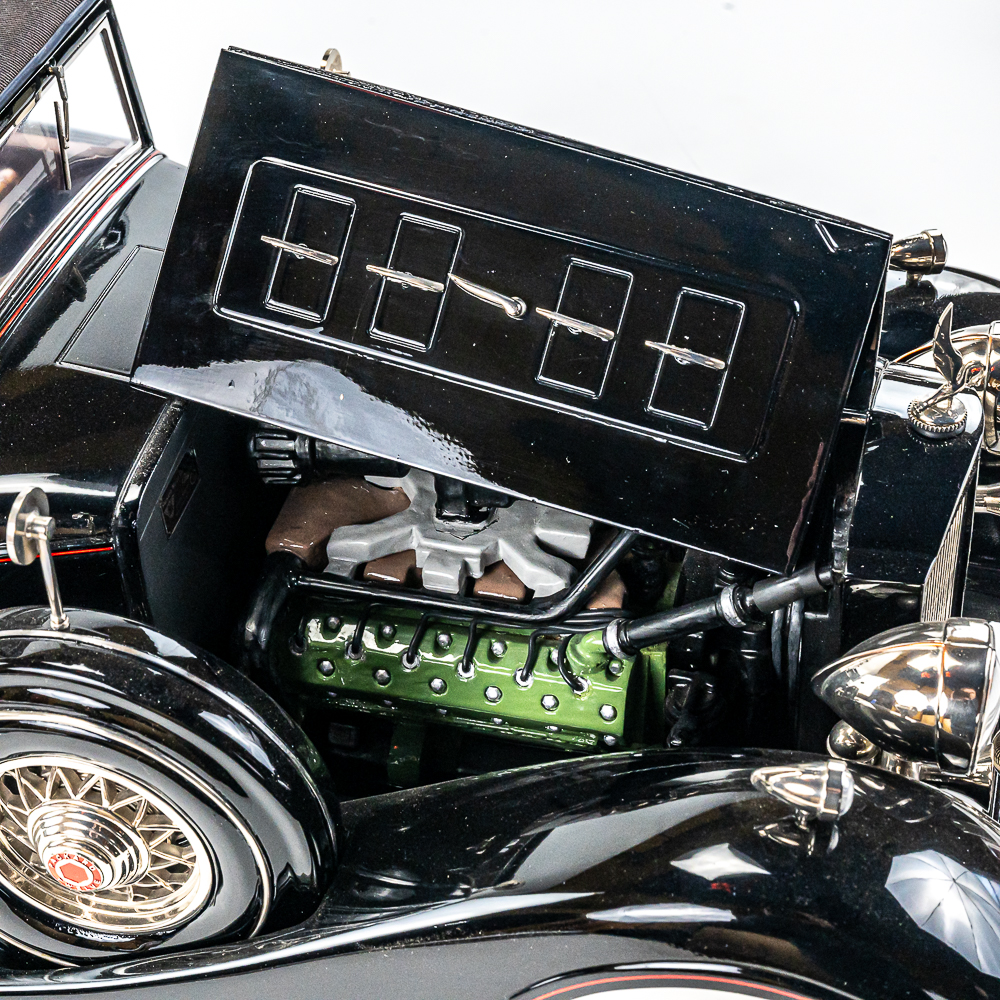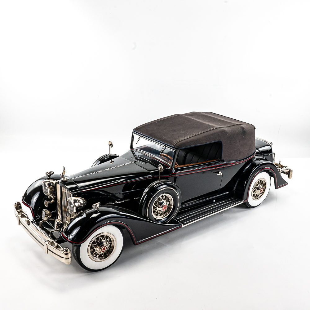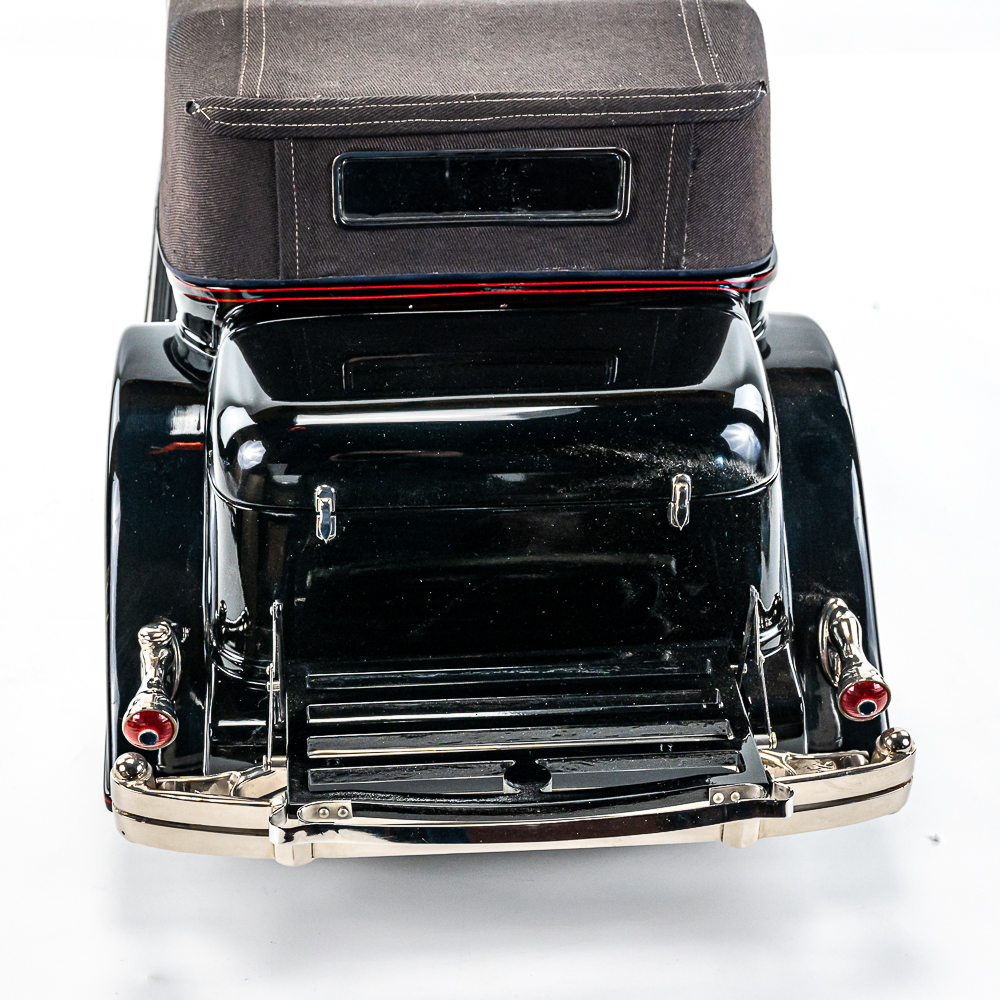 Custom made large scale metal creation manufactured by Retro 1-2-3. Limited production of only 1 piece. 1;6 scale metal model painted in triple black with red pinstriping. This exclusive ONE OF A KIND model was commissioned for the owner of Retro 1-2-3. Added details include removable black canvas hardtop roof with optional black convertible boot. Measures 36″ long, 12″ tall, 11.5″ wide, In excellent condition includes original and inserts.