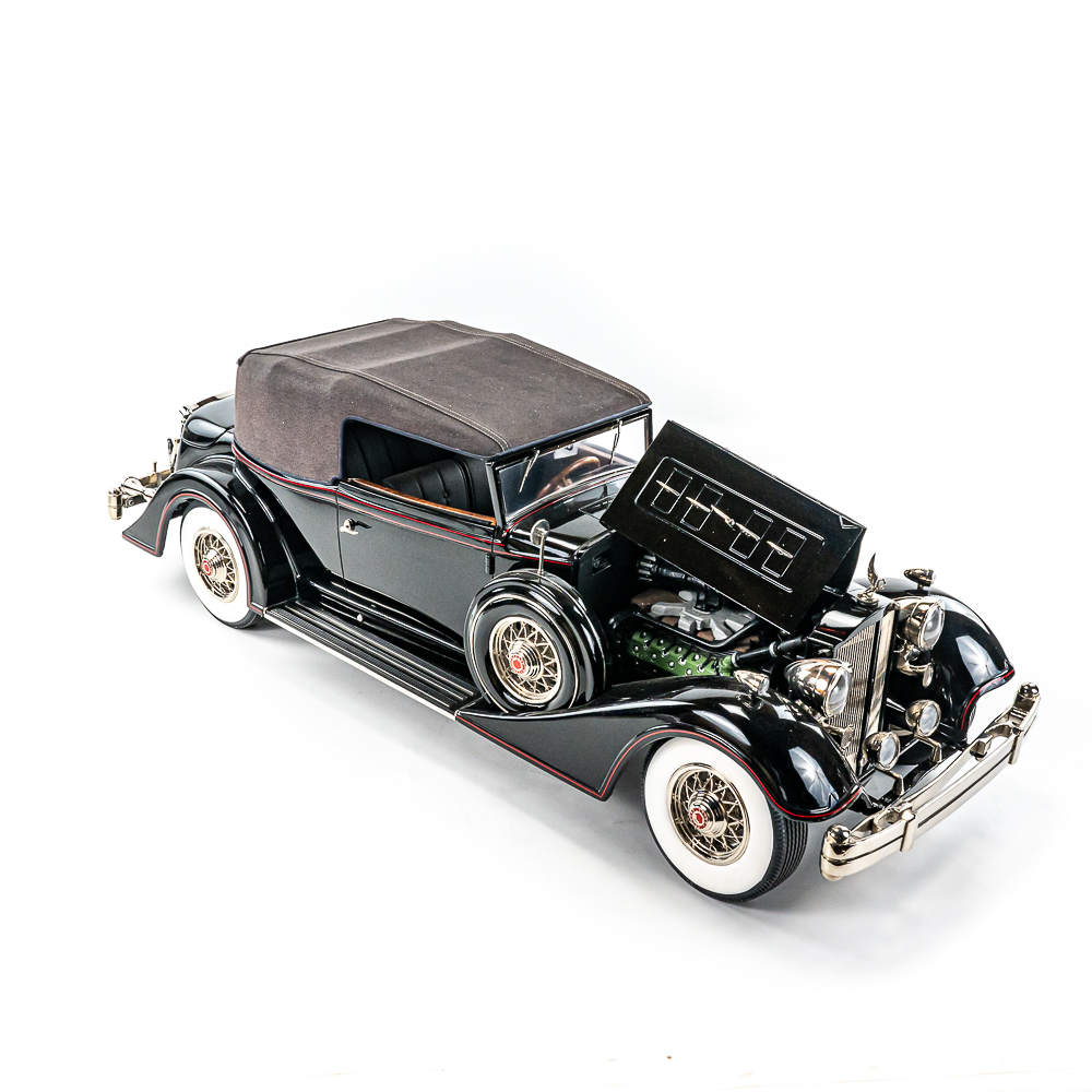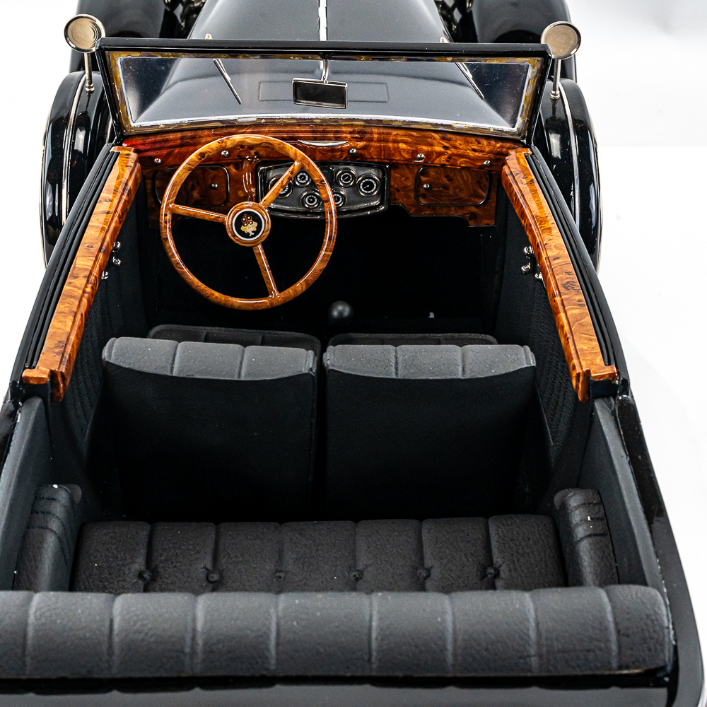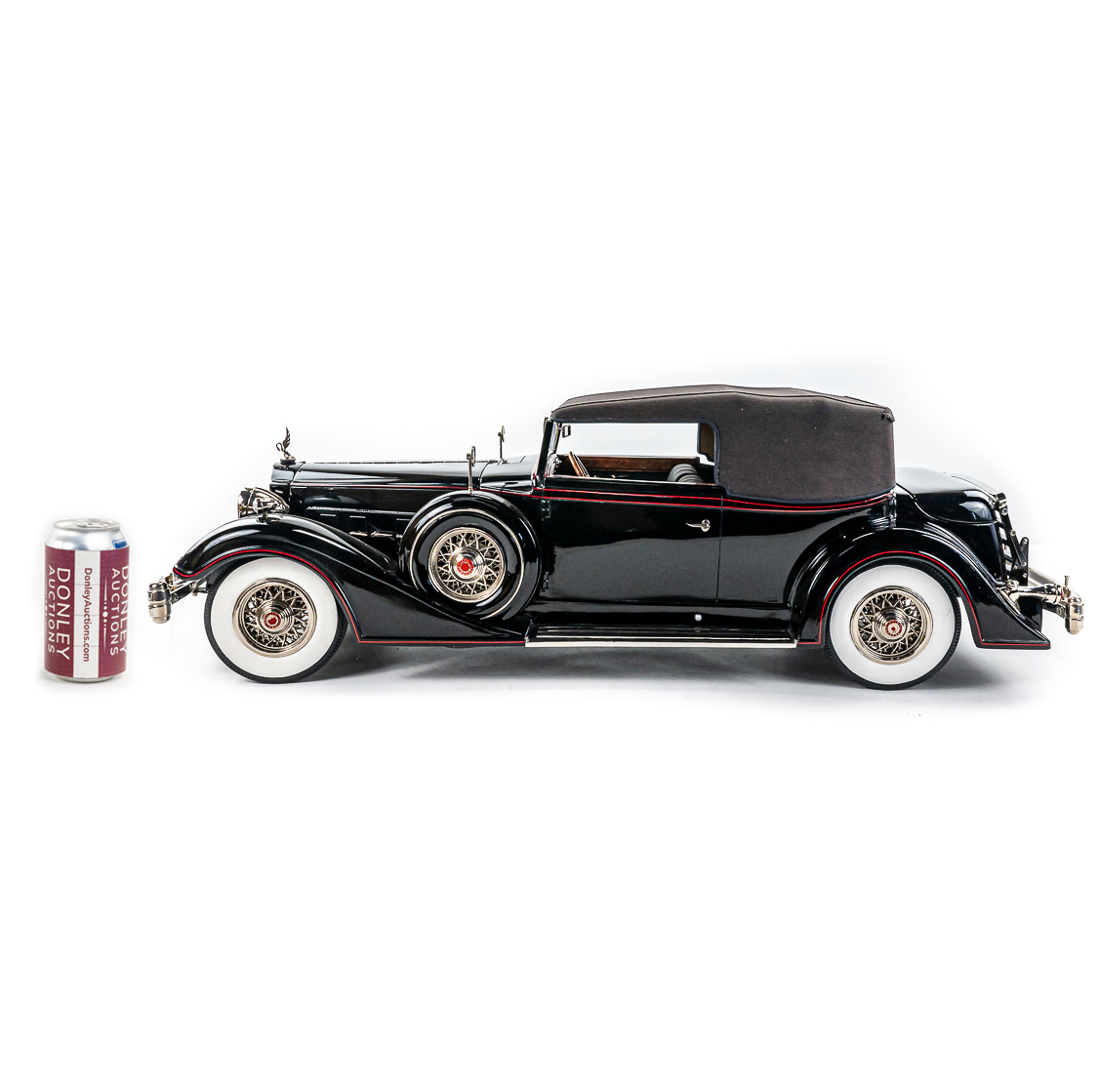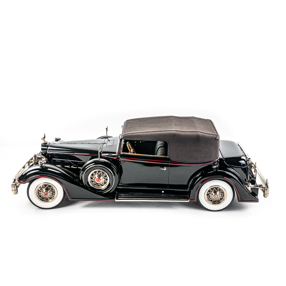 Custom made large scale metal creation manufactured by Retro 1-2-3. Limited production of only 1 piece. 1;6 scale metal model painted in triple black with red pinstriping. This exclusive ONE OF A KIND model was commissioned for the owner of Retro 1-2-3. Added details include removable black canvas hardtop roof with optional black convertible boot. Measures 36″ long, 12″ tall, 11.5″ wide, In excellent condition includes original and inserts.