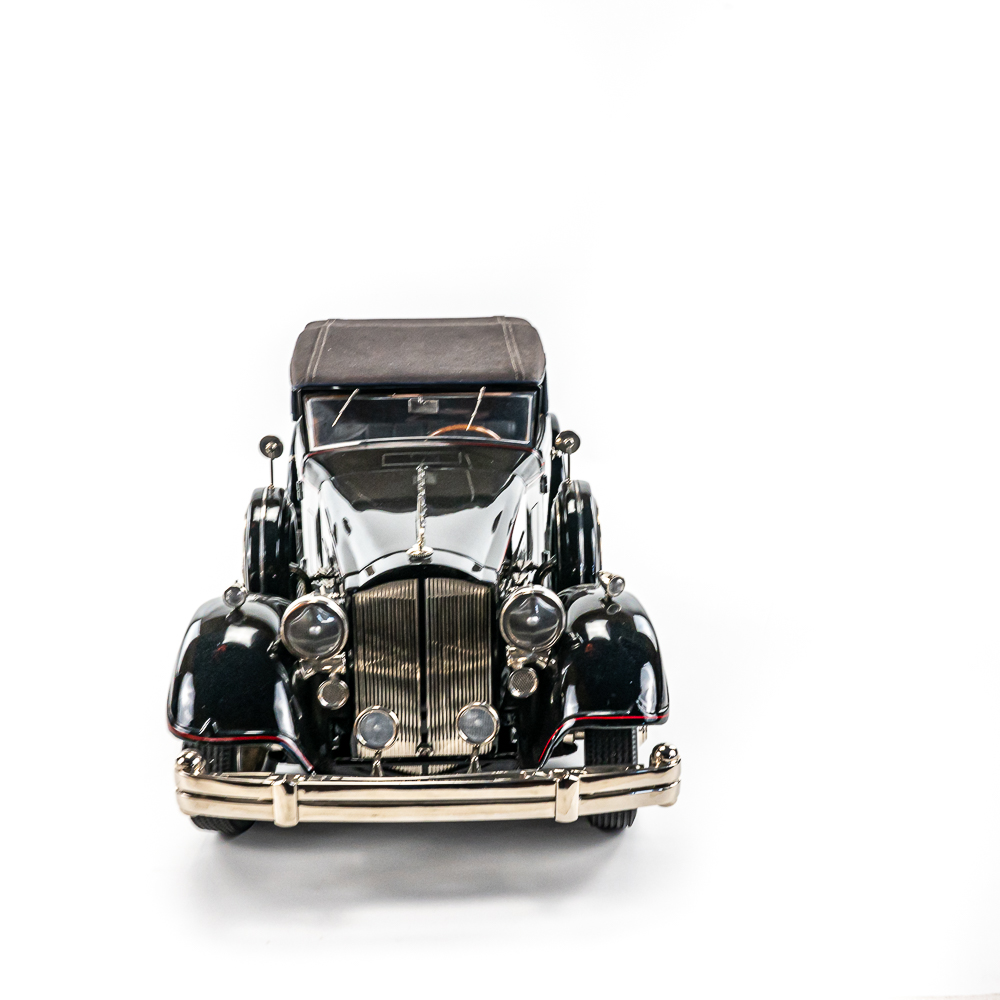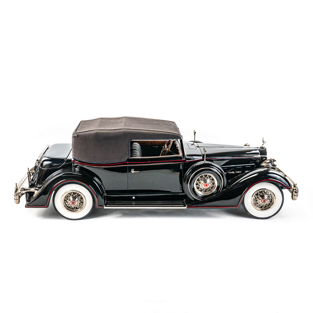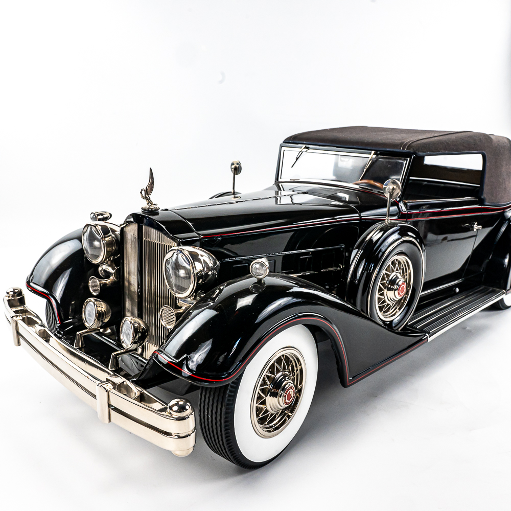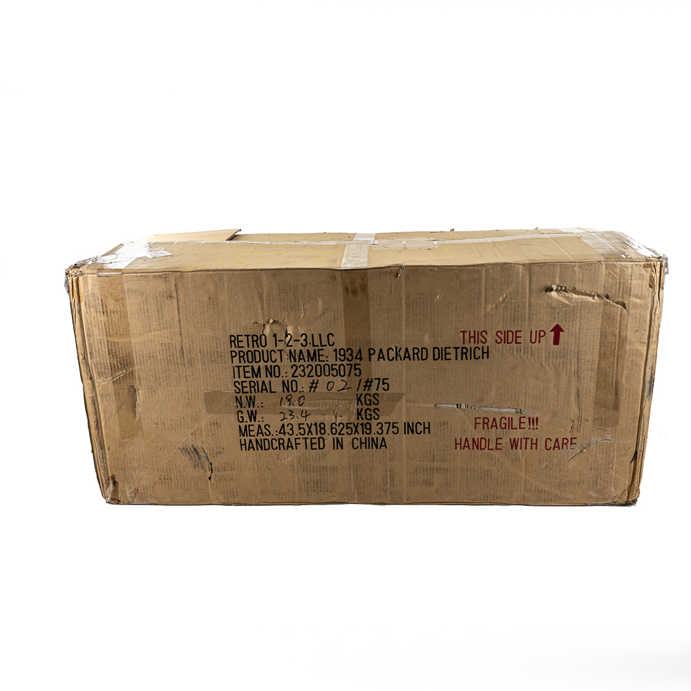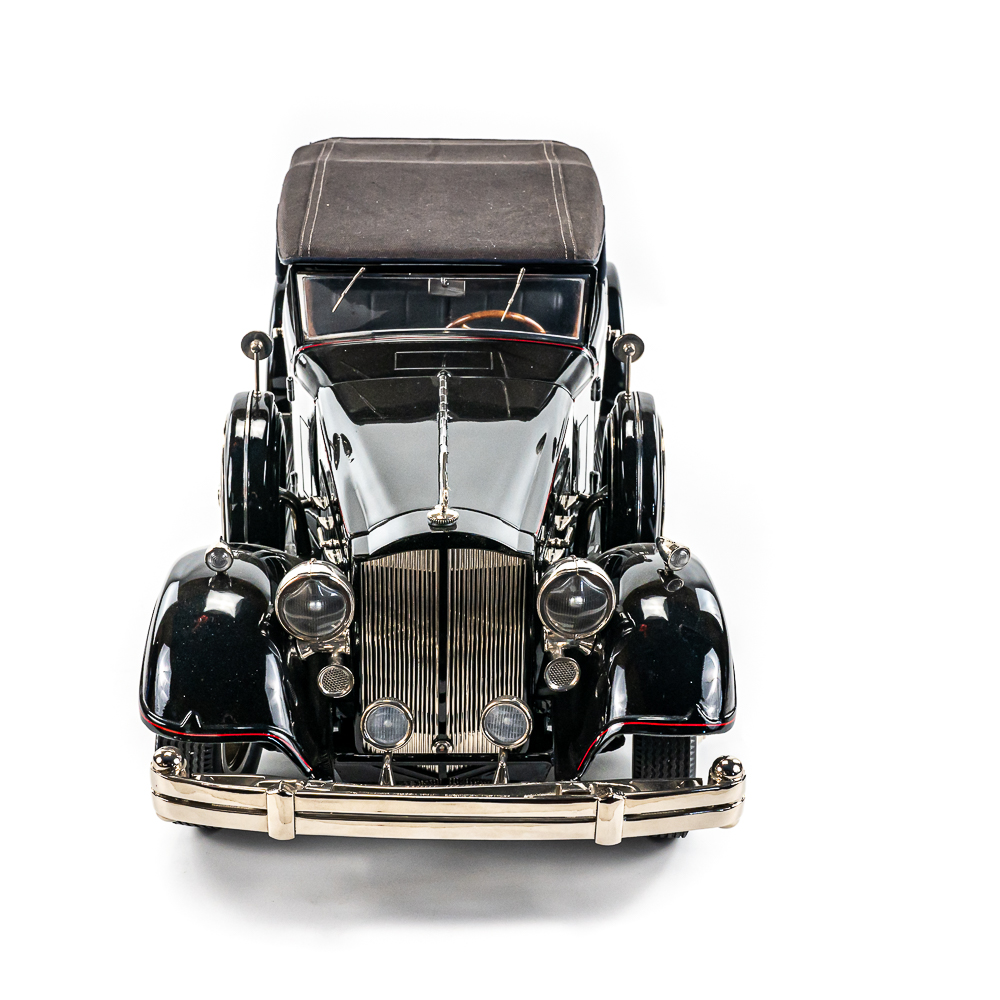 Custom made large scale metal creation manufactured by Retro 1-2-3. Limited production of only 1 piece. 1;6 scale metal model painted in triple black with red pinstriping. This exclusive ONE OF A KIND model was commissioned for the owner of Retro 1-2-3. Added details include removable black canvas hardtop roof with optional black convertible boot. Measures 36″ long, 12″ tall, 11.5″ wide, In excellent condition includes original and inserts.