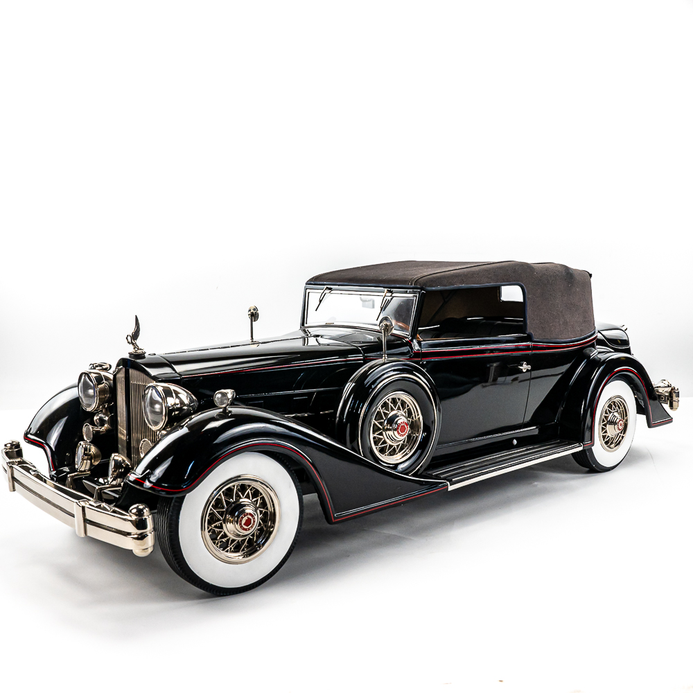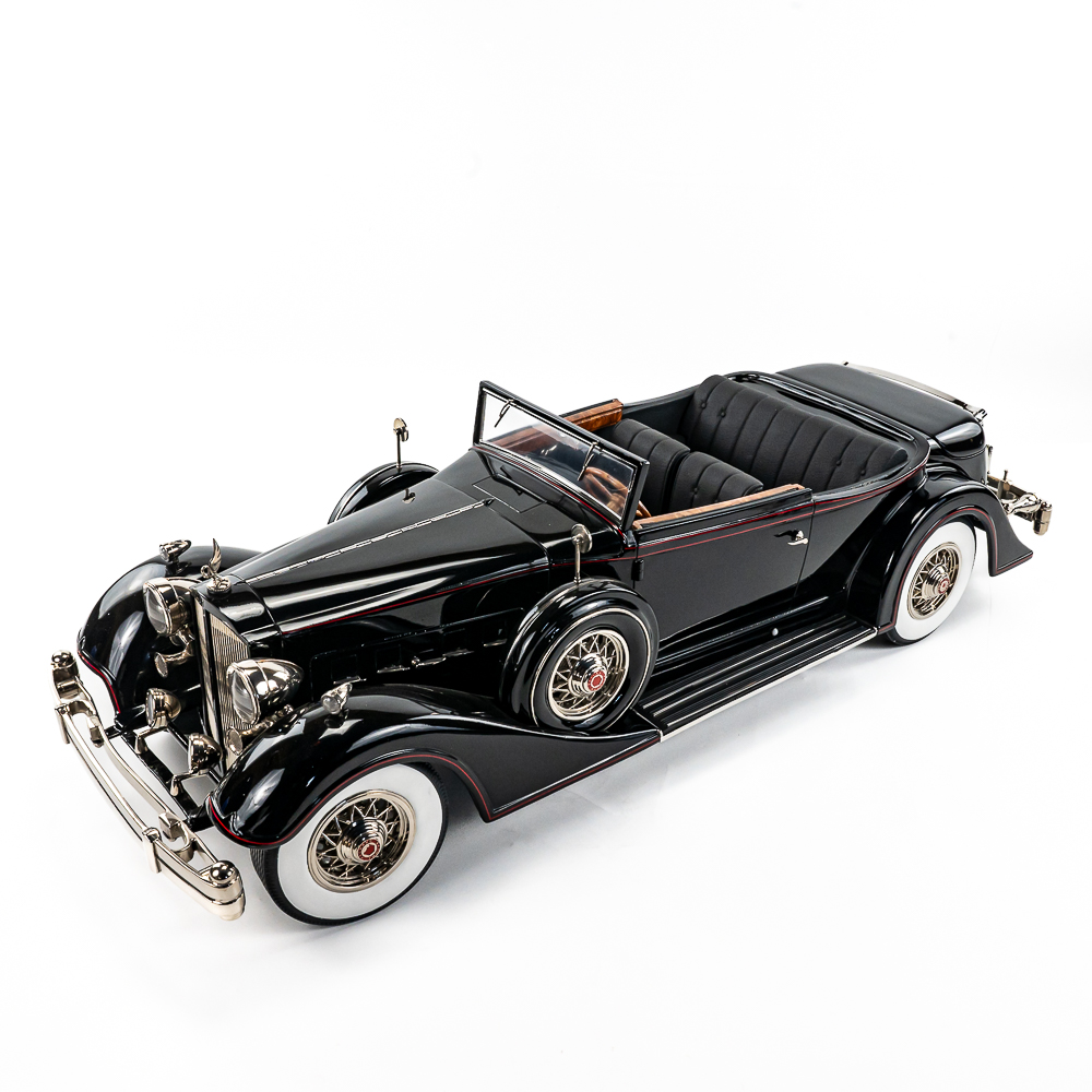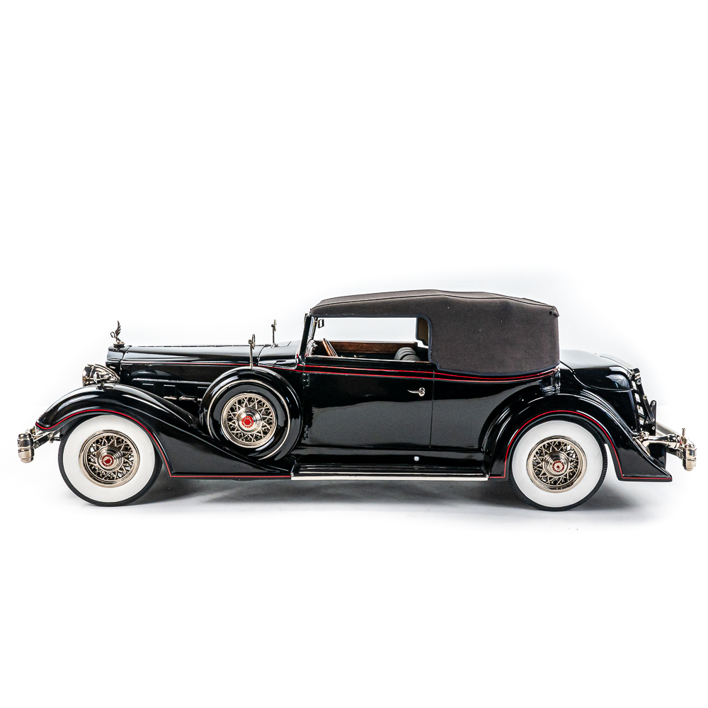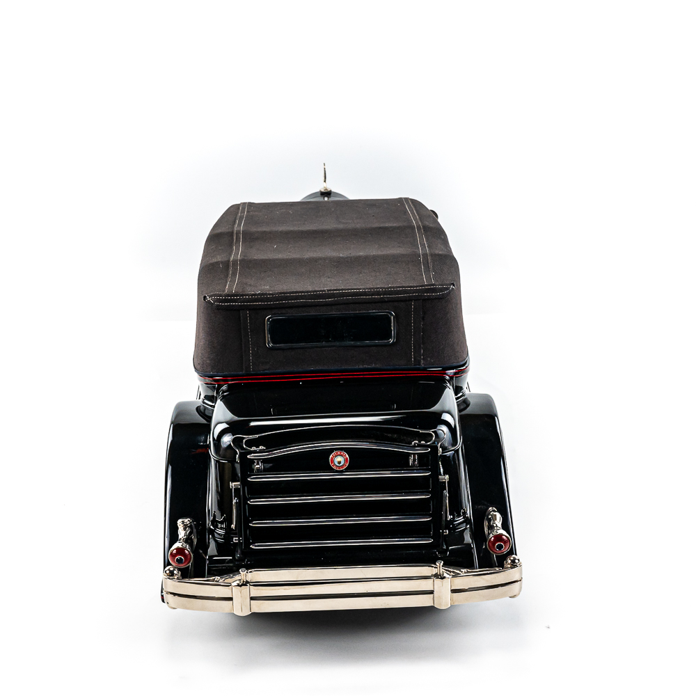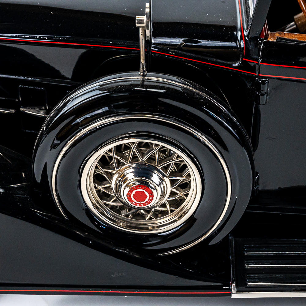 Custom made large scale metal creation manufactured by Retro 1-2-3. Limited production of only 1 piece. 1;6 scale metal model painted in triple black with red pinstriping. This exclusive ONE OF A KIND model was commissioned for the owner of Retro 1-2-3. Added details include removable black canvas hardtop roof with optional black convertible boot. Measures 36″ long, 12″ tall, 11.5″ wide, In excellent condition includes original and inserts.