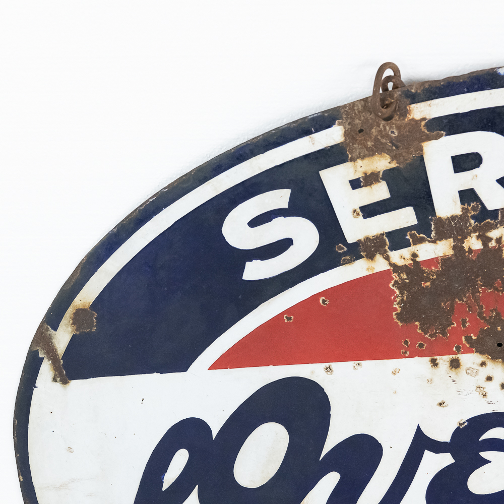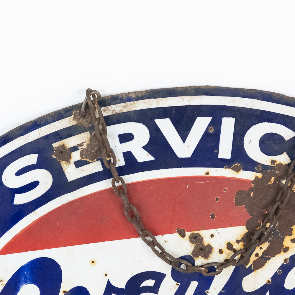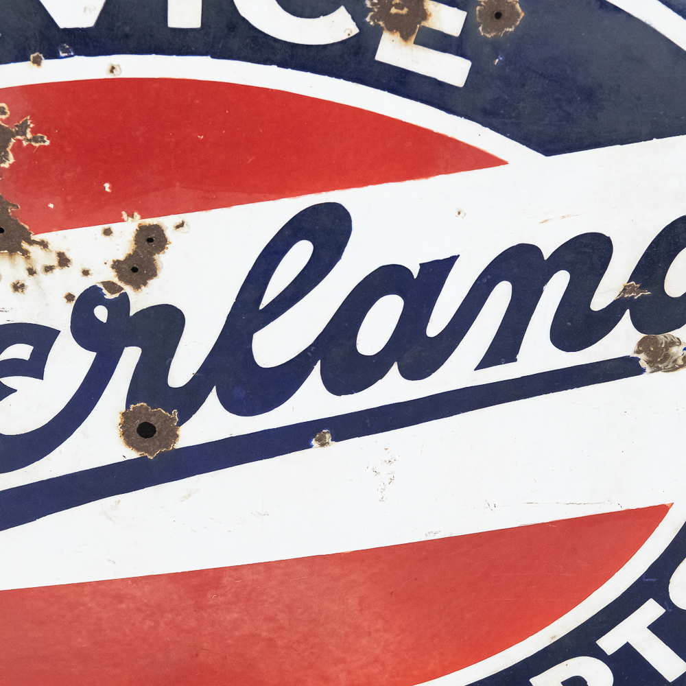 Porcelain 3 color hanging heavy metal sign. Shows some wear with a ripple along lower bottom. A rare sign in fair condition. Some rust spots throughout on both sides40″ wide x 30″ high