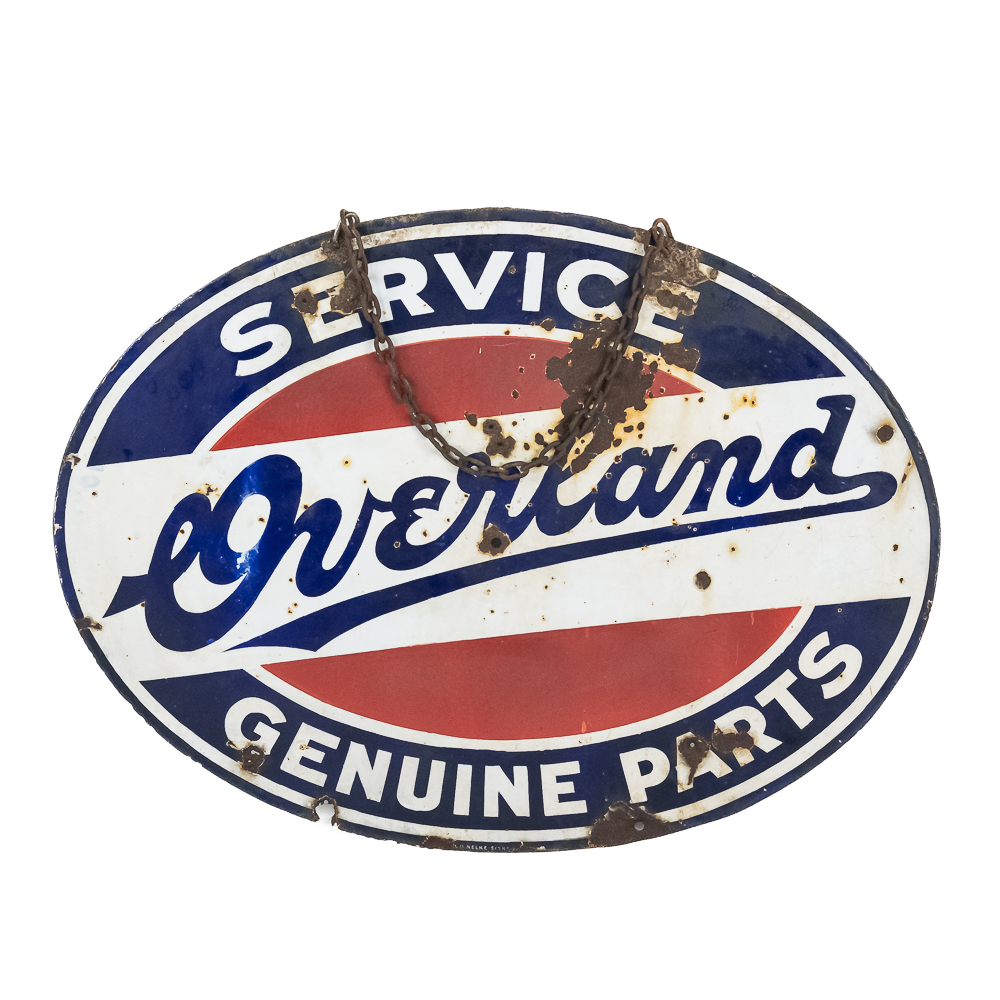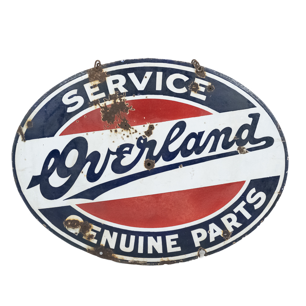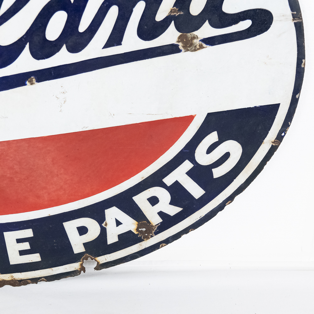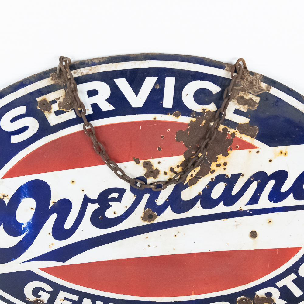 Porcelain 3 color hanging heavy metal sign. Shows some wear with a ripple along lower bottom. A rare sign in fair condition. Some rust spots throughout on both sides40″ wide x 30″ high