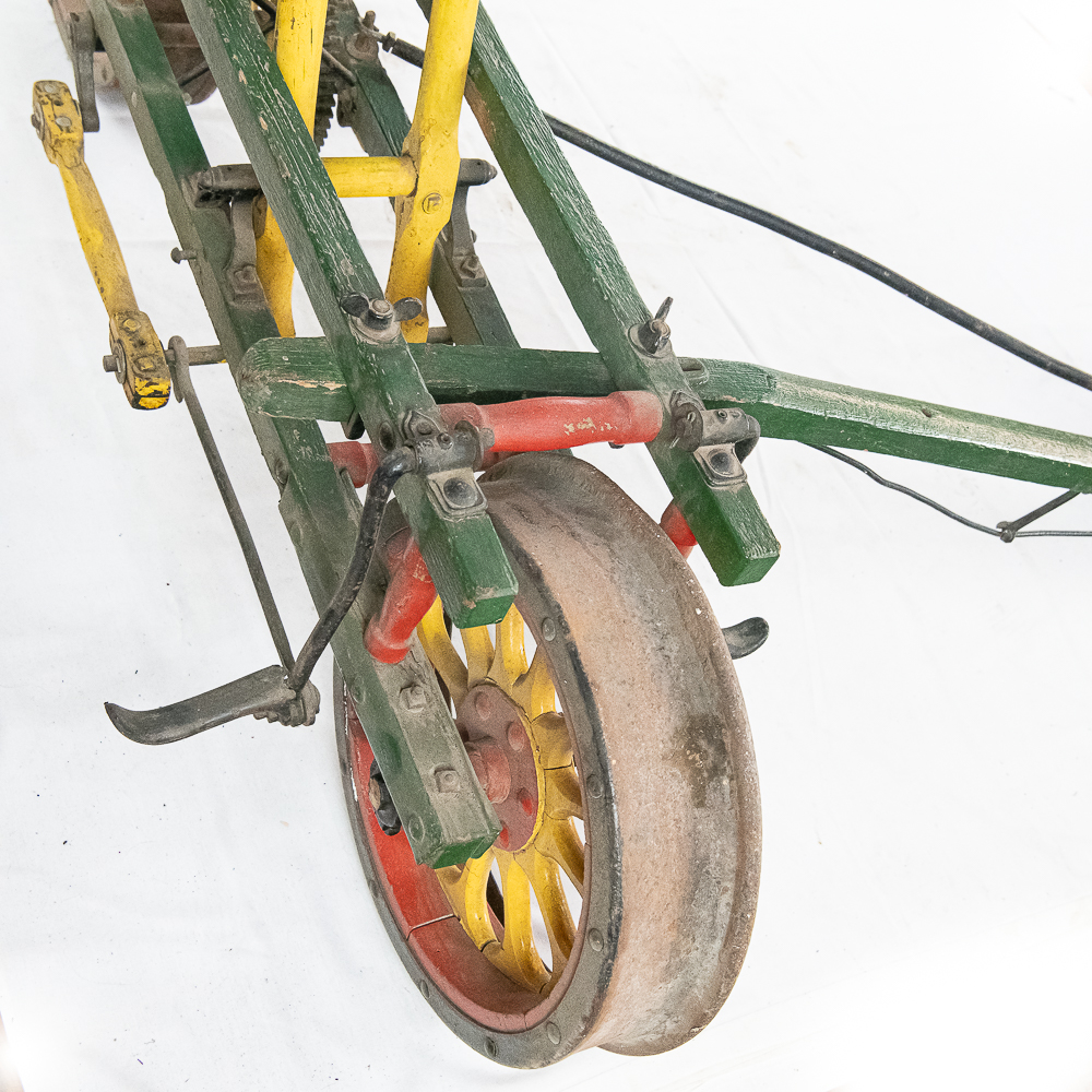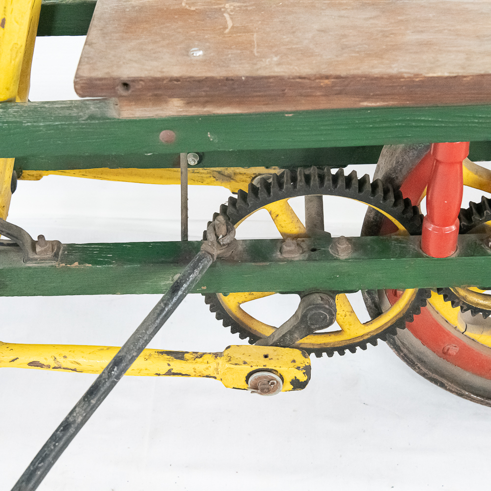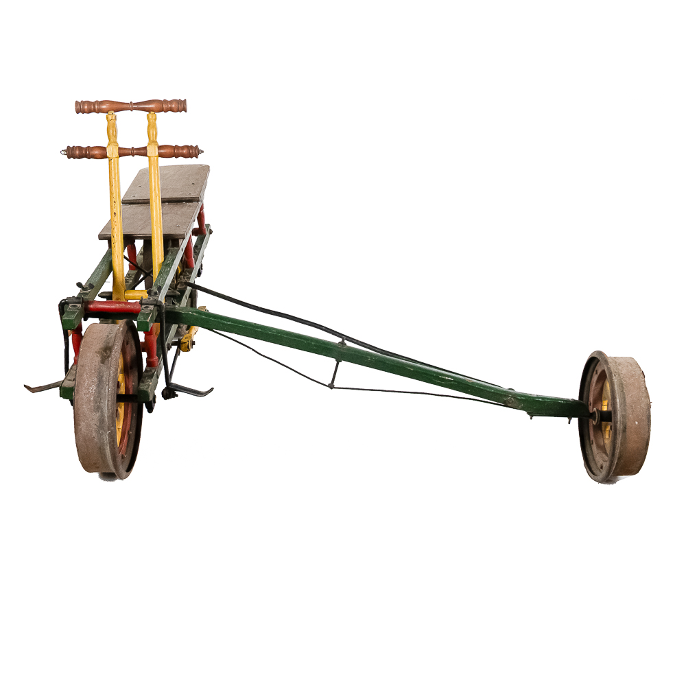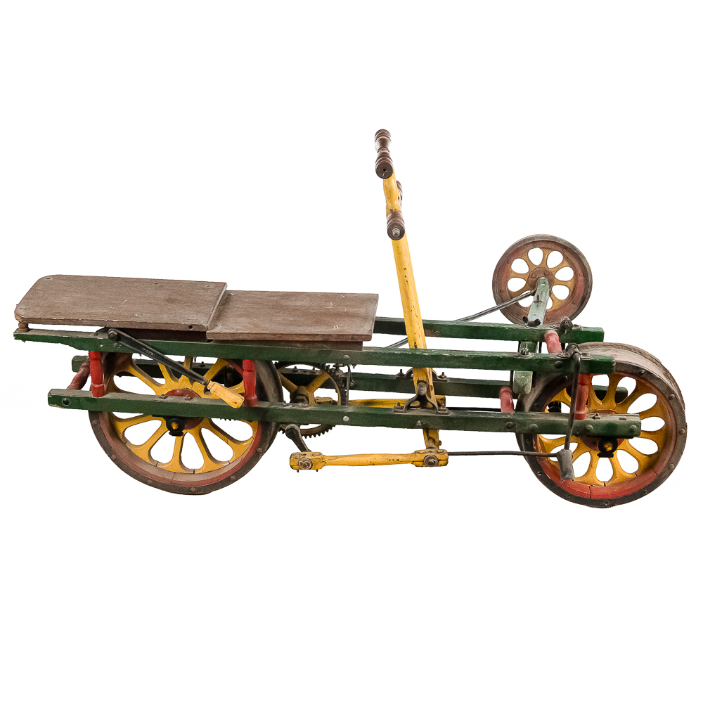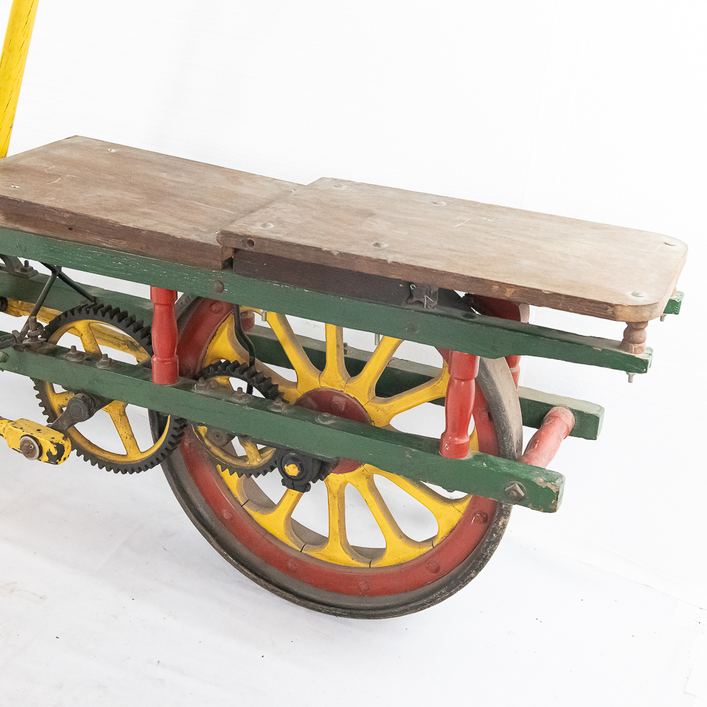 The Sheffield Velocipede Car Company of Three Rivers, Michigan had its beginnings about 1877, when George S. Sheffield invented a three-wheeled railroad hand-car propelled by a combination of hand and foot power used in a push-pull fashion. At about 140 lbs., it was light enough to be swung off the tracks to make way for trains, and made an excellent track inspection car. The operator sits in the seat with the front and rear wheel on one rail with a wood outrigger and wheel resting on the opposite rail for stability. Wood body, steel wheels, cranks, and gears. In VG original condition with nice original paint. A real museum piece that is still fully operational. Overall measures 6′ wide with the outrigger extended, 6′ long, and about 40″ tall.