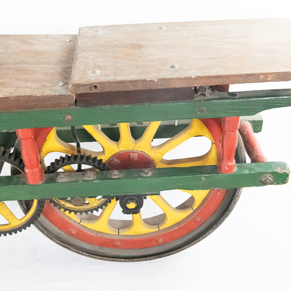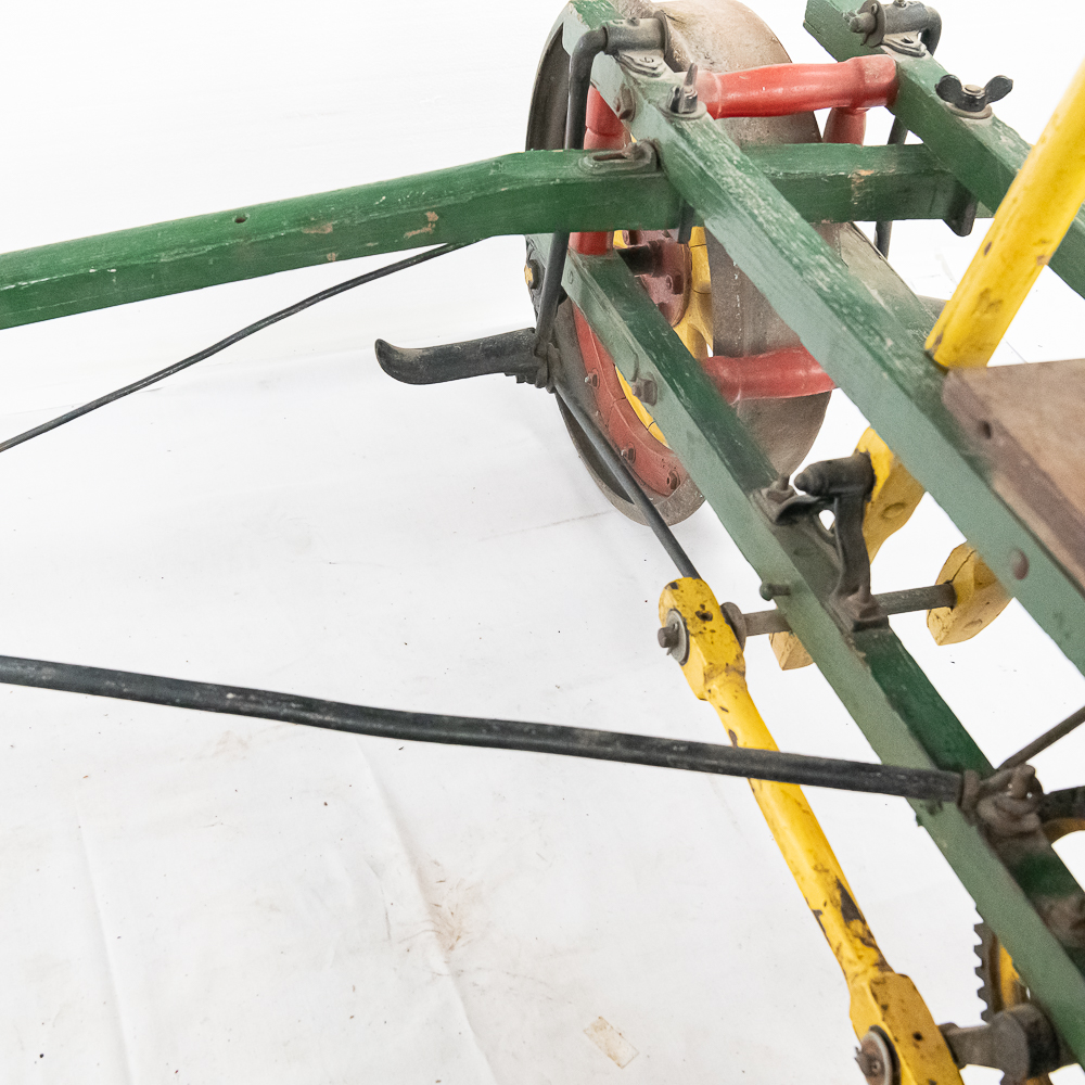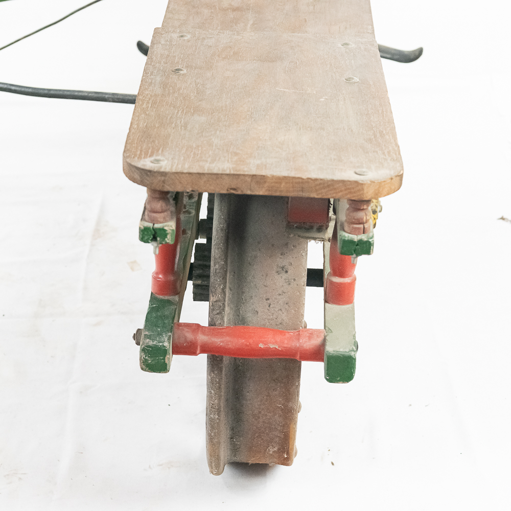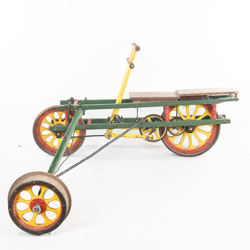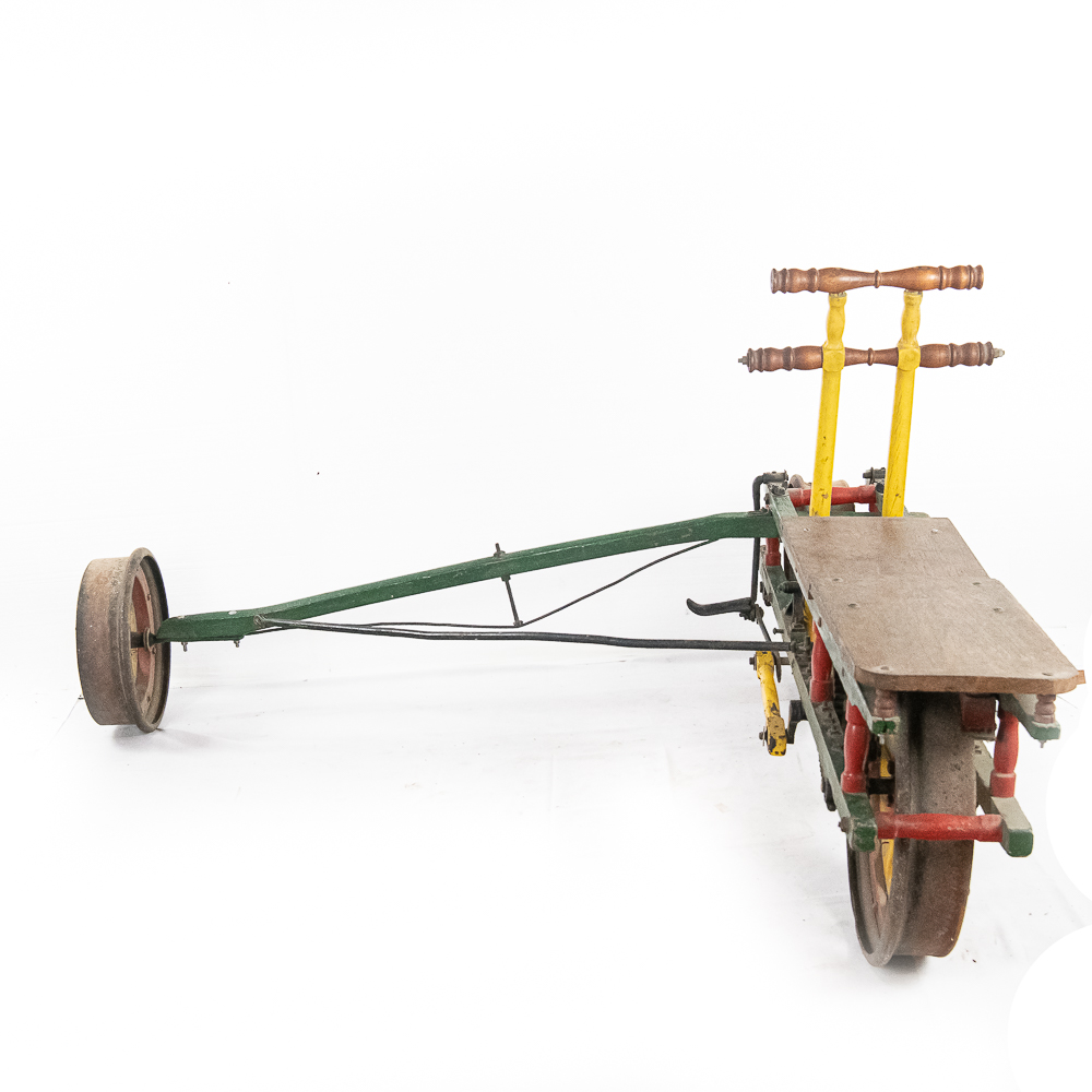 The Sheffield Velocipede Car Company of Three Rivers, Michigan had its beginnings about 1877, when George S. Sheffield invented a three-wheeled railroad hand-car propelled by a combination of hand and foot power used in a push-pull fashion. At about 140 lbs., it was light enough to be swung off the tracks to make way for trains, and made an excellent track inspection car. The operator sits in the seat with the front and rear wheel on one rail with a wood outrigger and wheel resting on the opposite rail for stability. Wood body, steel wheels, cranks, and gears. In VG original condition with nice original paint. A real museum piece that is still fully operational. Overall measures 6′ wide with the outrigger extended, 6′ long, and about 40″ tall.