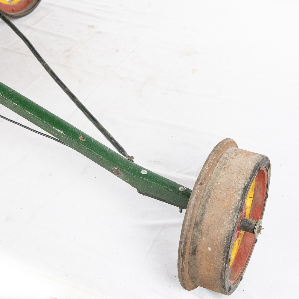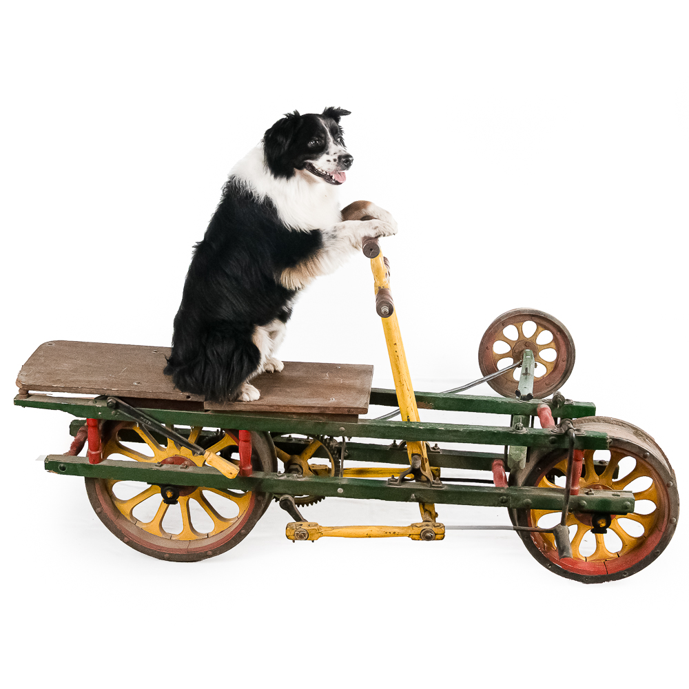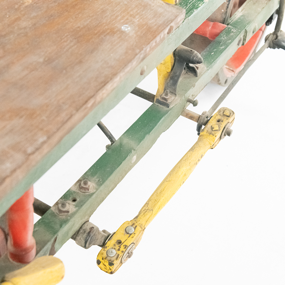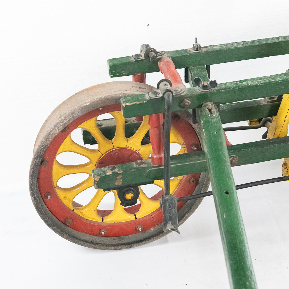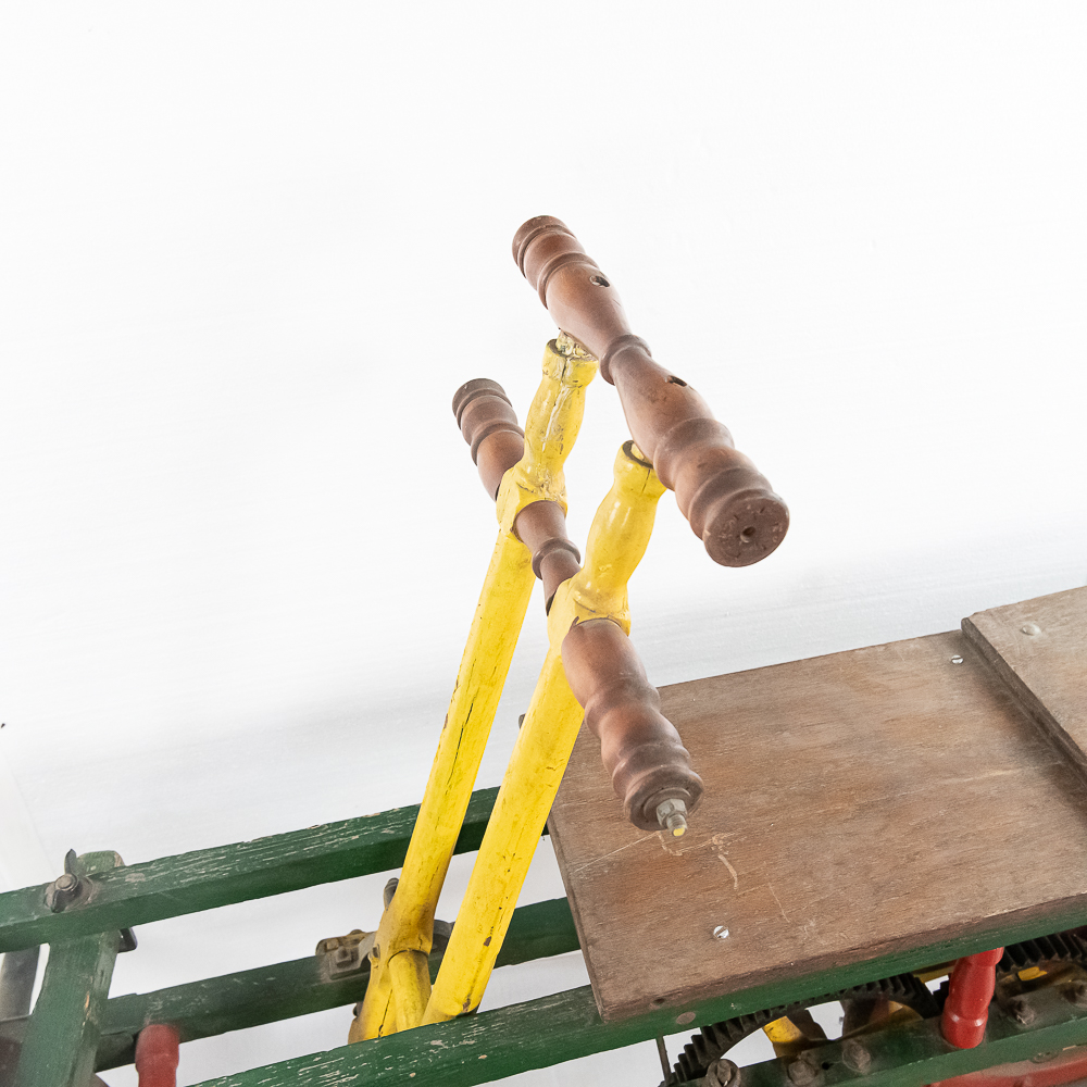 The Sheffield Velocipede Car Company of Three Rivers, Michigan had its beginnings about 1877, when George S. Sheffield invented a three-wheeled railroad hand-car propelled by a combination of hand and foot power used in a push-pull fashion. At about 140 lbs., it was light enough to be swung off the tracks to make way for trains, and made an excellent track inspection car. The operator sits in the seat with the front and rear wheel on one rail with a wood outrigger and wheel resting on the opposite rail for stability. Wood body, steel wheels, cranks, and gears. In VG original condition with nice original paint. A real museum piece that is still fully operational. Overall measures 6′ wide with the outrigger extended, 6′ long, and about 40″ tall.