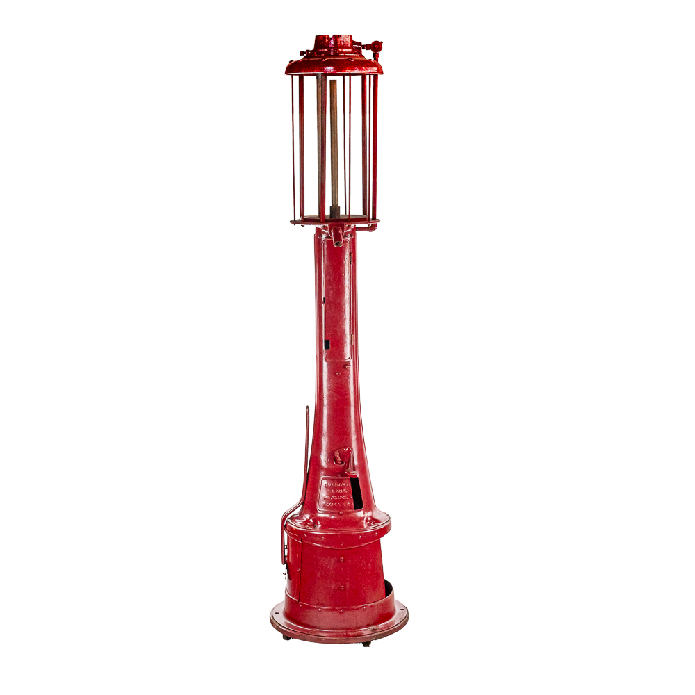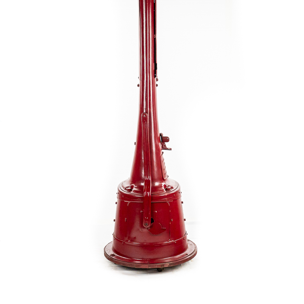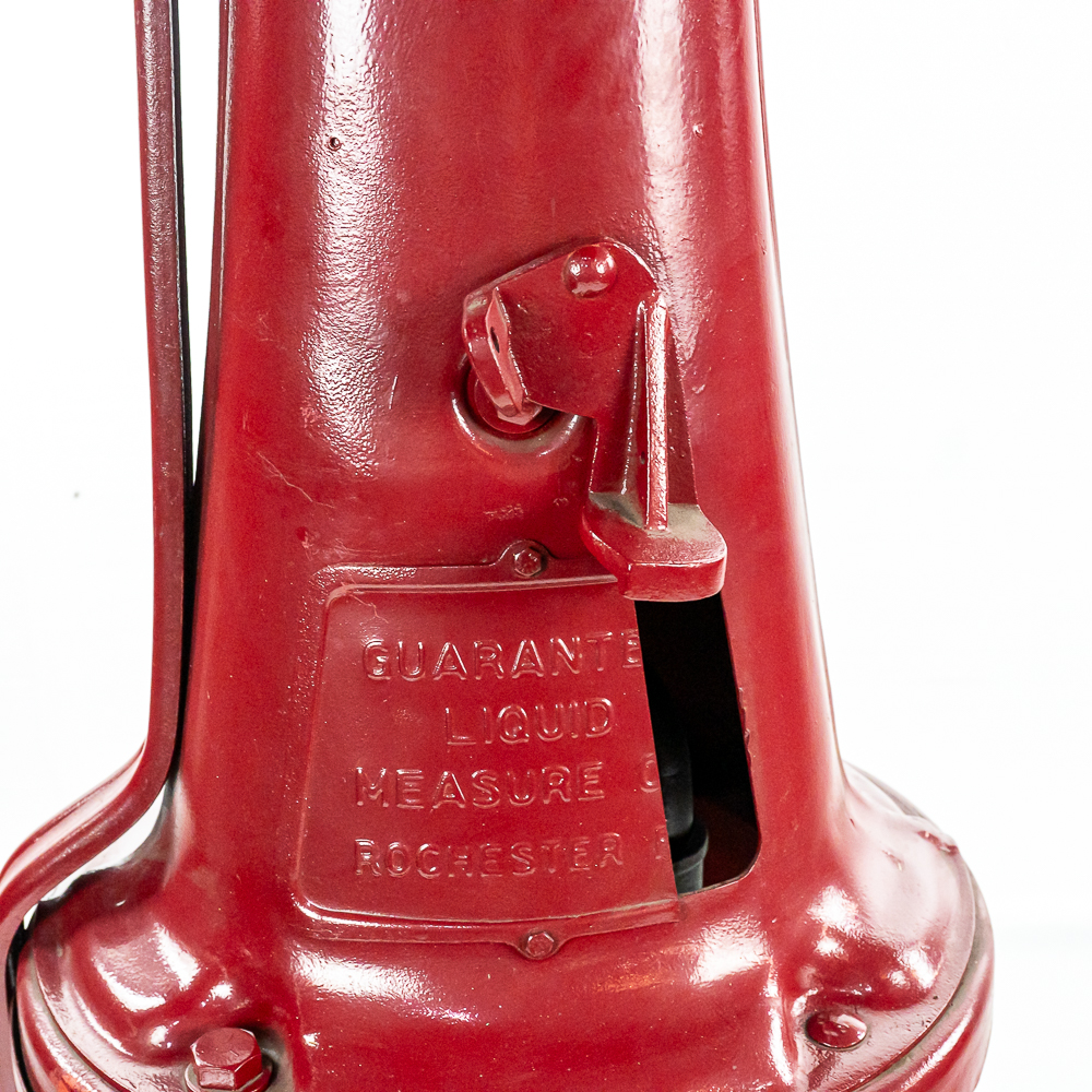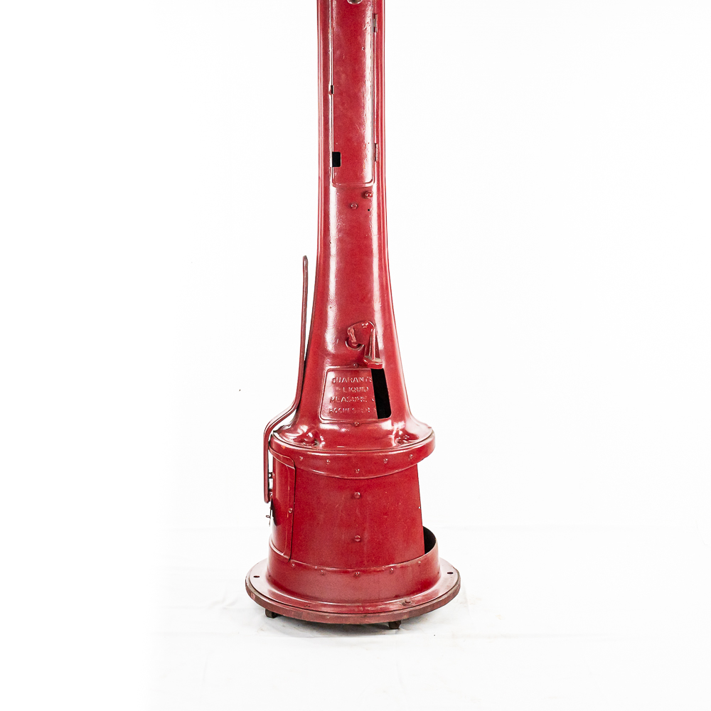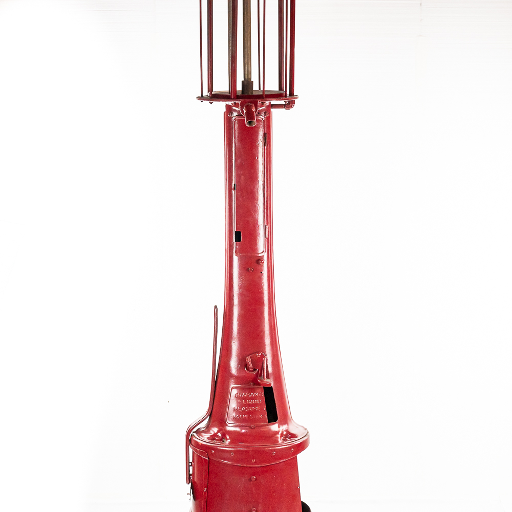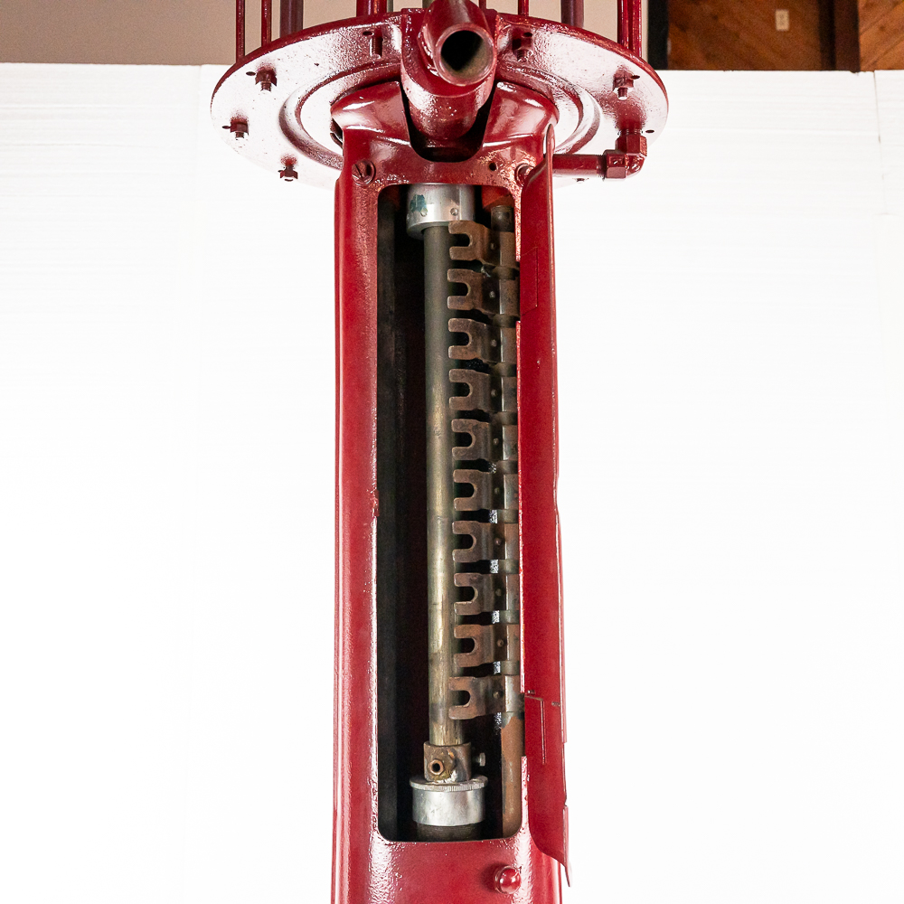 Restoration was started but the owner never got a chance to finish. It is missing the glass cylinder, the hose, nozzle, a sheet metal cover on the bottom,and the lug where the pump handle attaches. The paint is OK but not show quality. A great candidate fro restoration or foran outdoor sign. Measures 9′ tall.