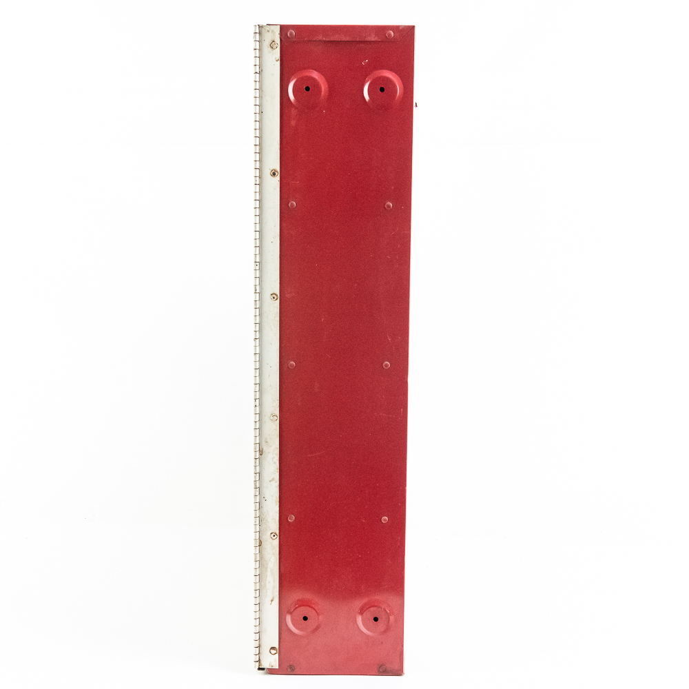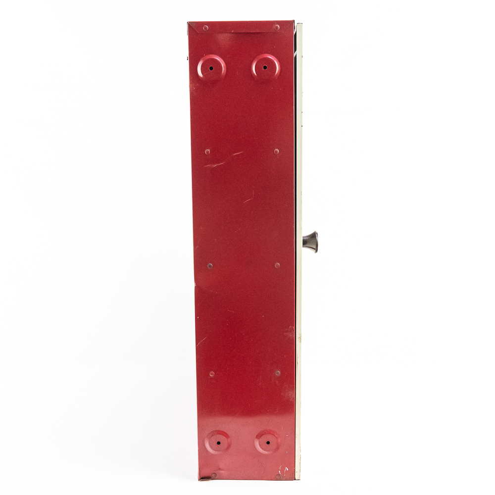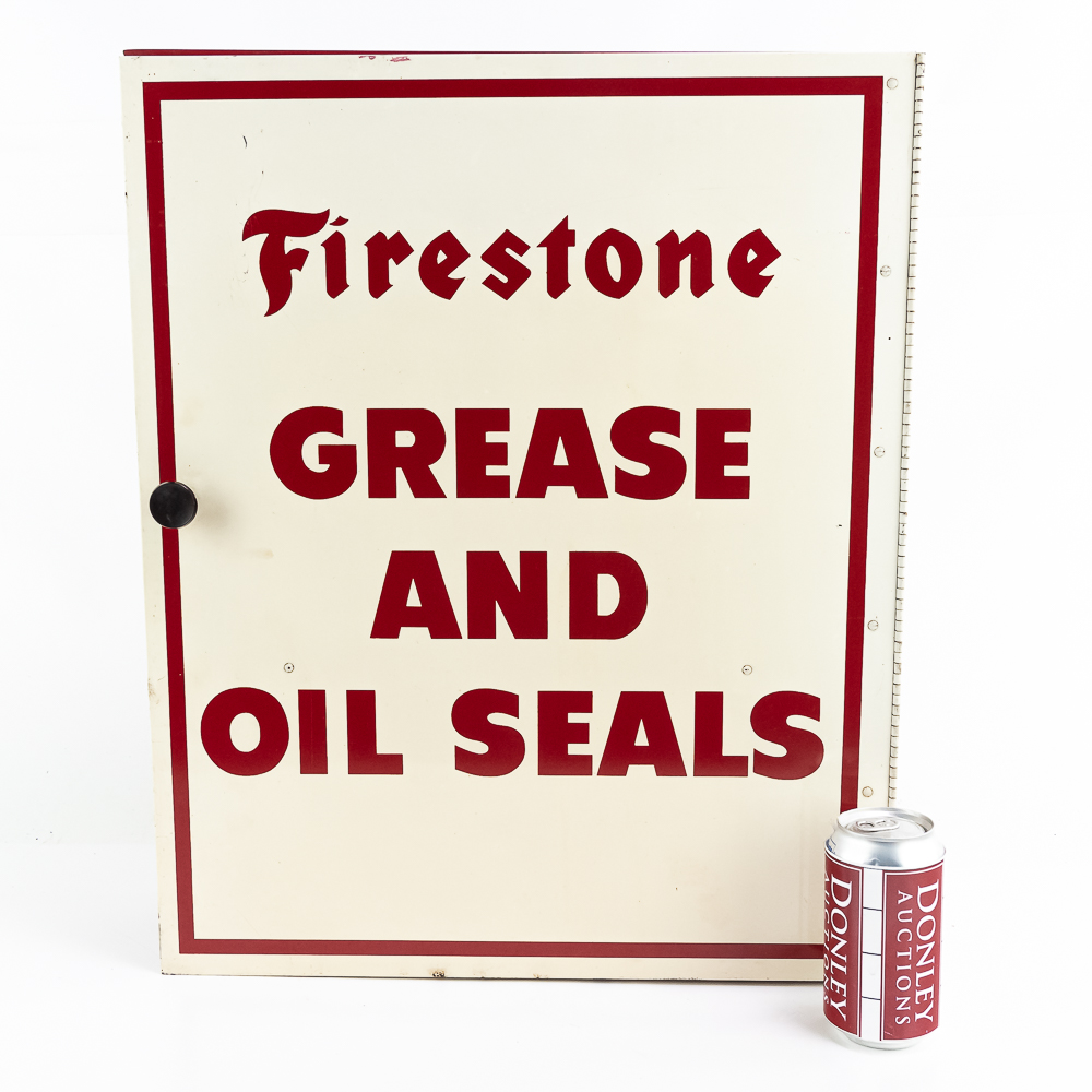 Painted metal wall cabinet for Firestone Oil & Grease Seals. In VG condition. has 3 shelves behind door. Measures 21.5″ tall, 17.5″ wide, 5″ deep.