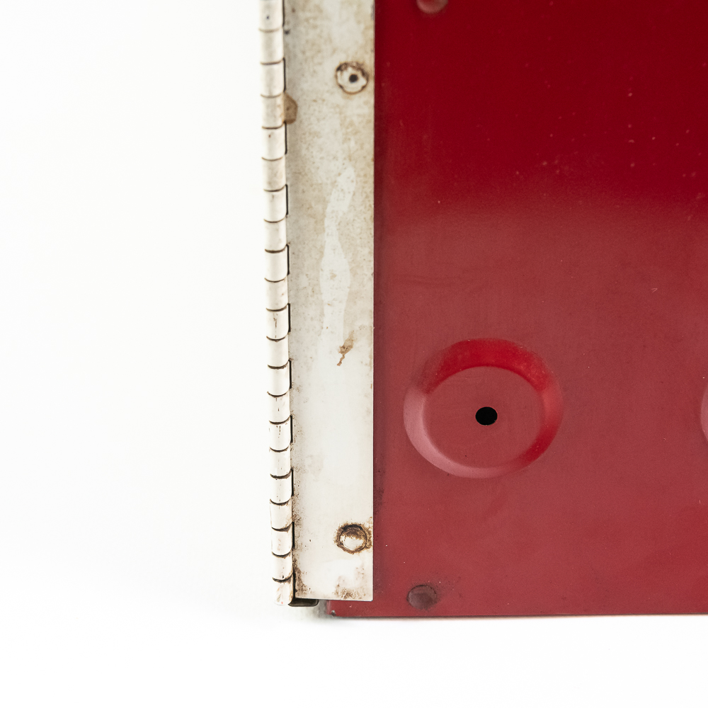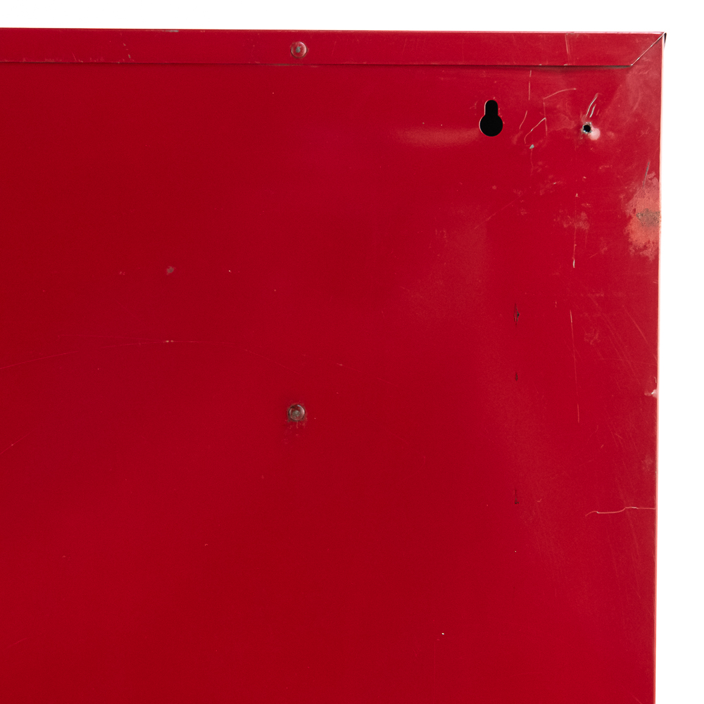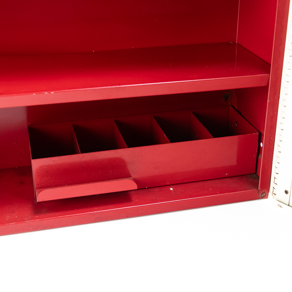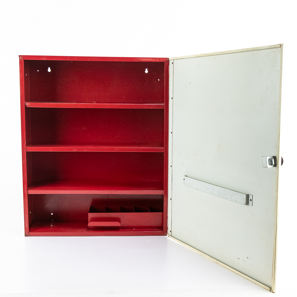 Painted metal wall cabinet for Firestone Oil & Grease Seals. In VG condition. has 3 shelves behind door. Measures 21.5″ tall, 17.5″ wide, 5″ deep.