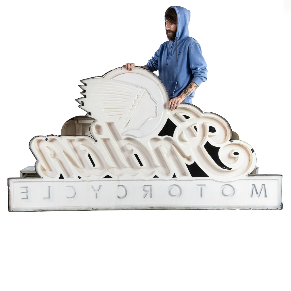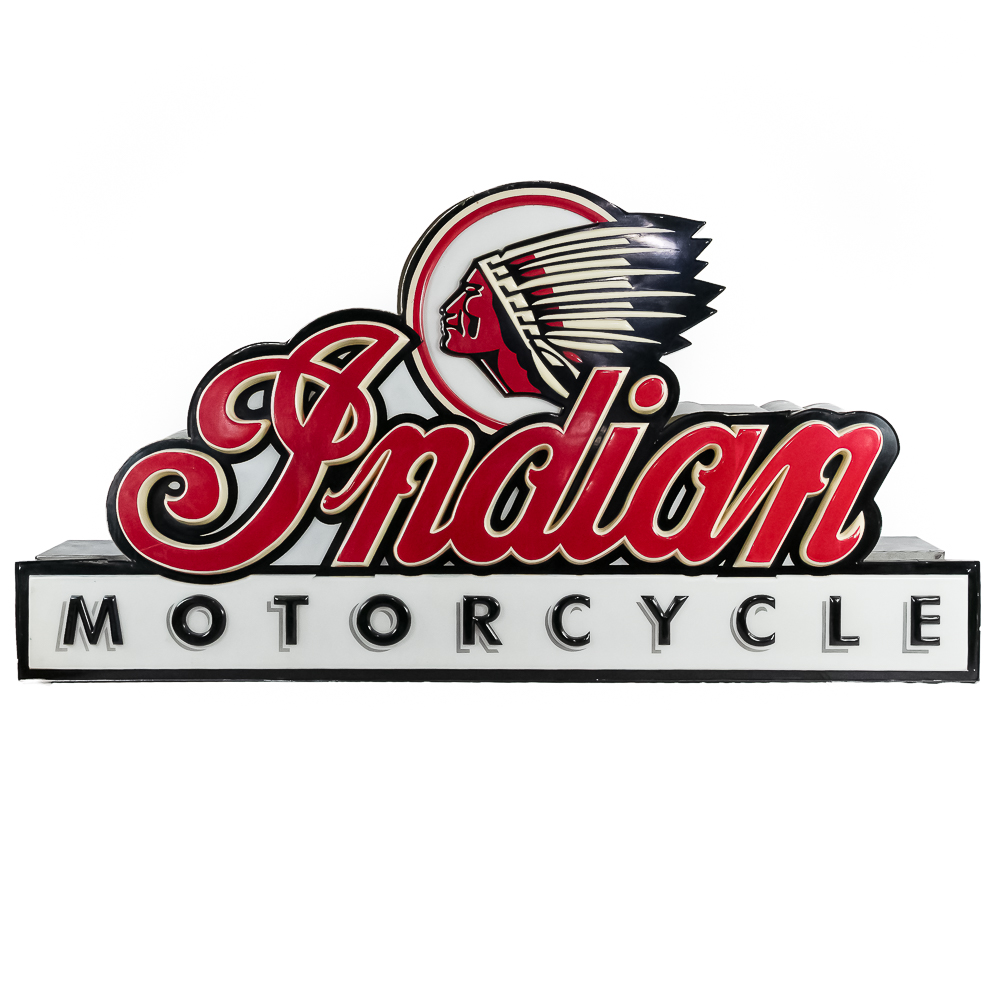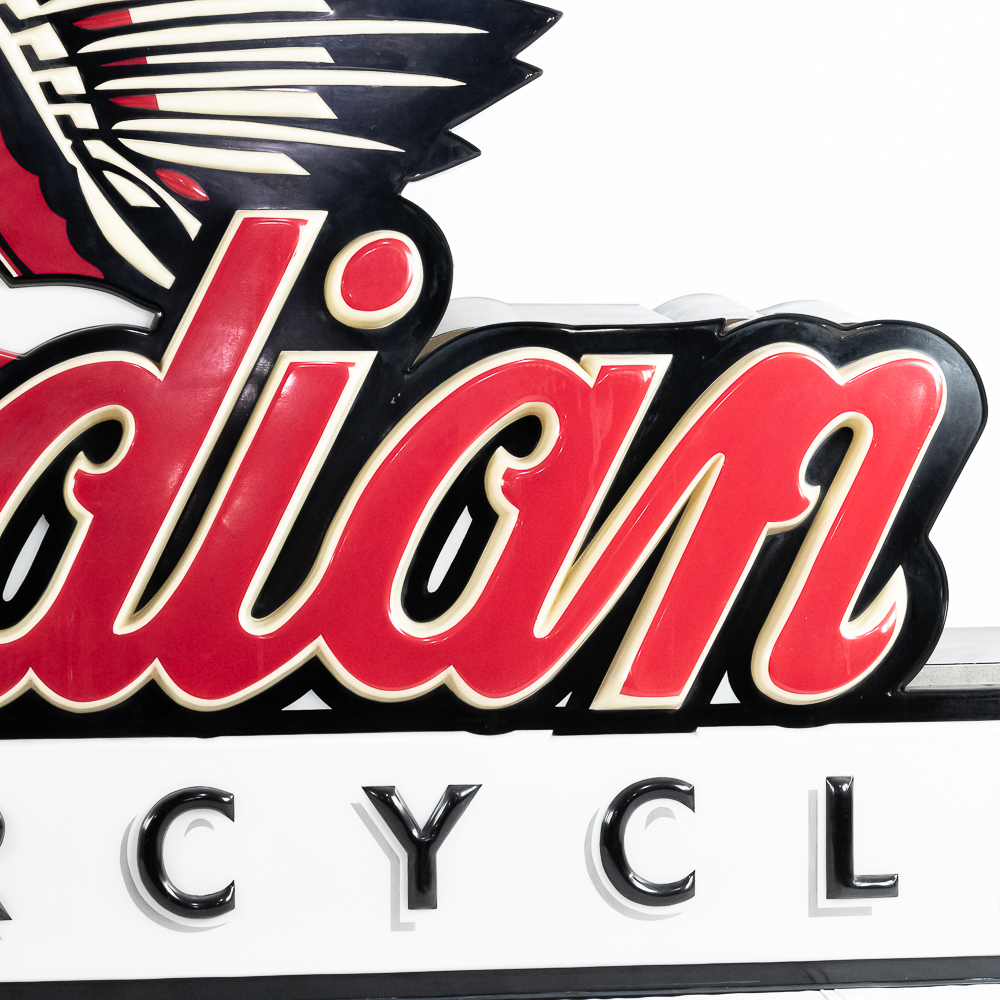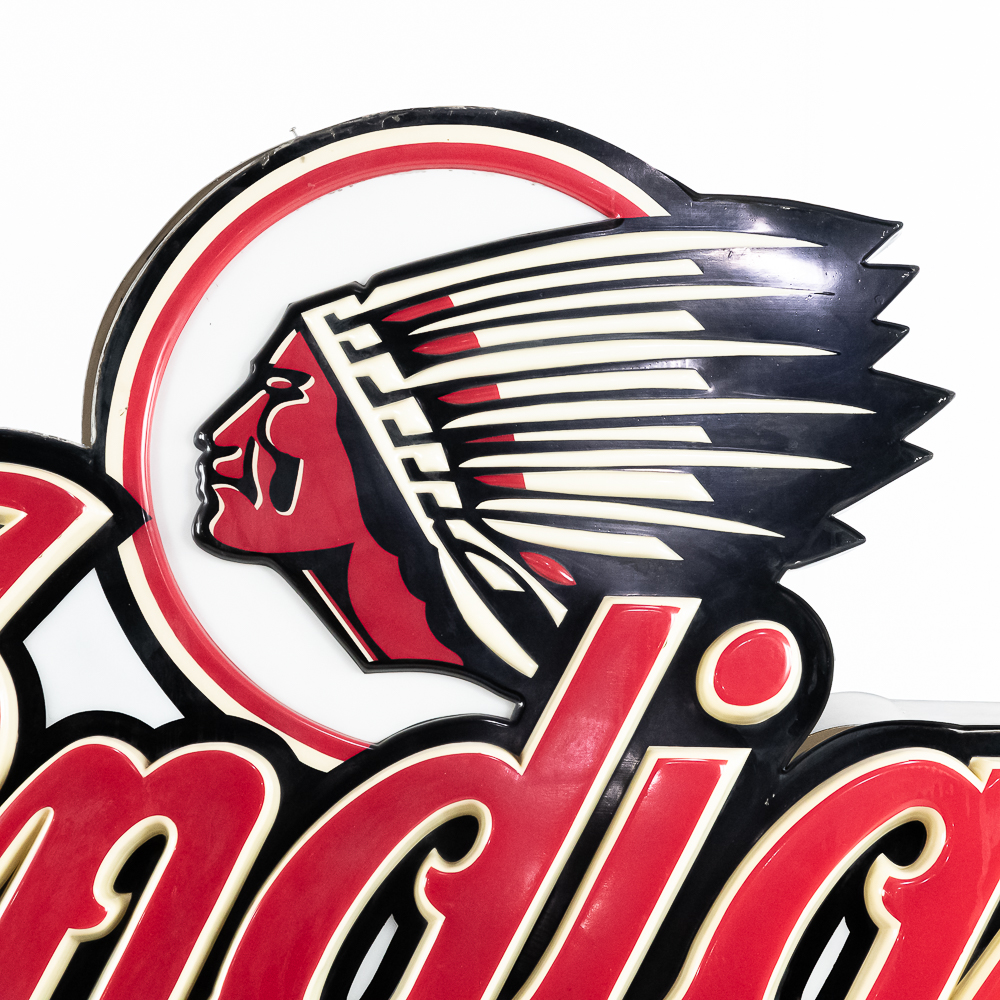 Large vacuum formed plastic sign mounted on a metal light box that hung outside of a Indian motorcycle dealership. In VG condition, uses flourescent lights behind face. Measures 8′ wide, 51″ tall, 121″deep.