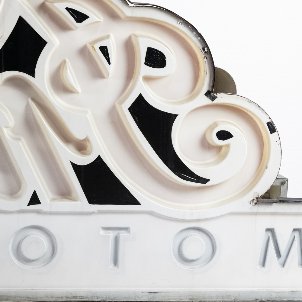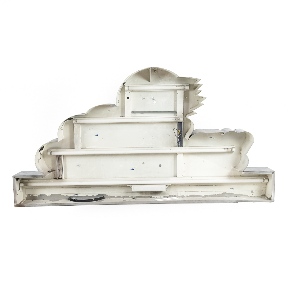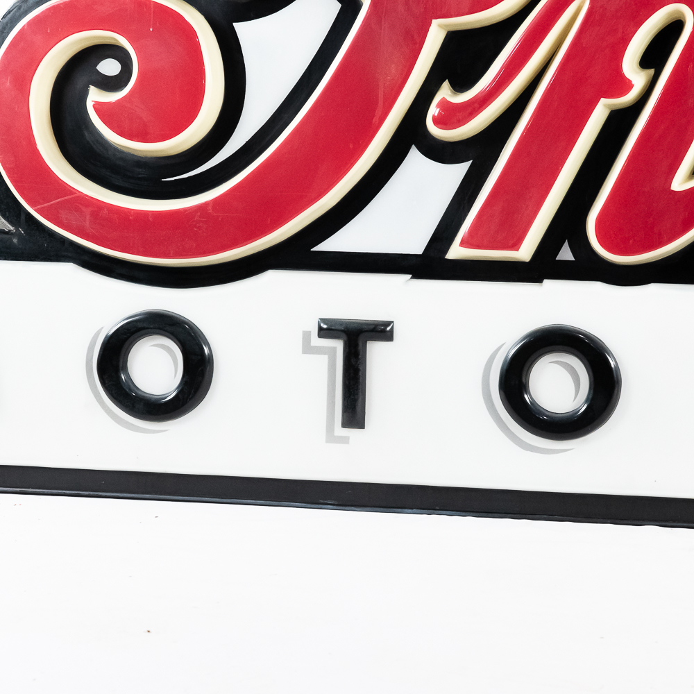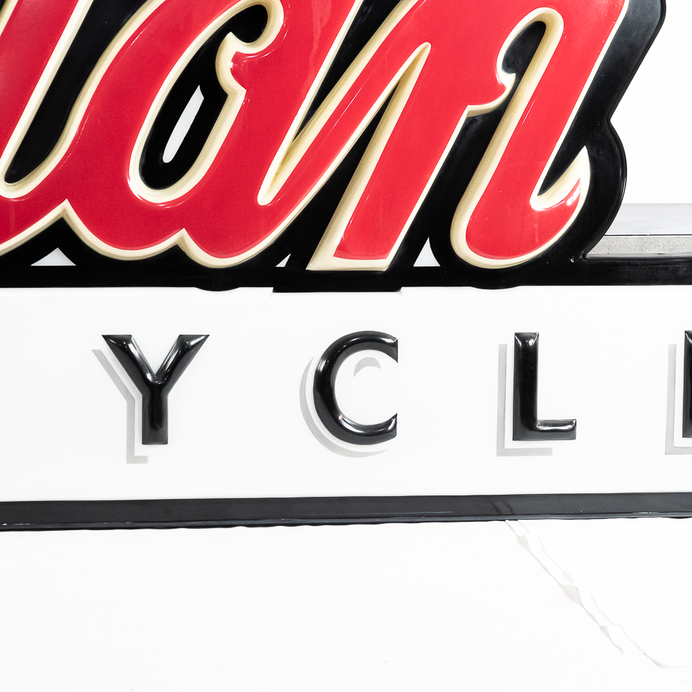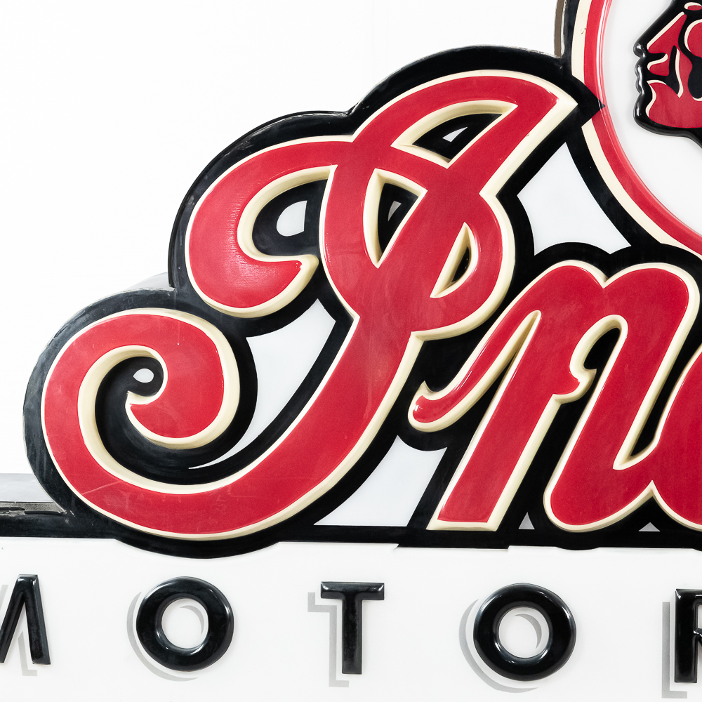 Large vacuum formed plastic sign mounted on a metal light box that hung outside of a Indian motorcycle dealership. In VG condition, uses flourescent lights behind face. Measures 8′ wide, 51″ tall, 121″deep.