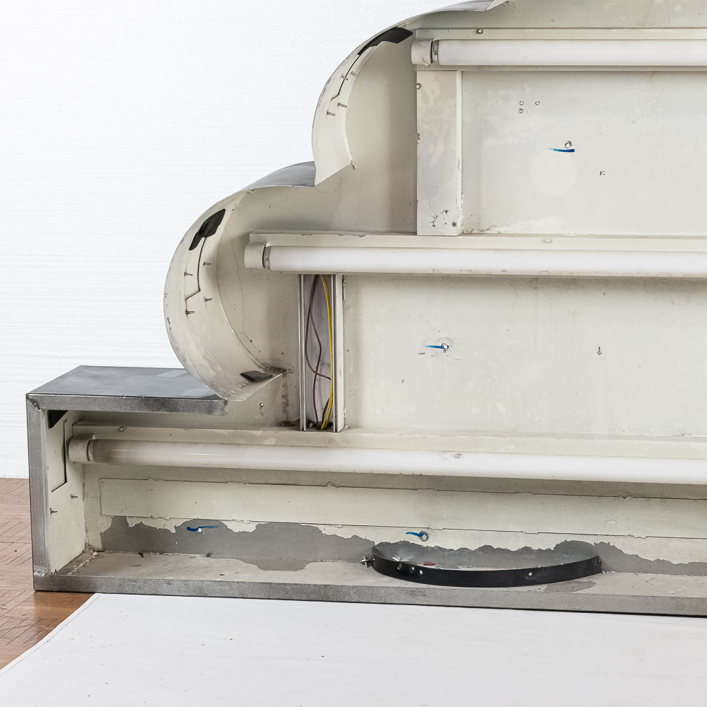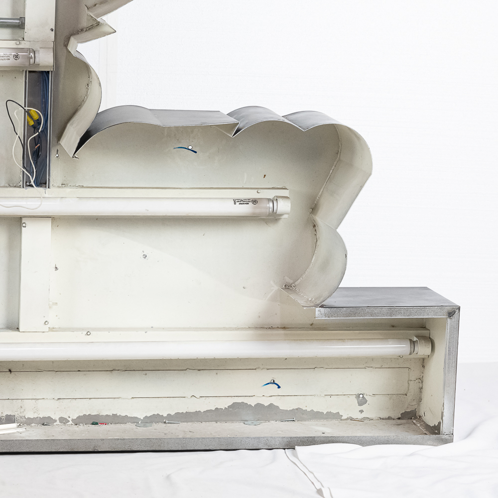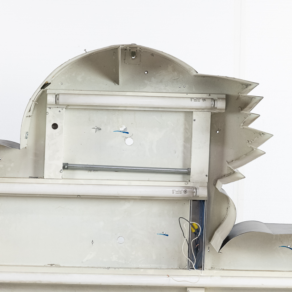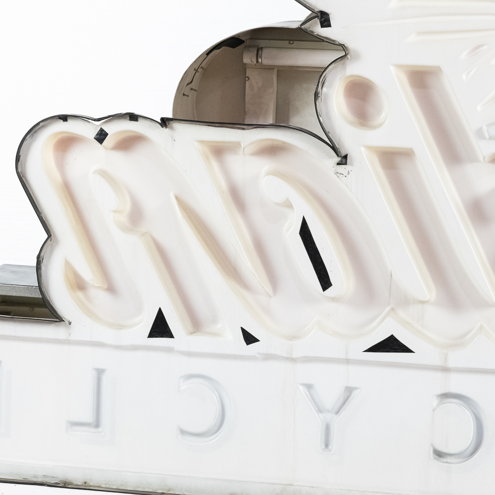 Large vacuum formed plastic sign mounted on a metal light box that hung outside of a Indian motorcycle dealership. In VG condition, uses flourescent lights behind face. Measures 8′ wide, 51″ tall, 121″deep.
