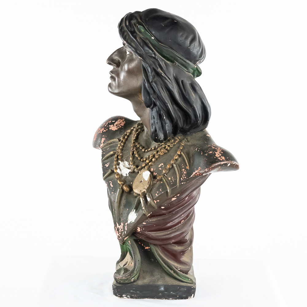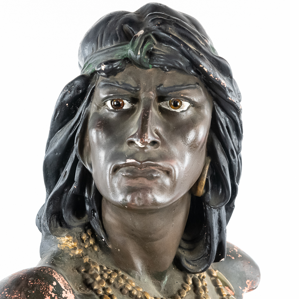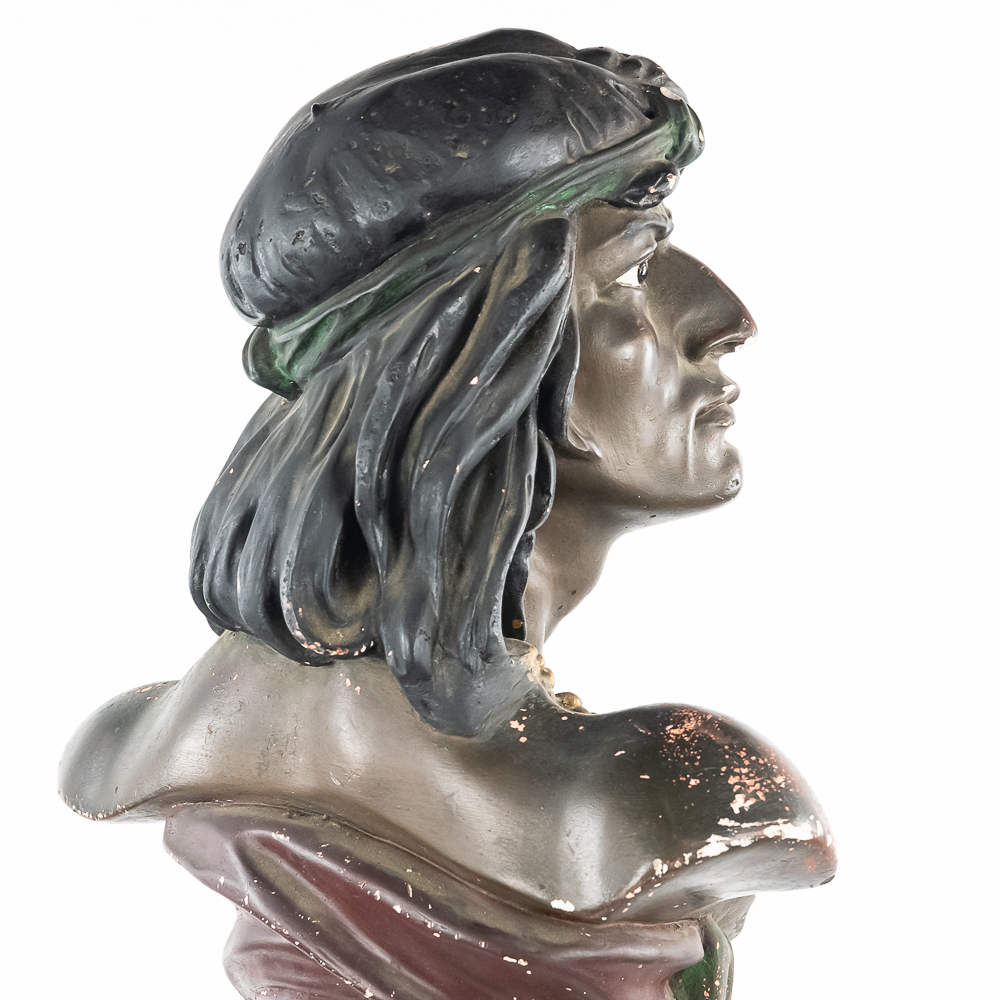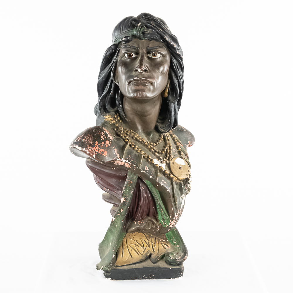 Life size plaster bust Made by CB for Hiawatha Tobacco. Has several chips and paint loss. Somebody has started restoration with plaster (see photos). This is the large 28″ tall size of this bust most often found in cigar and tobacco stores at the turn of the 1900’s.