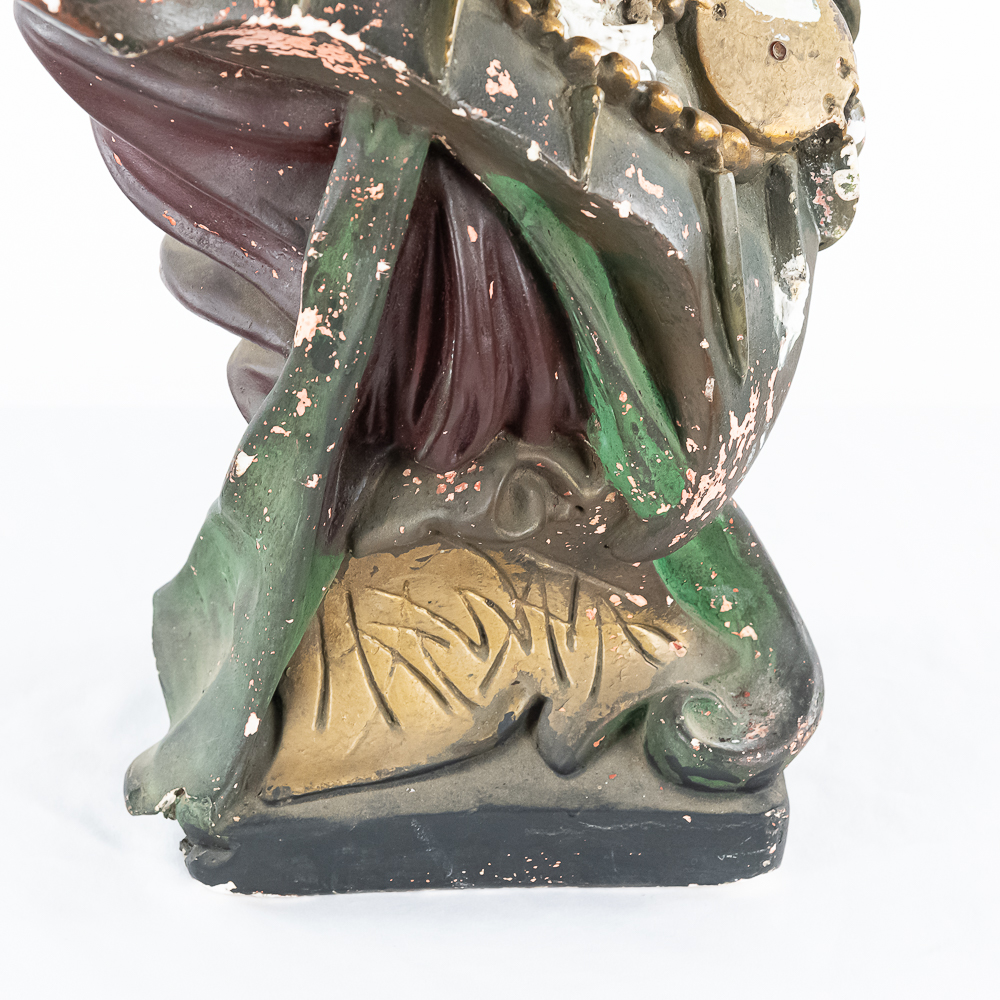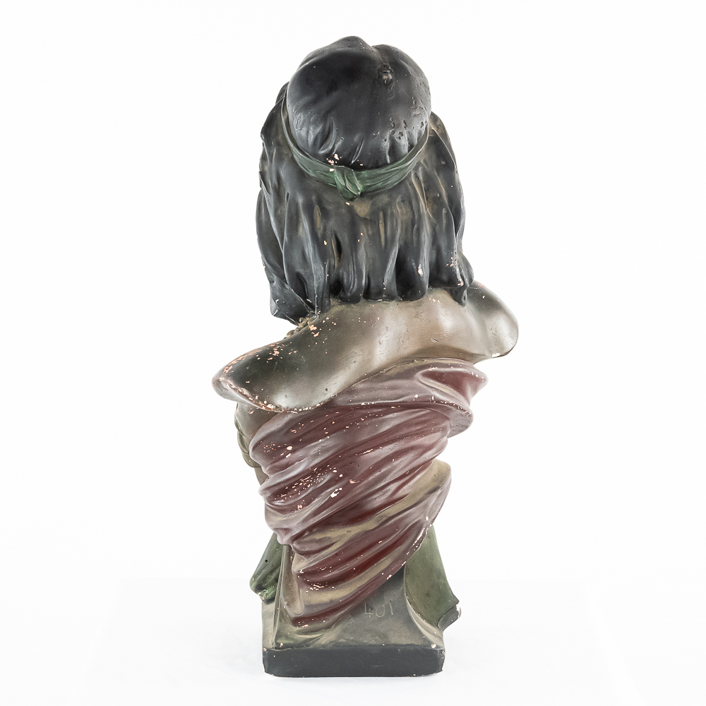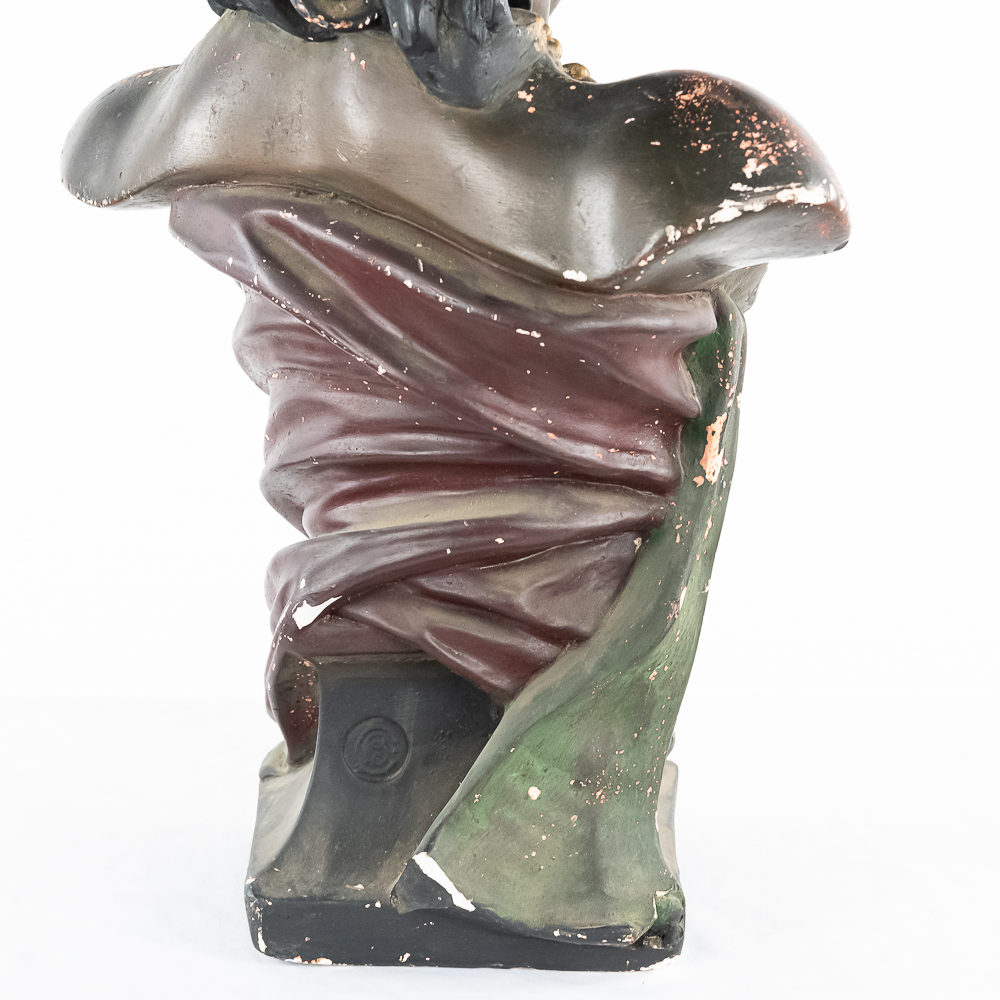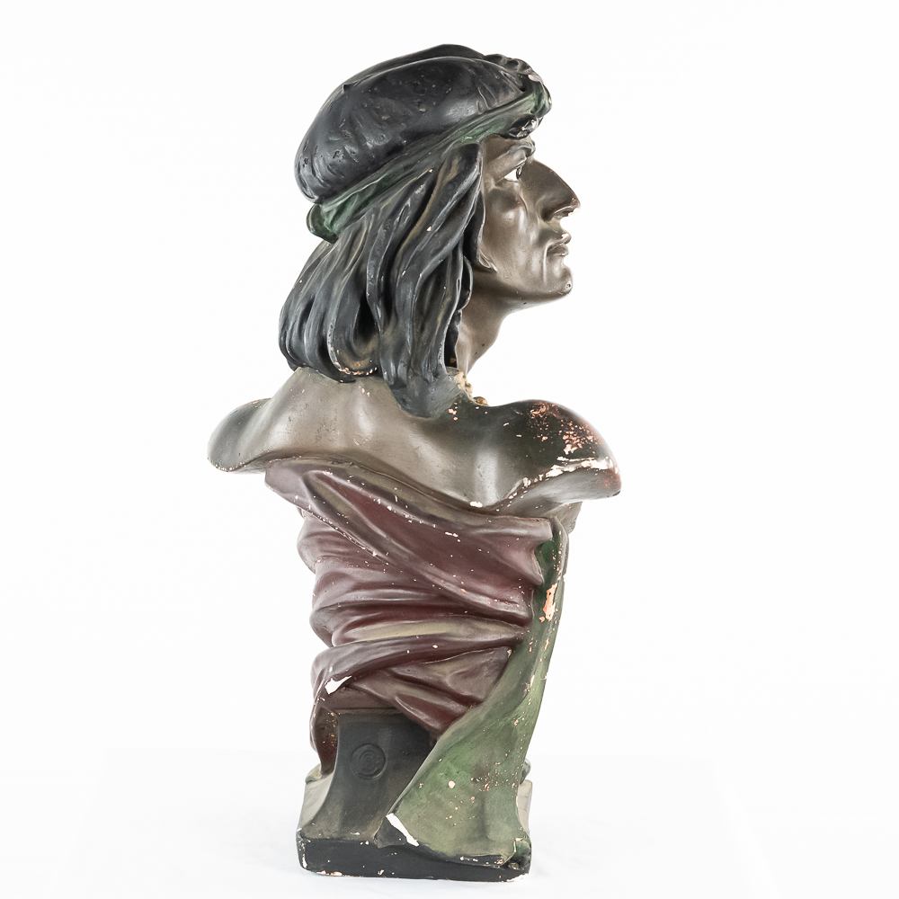 Life size plaster bust Made by CB for Hiawatha Tobacco. Has several chips and paint loss. Somebody has started restoration with plaster (see photos). This is the large 28″ tall size of this bust most often found in cigar and tobacco stores at the turn of the 1900’s.