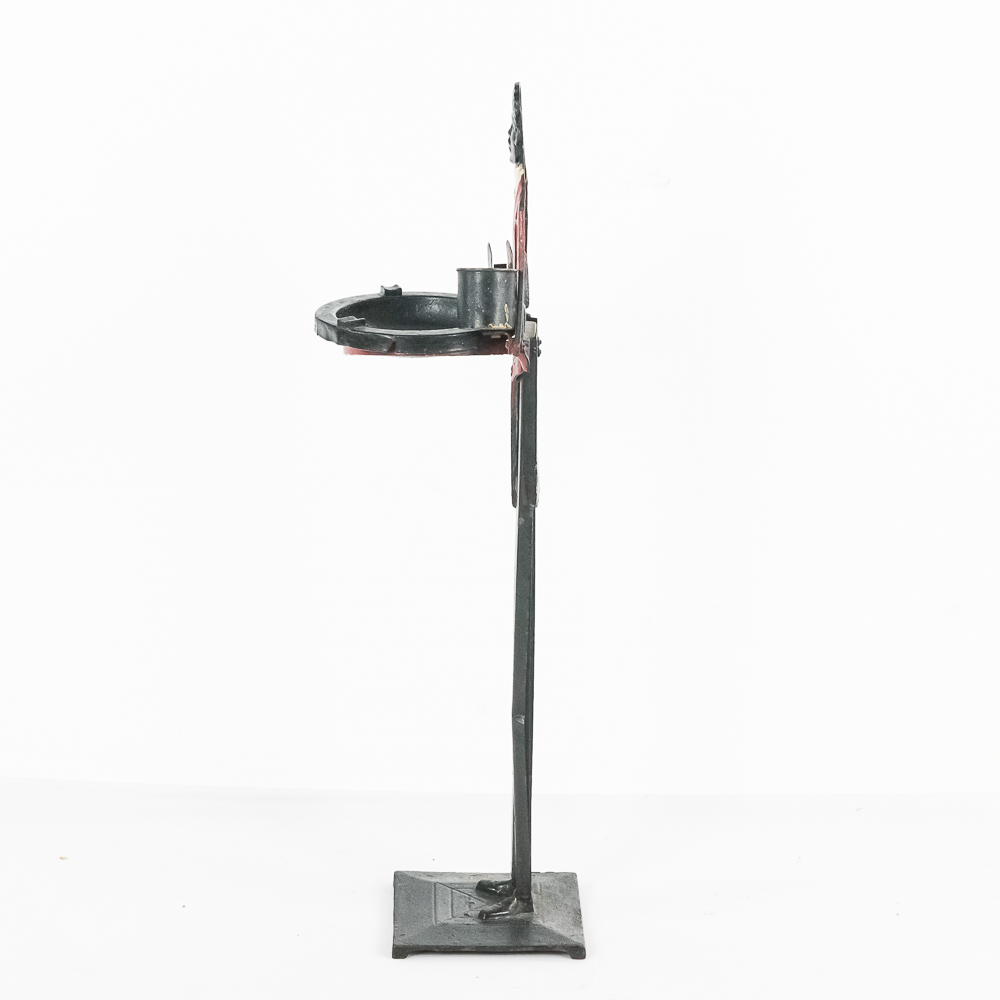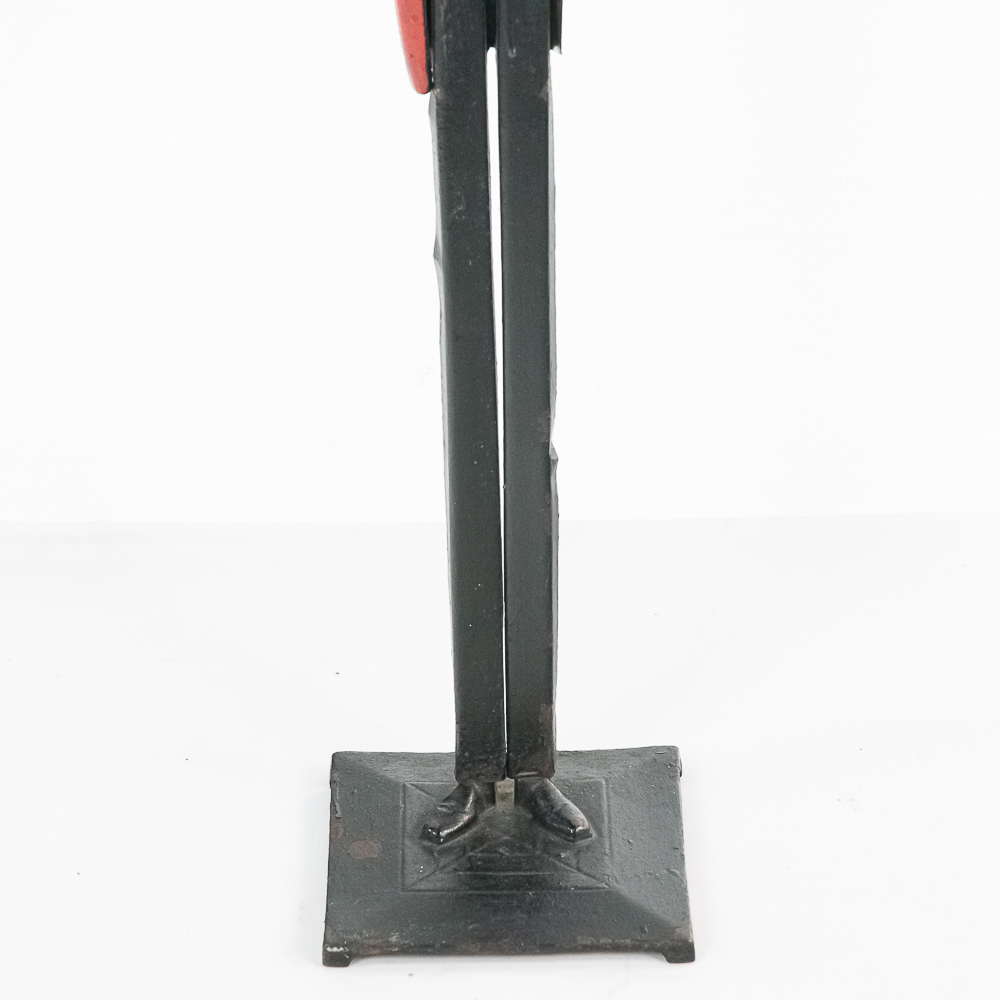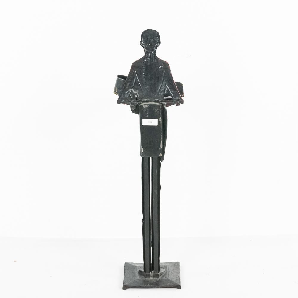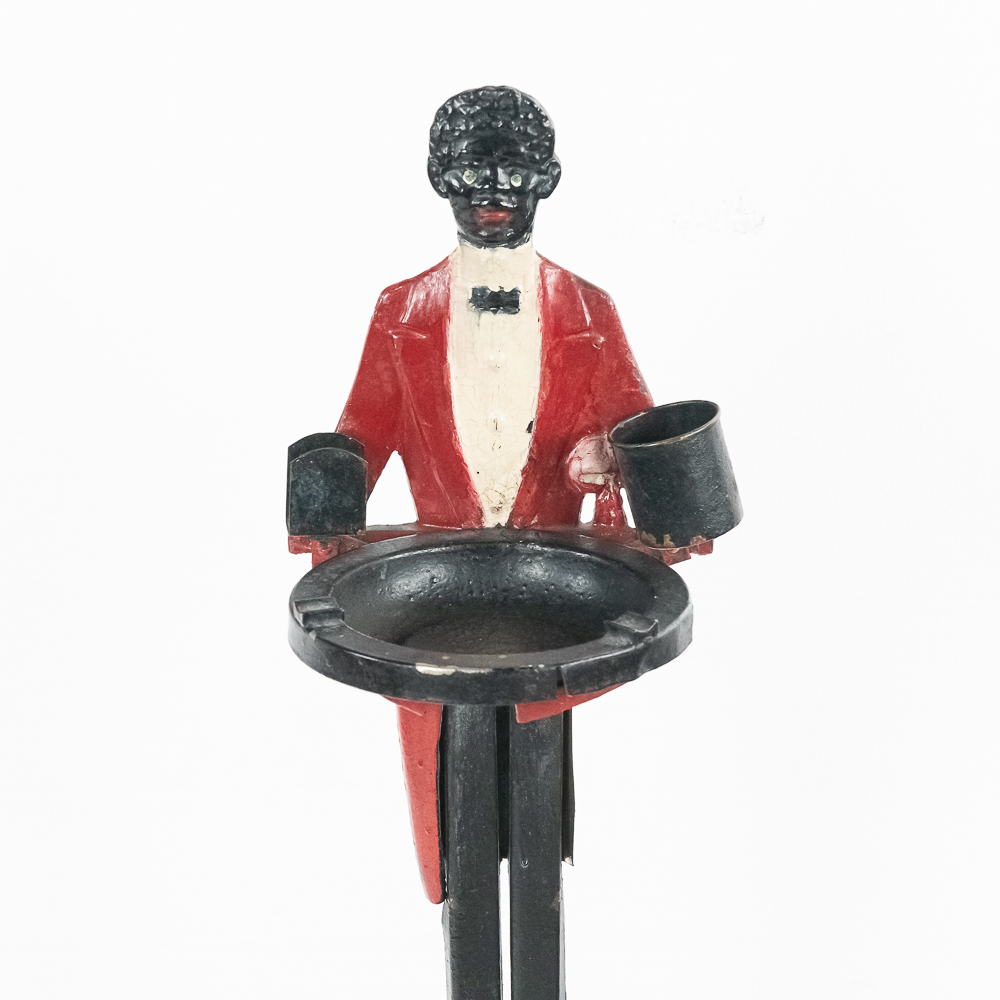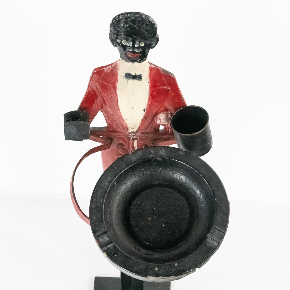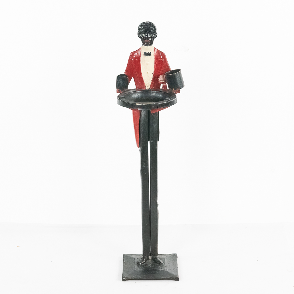 Vintage Black Americana “Black Butler” Footman painted standing cast iron ashtray. Approximately 34″ tall and in good overall condition with age and wear marks noted such as minor chips paint loss & discoloration in areas. Patent Applied For imprinted on backside. Appears complete with vintage ashtray and match holder and cigarette cup. Please use photos to judge condition and bid accordingly.