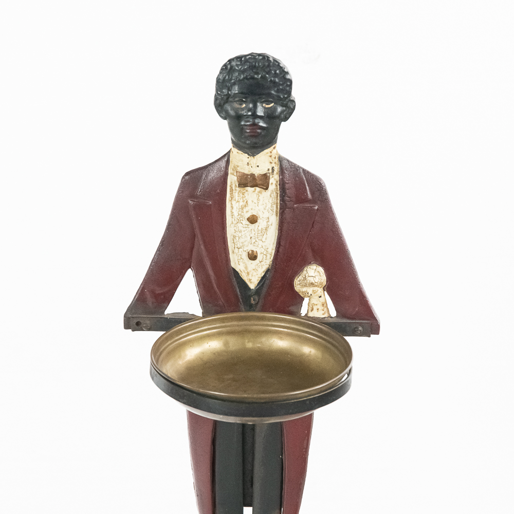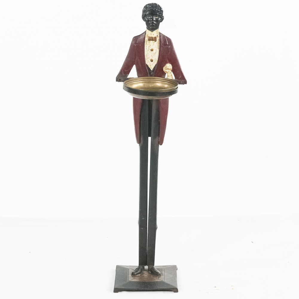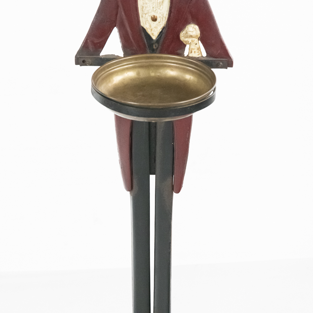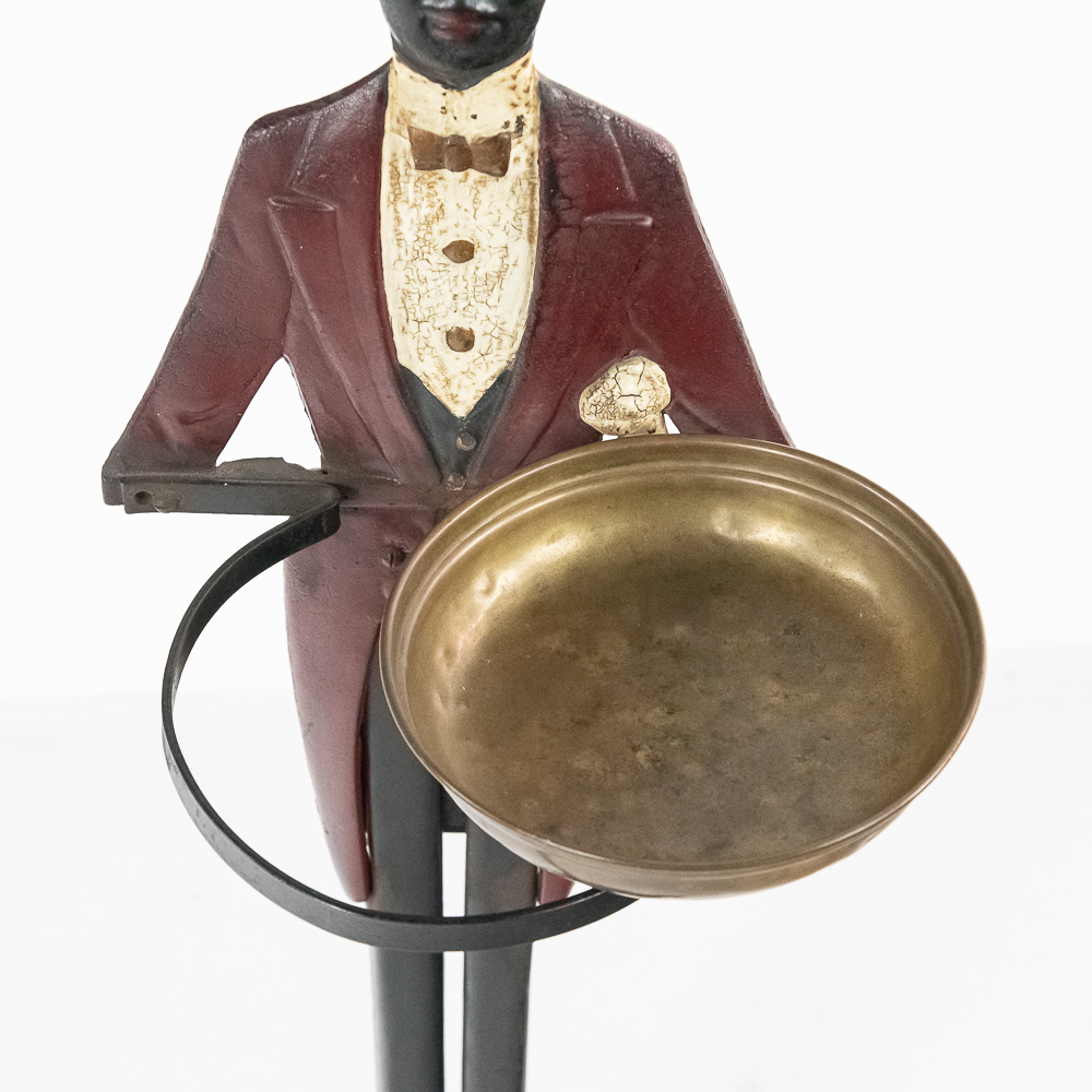Vintage Black Americana “Black Butler” Footman standing cast iron ashtray. Approximately 34″ tall and in good overall condition with moderate age and wear marks noted such as scuffs and minor paint loss & discoloration in areas. Missing side accessories. Please use photos to judge condition and bid accordingly.