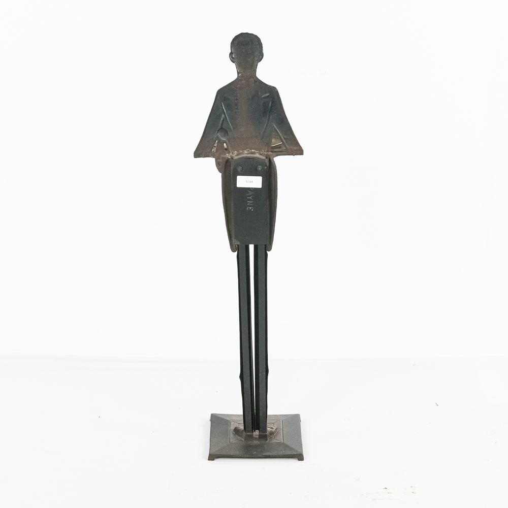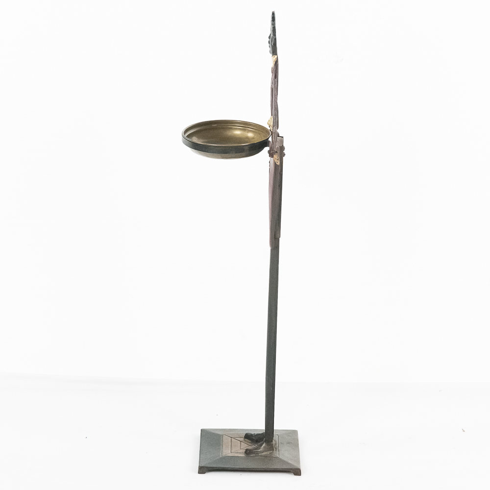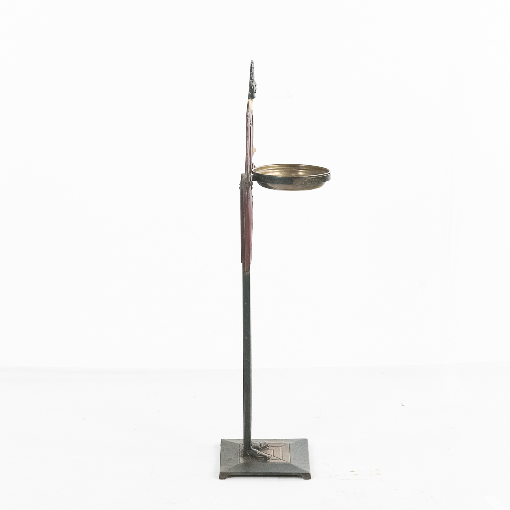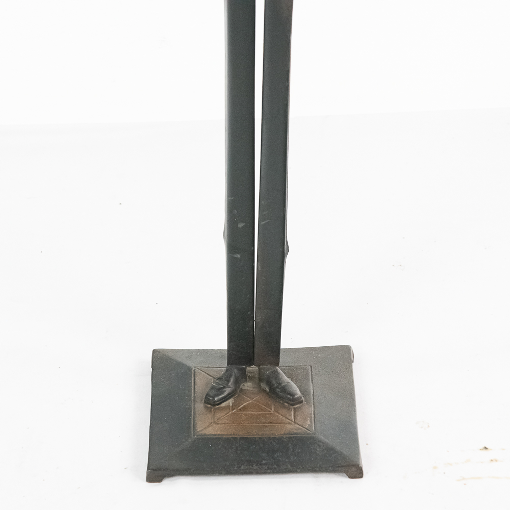Vintage Black Americana “Black Butler” Footman standing cast iron ashtray. Approximately 34″ tall and in good overall condition with moderate age and wear marks noted such as scuffs and minor paint loss & discoloration in areas. Missing side accessories. Please use photos to judge condition and bid accordingly.