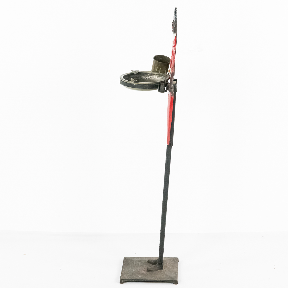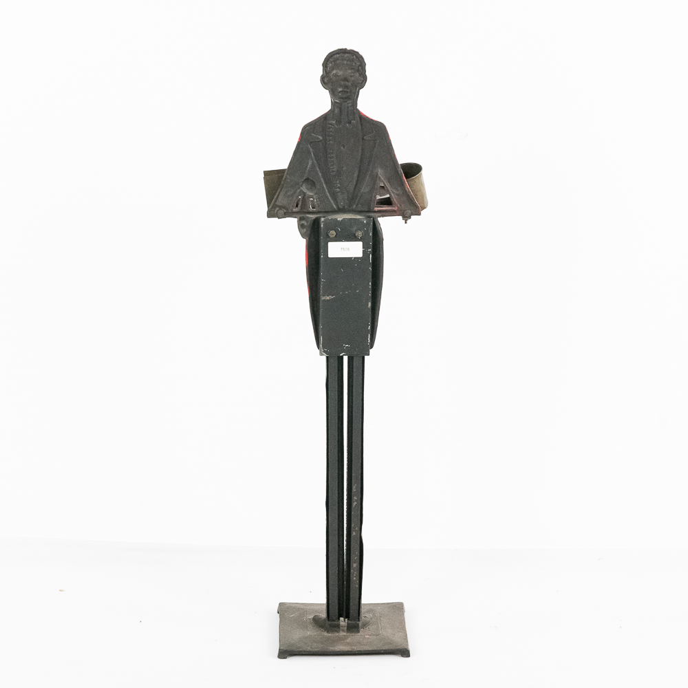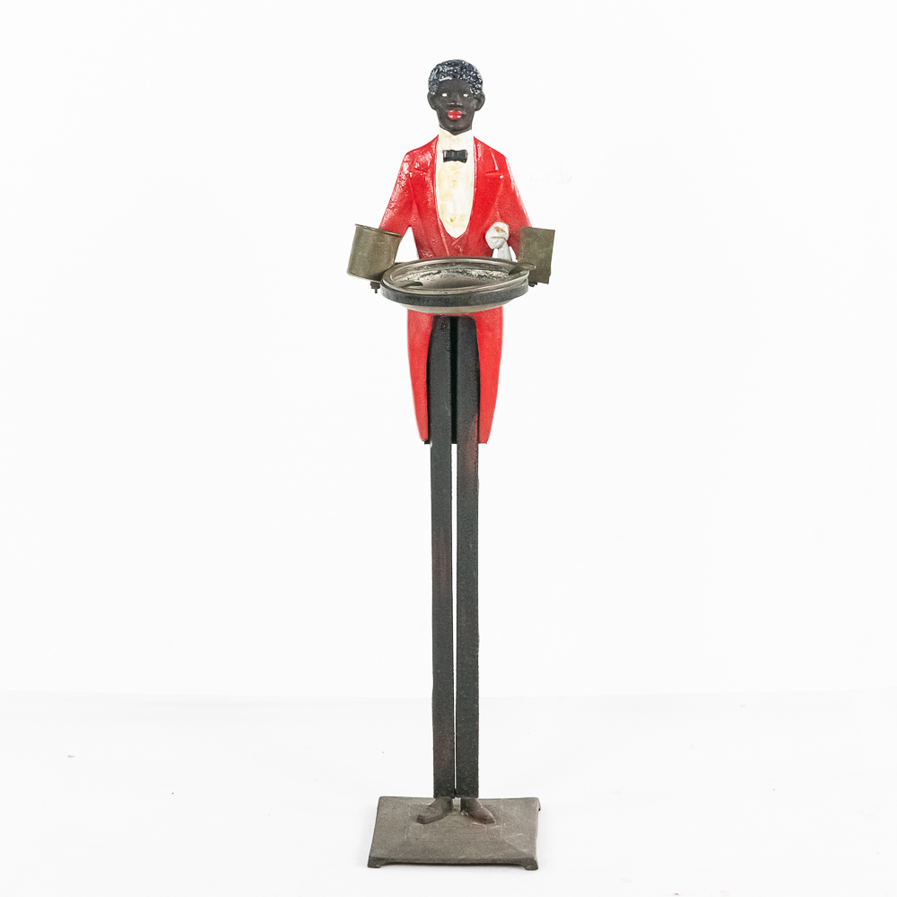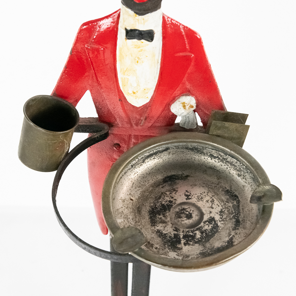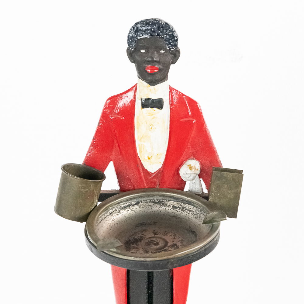 Vintage Black Americana “Black Butler” Footman painted standing cast iron ashtray. Approximately 35.5″ tall and in good overall condition with age and wear marks noted such as minor chips paint loss & discoloration in areas. Appears complete with vintage ashtray and match holder and cigarette cup. Please use photos to judge condition and bid accordingly.