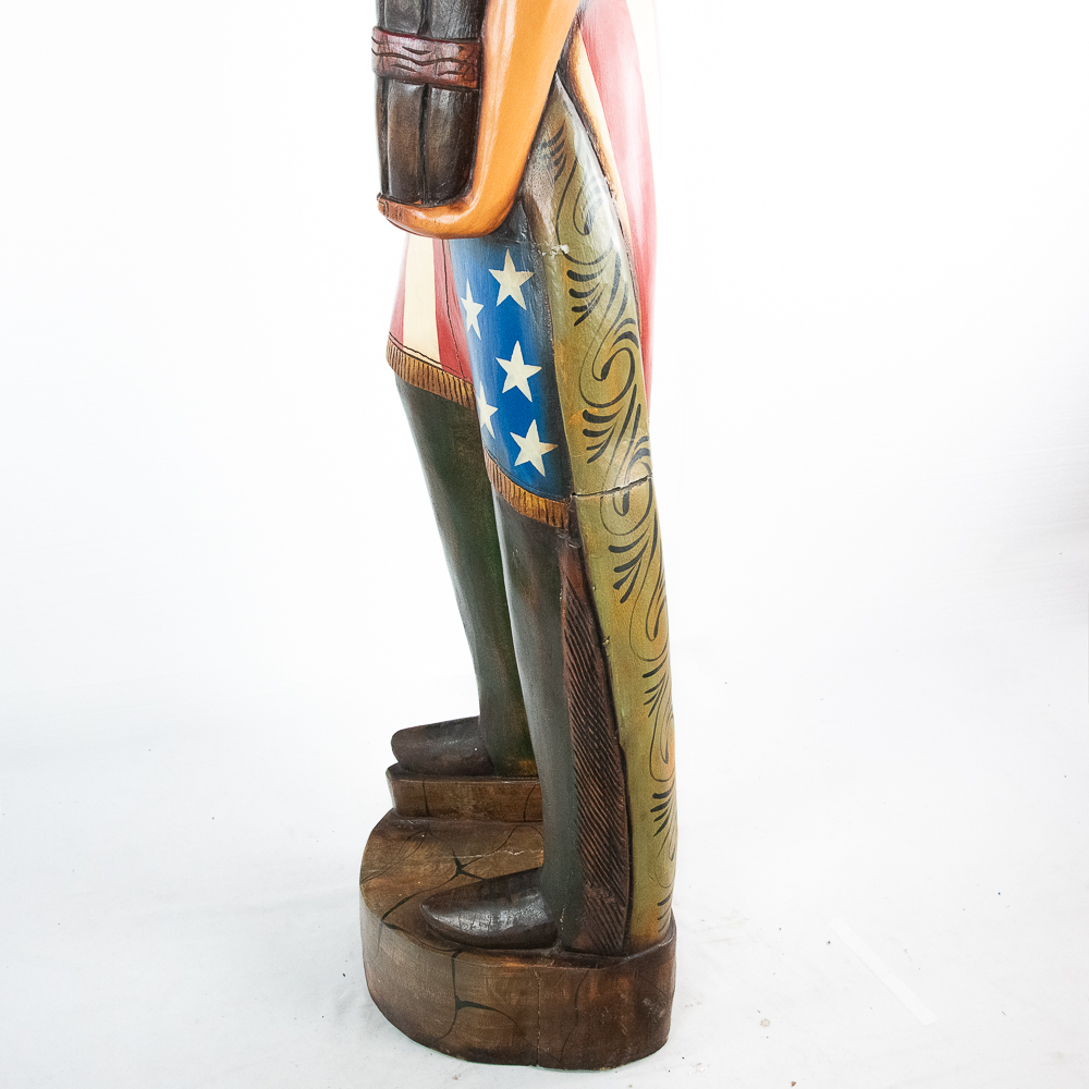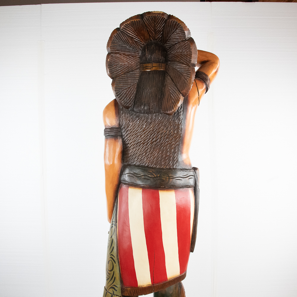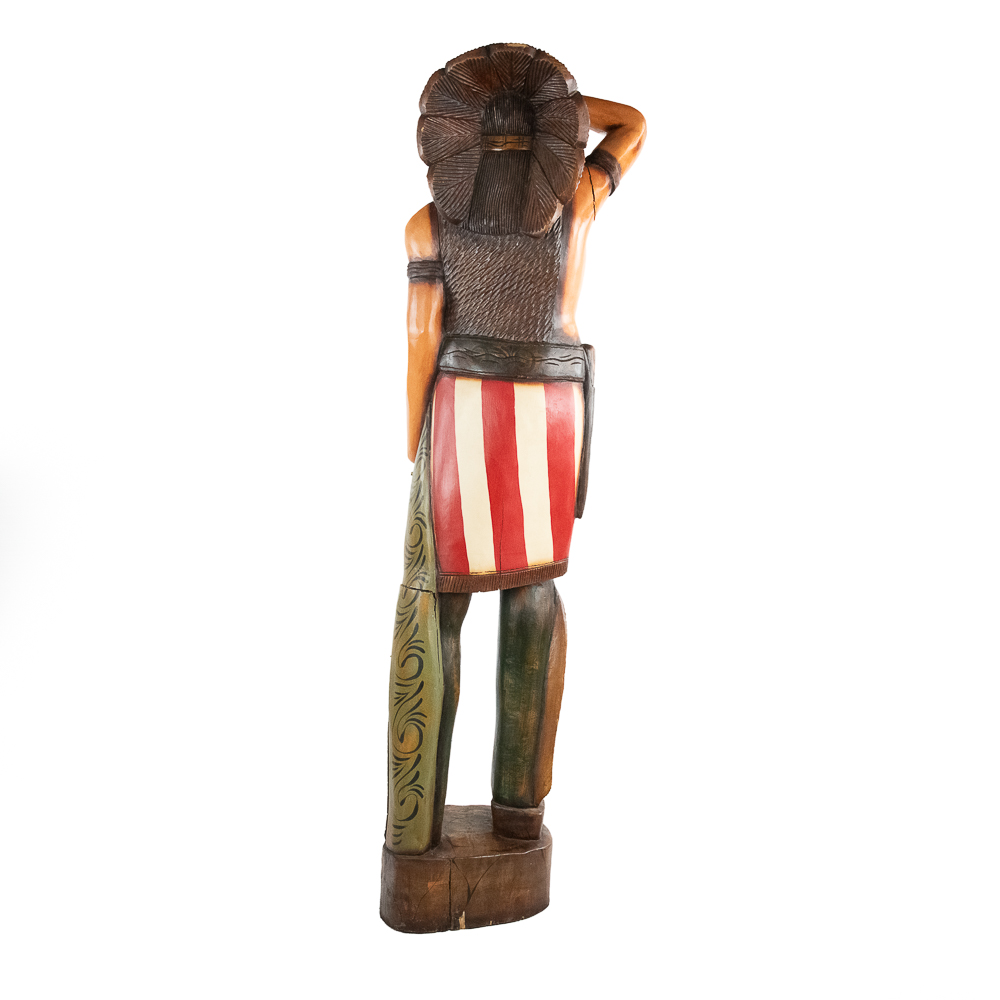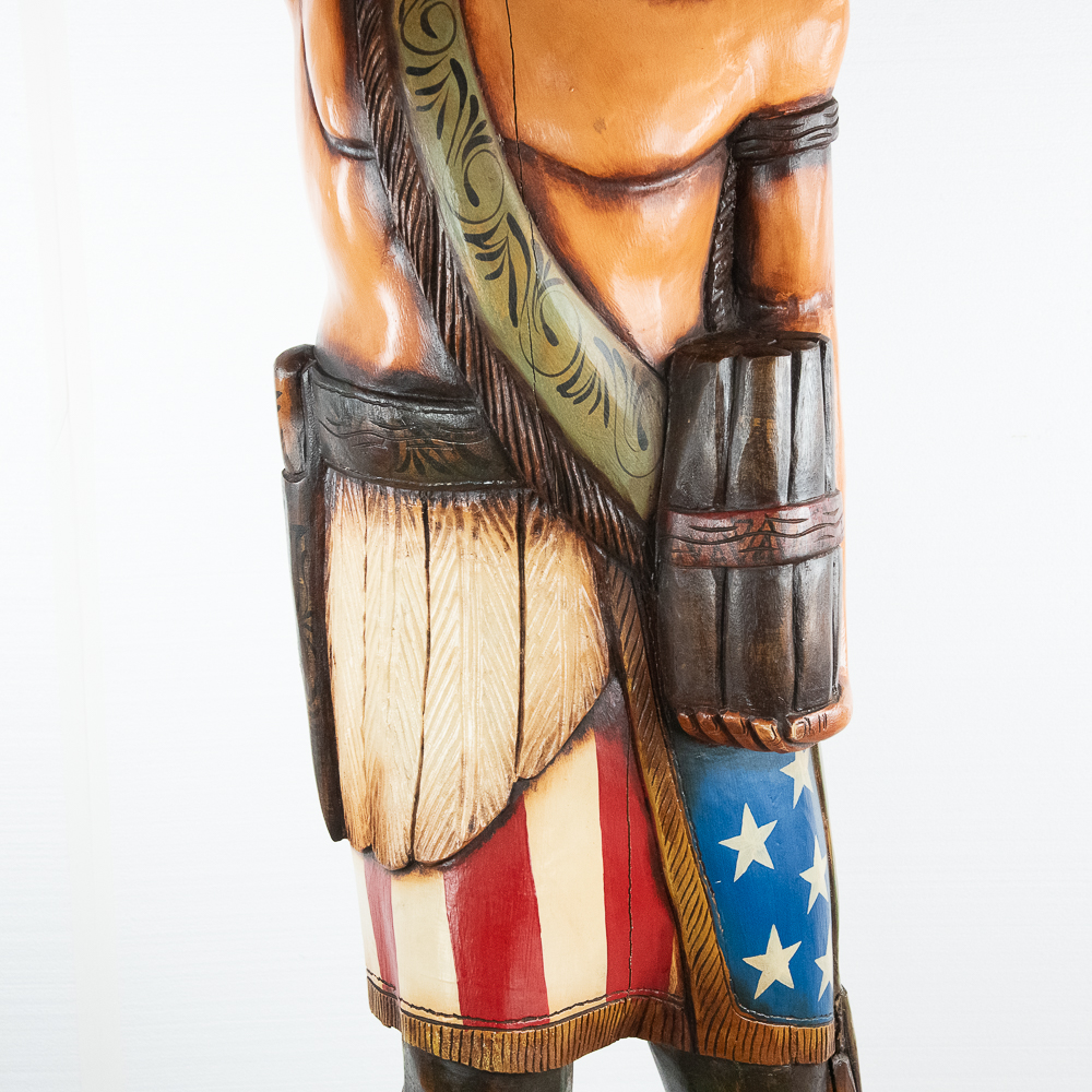 Probably carved in the 2000’s, this contemporary figure is a great Man Cave item. Standing 79″ tall it has original paint. Has some large stress cracks, see photos.