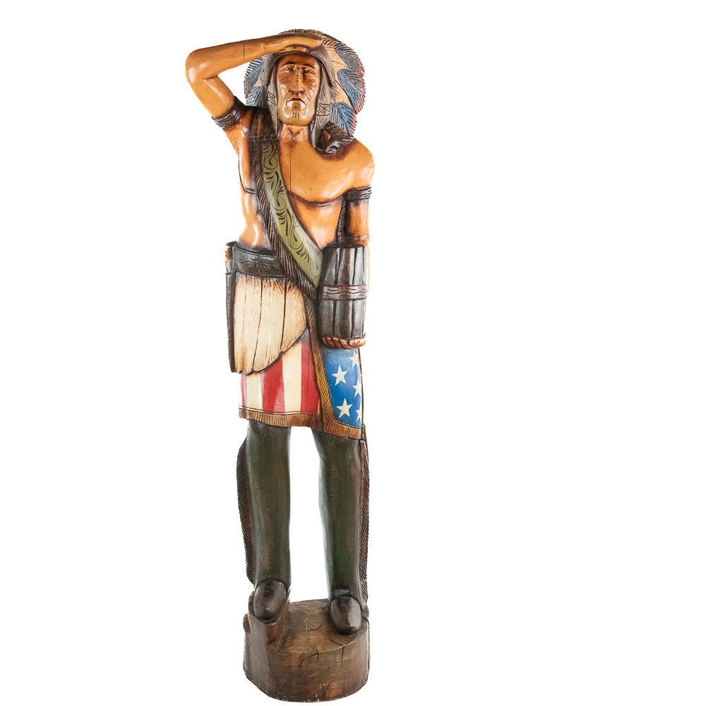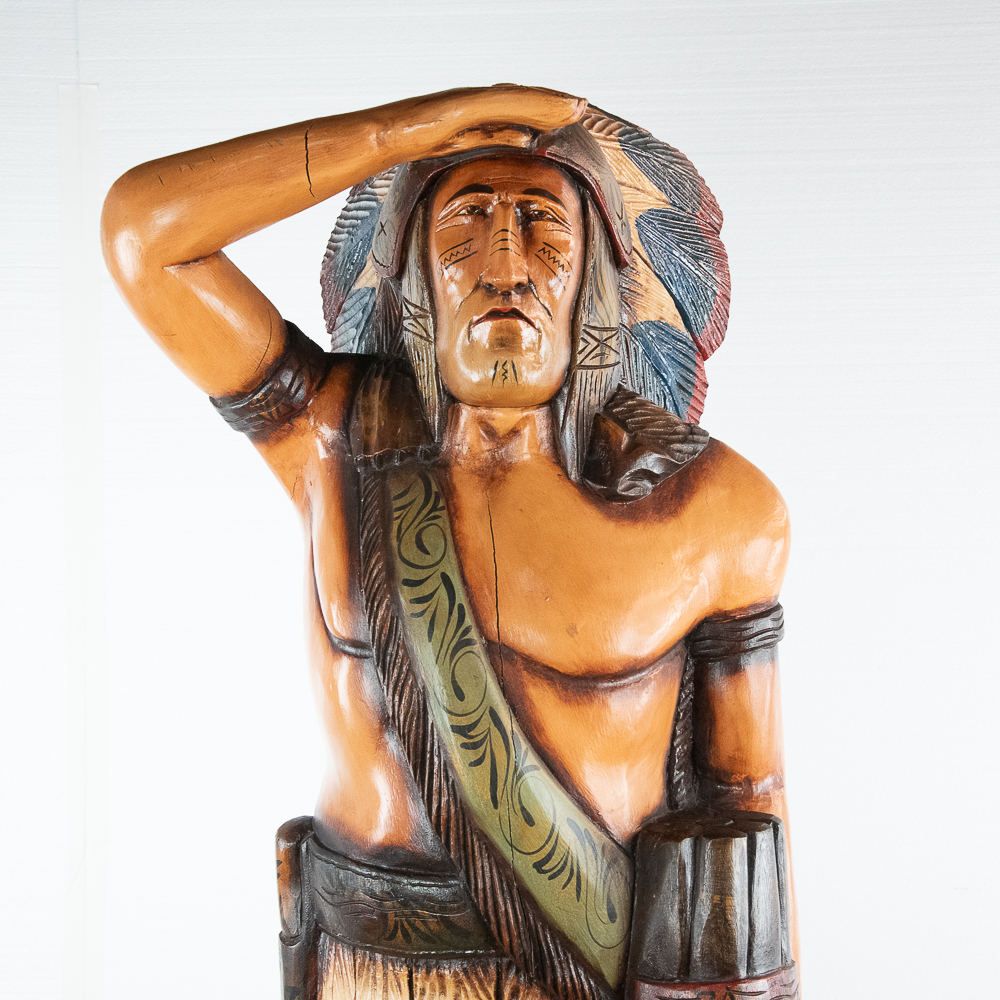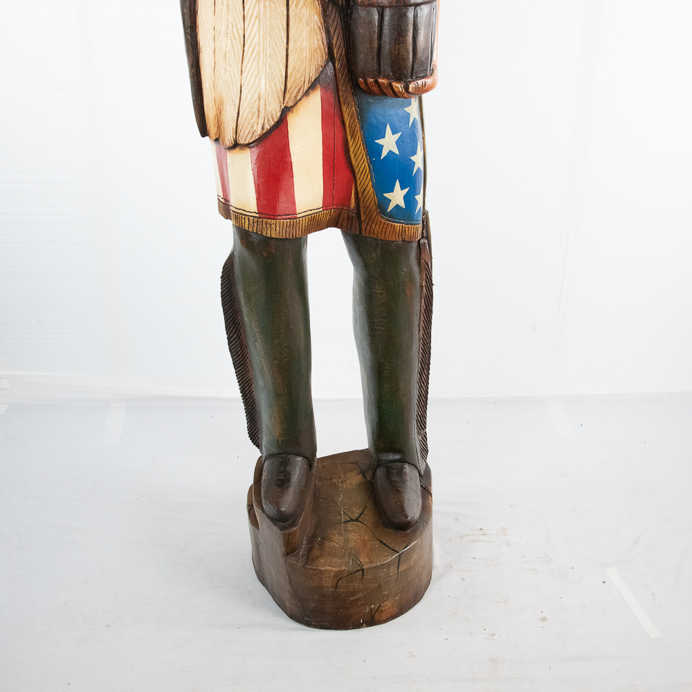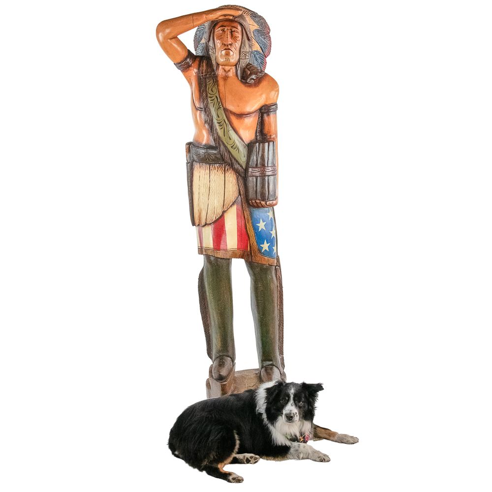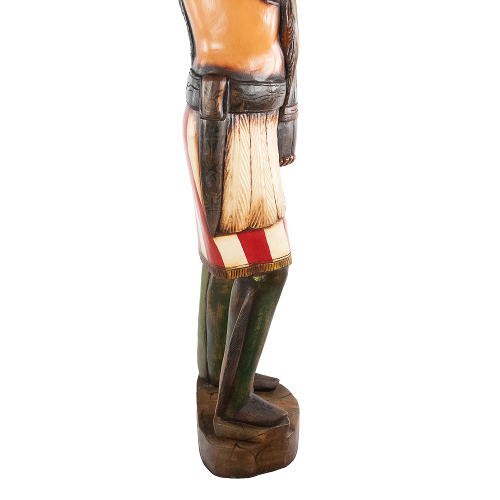 Probably carved in the 2000’s, this contemporary figure is a great Man Cave item. Standing 79″ tall it has original paint. Has some large stress cracks, see photos.