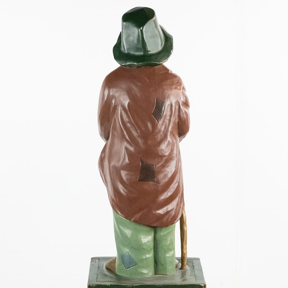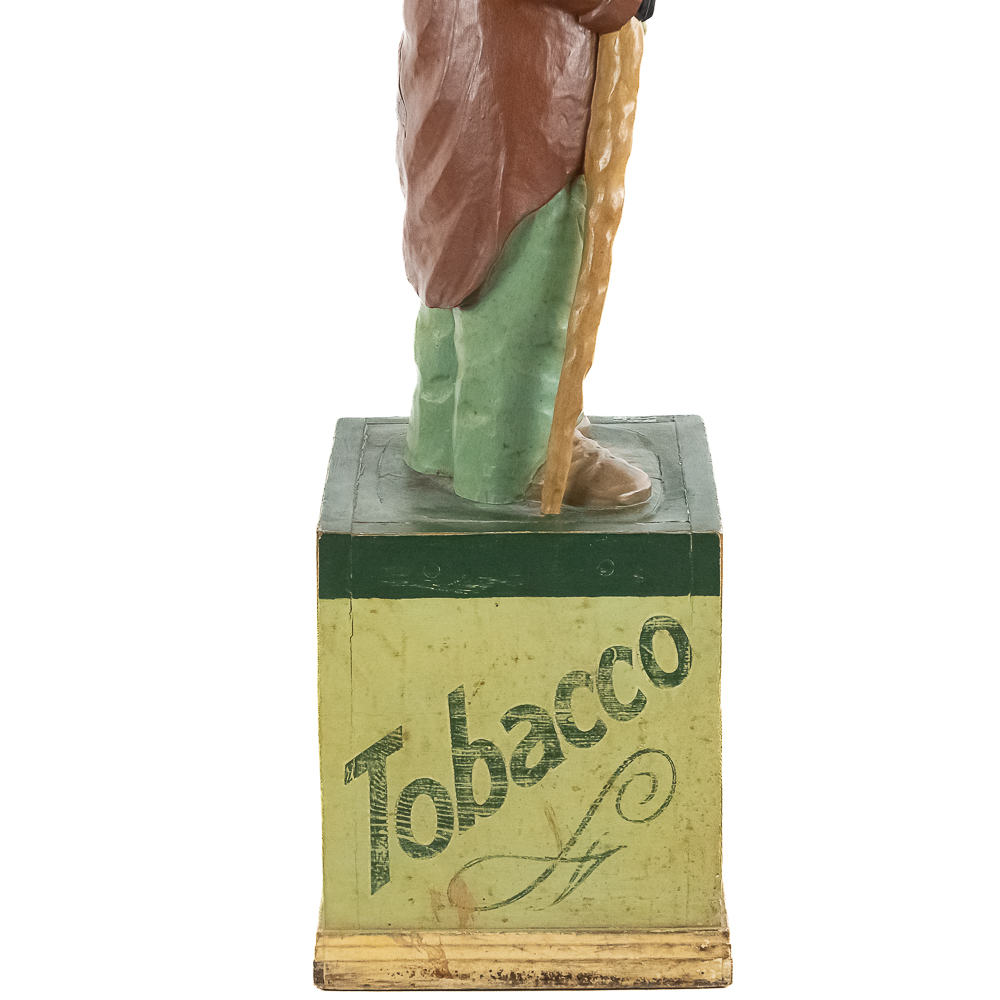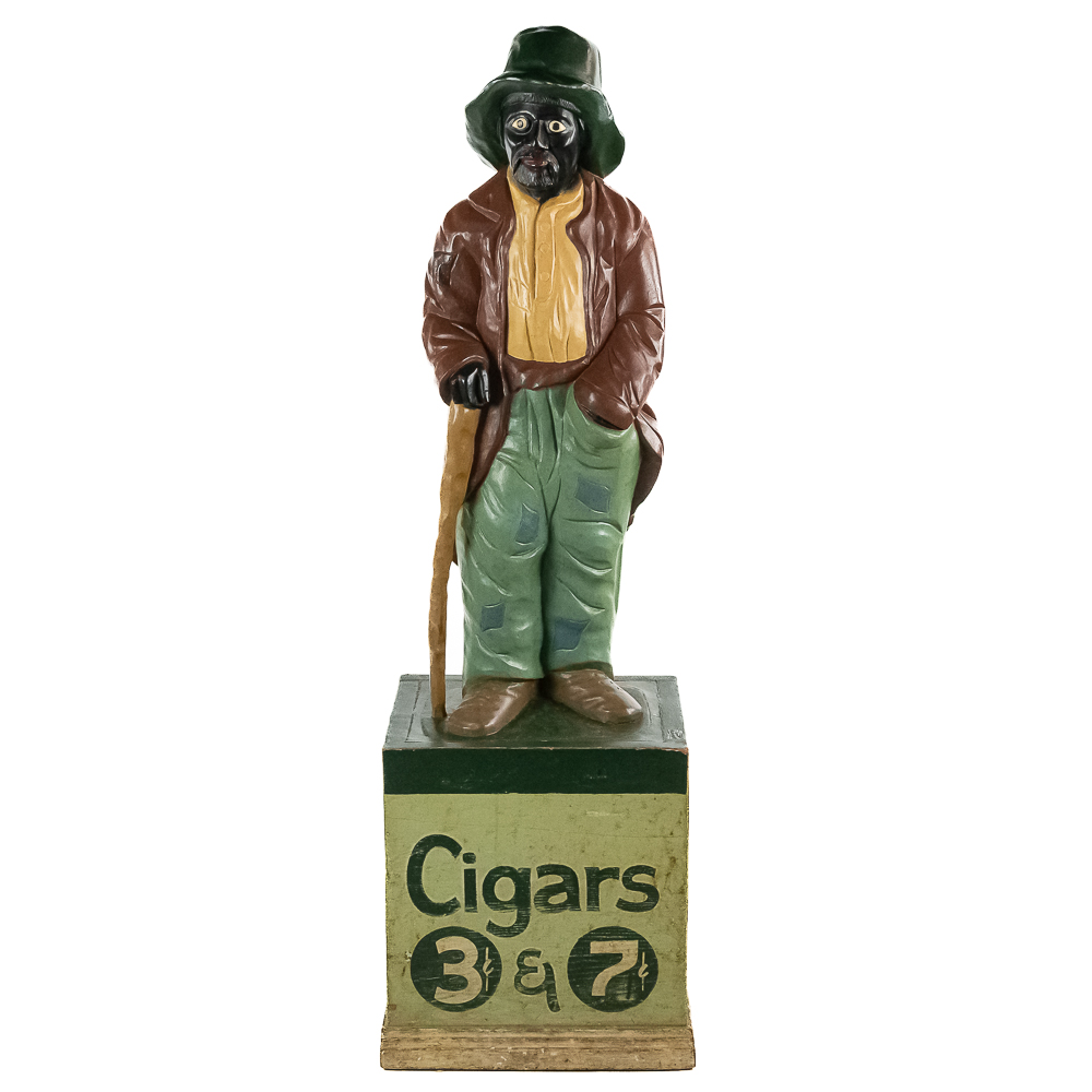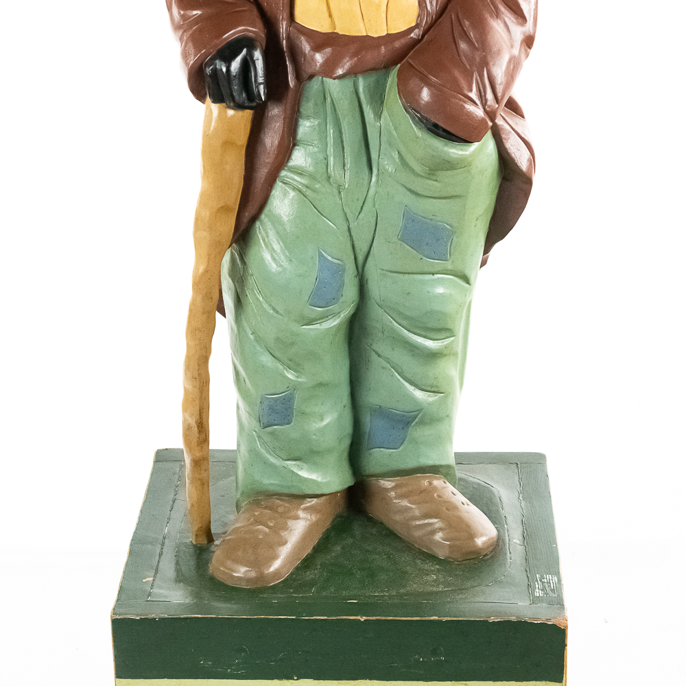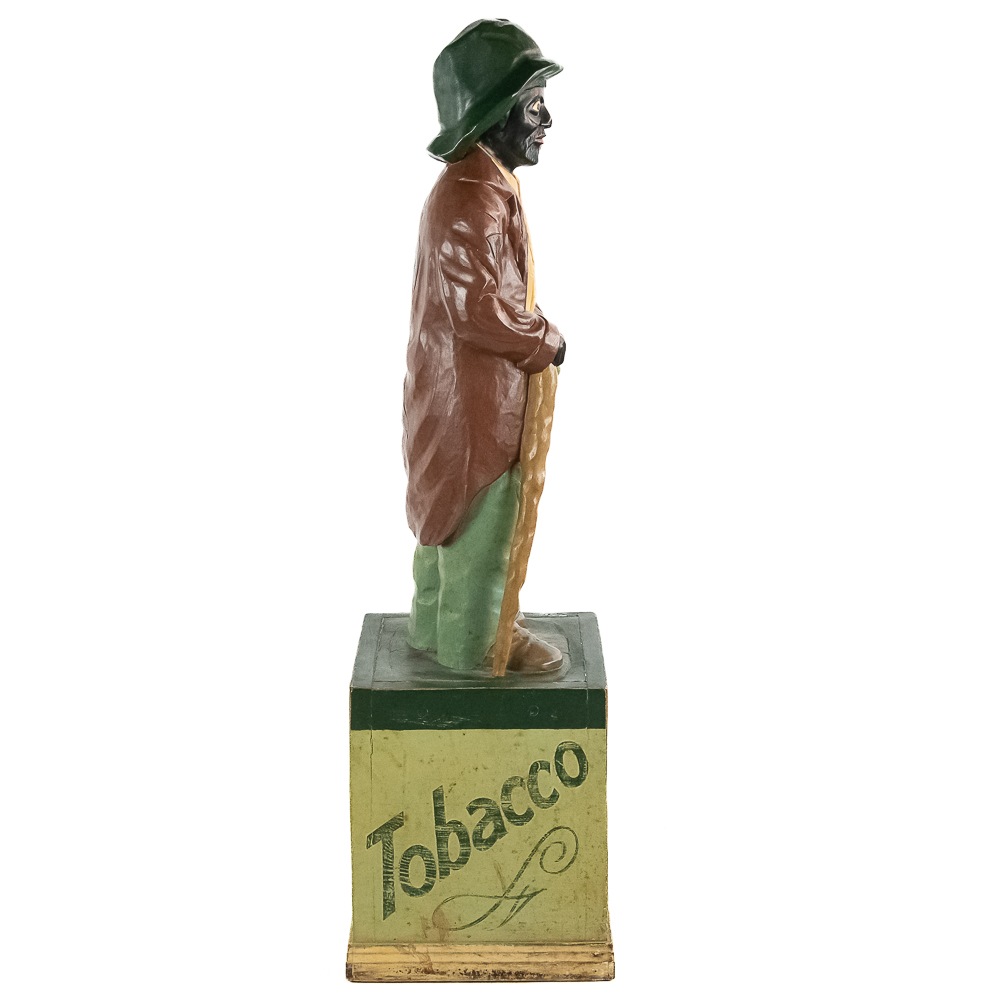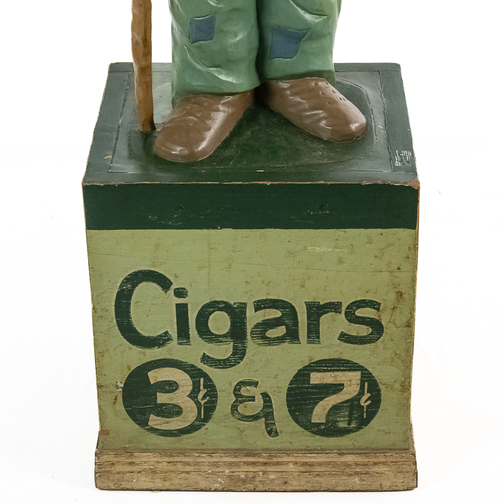 Very rare cigar store figure features black man with walking stick wearing patched/tattered clothing. It is probably repainted. Base says Cigars $.03 & $.07.