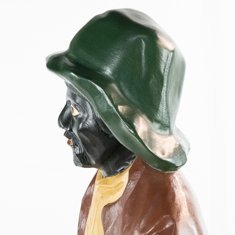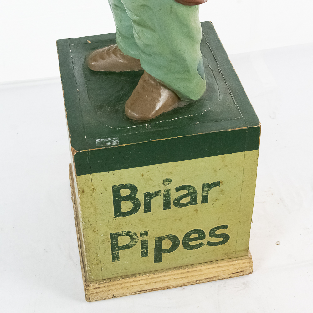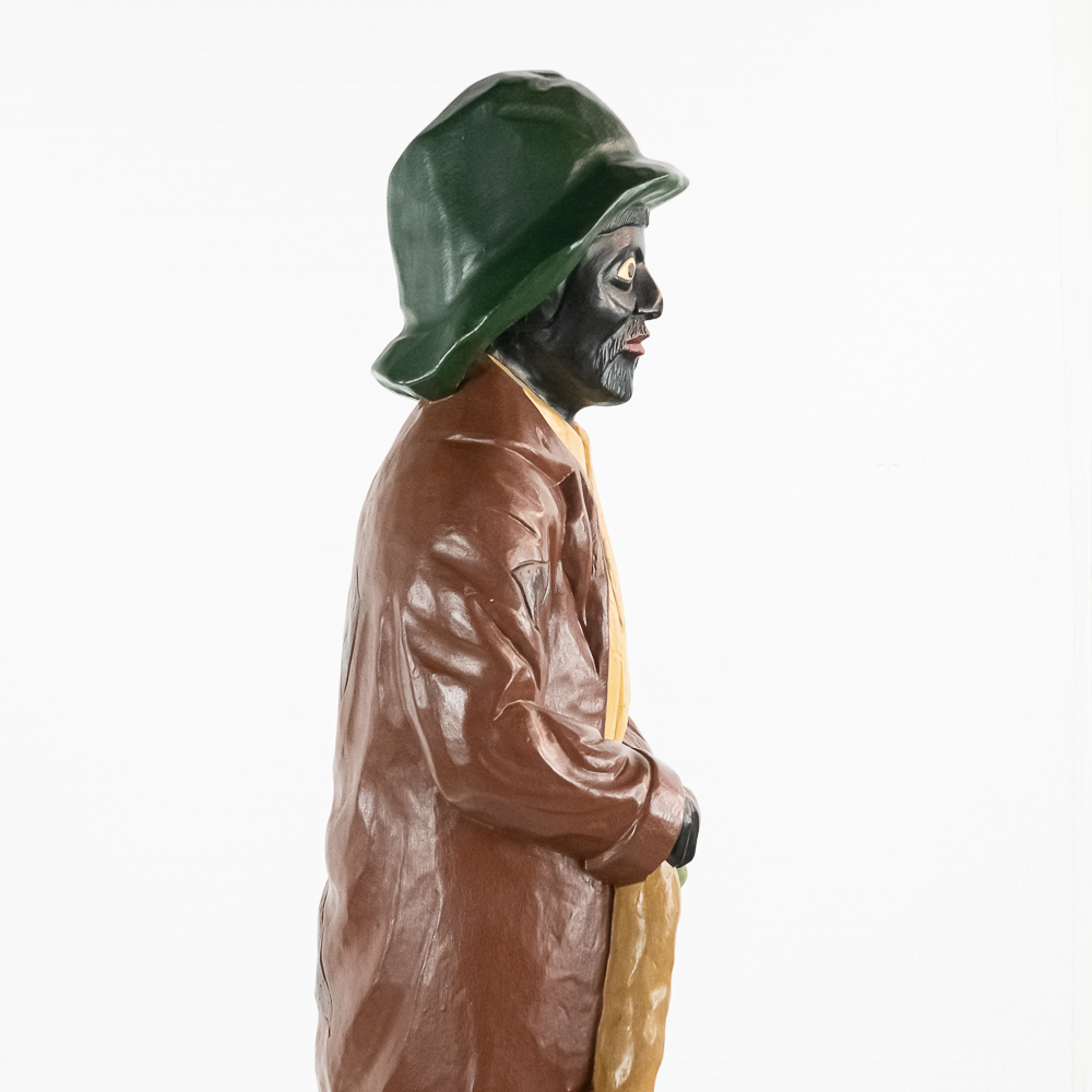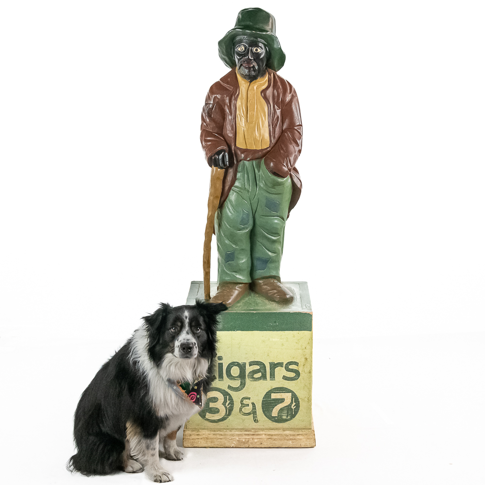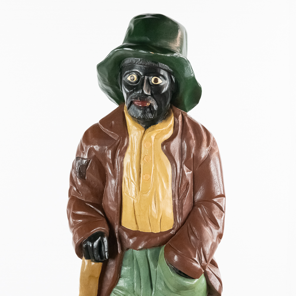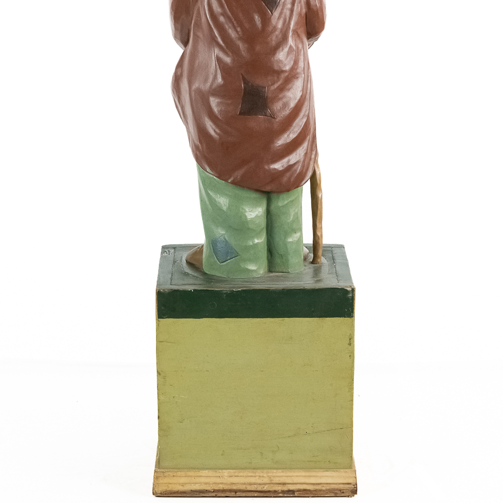 Very rare cigar store figure features black man with walking stick wearing patched/tattered clothing. It is probably repainted. Base says Cigars $.03 & $.07.