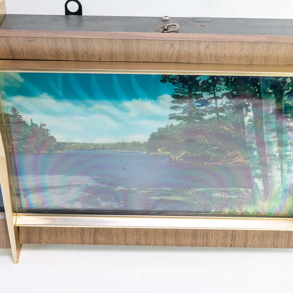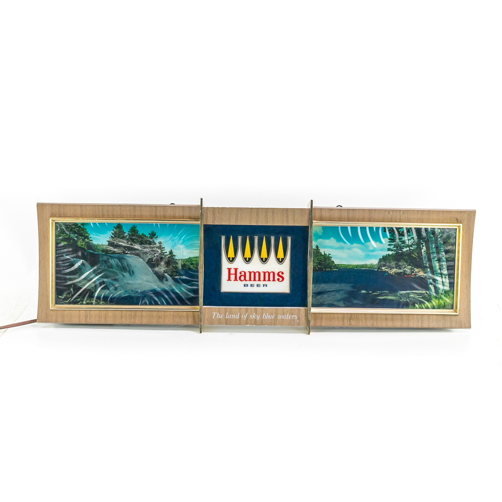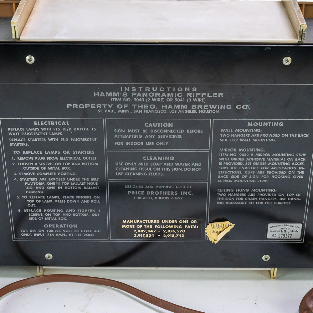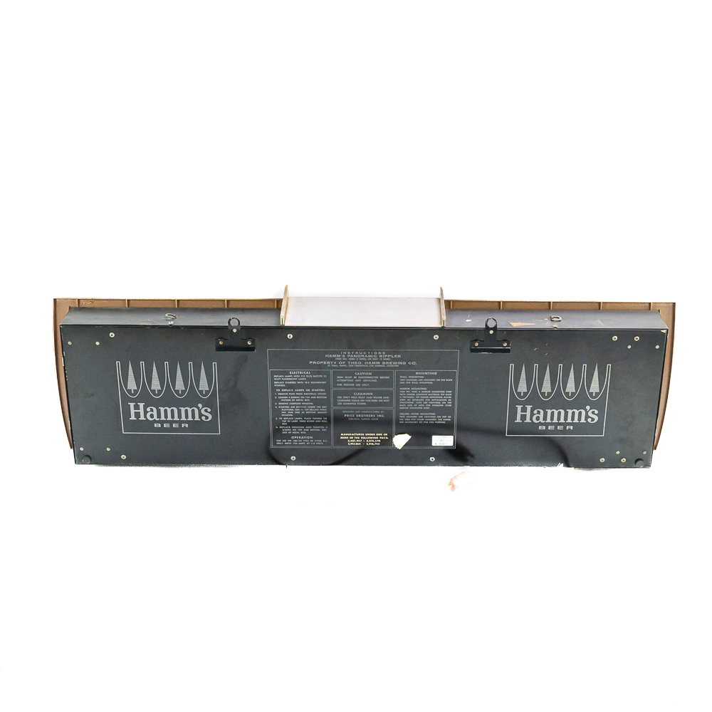 Rare 1965 Hamm’s Beer Rippler Motion Sign, needs new light bulbs, but Motion function appears fully functional. Display is in good condition with light wear noticed on edges, and a slight crack in the top right corner of the display. Scenes also in good condition, with left side beginning to show wrinkling. Beautiful piece for any and all Breweriana collectors! Measures approx. 17″ H x 40″L x 5″ W. See photos and bid accordingly.