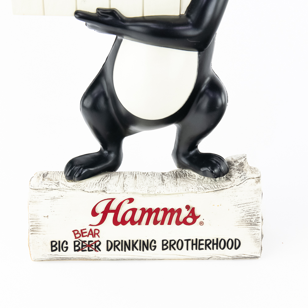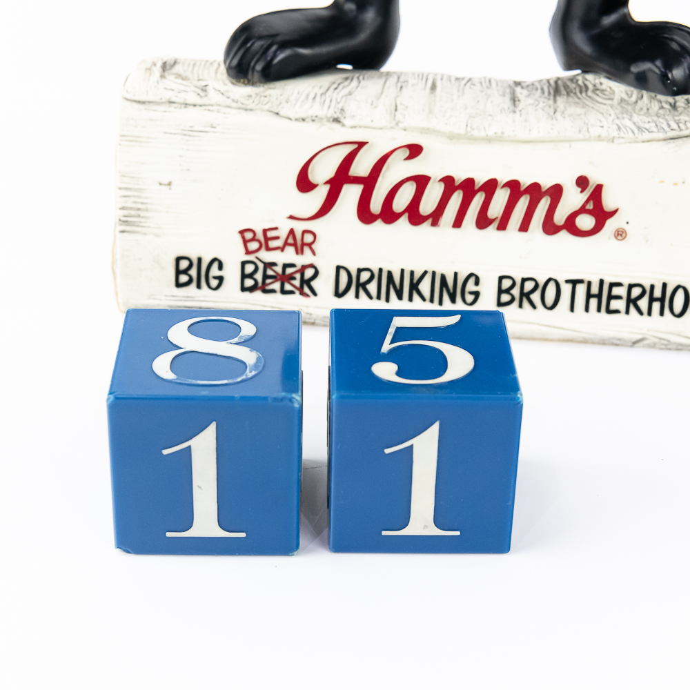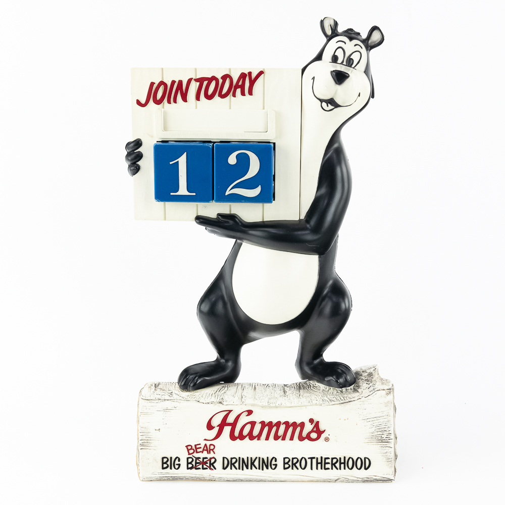 Hamm’s Plastic Statue “Big Bear Drinking Brotherhood”Calendar in good condition. Includes date cubes, missing month tiles. 16″x9″x3”
