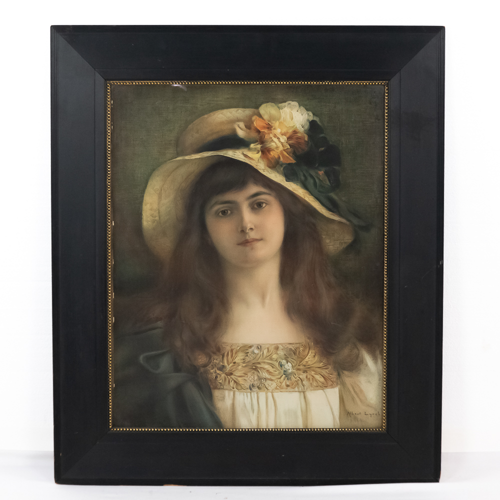 “Alice” framed Victorian print approximately 33.75″t x 28.5″l. Artist signed Albert Lynch bottom right corner and in good overall condition with some cosmetic blemishes present indicative of age and wear including minor chips and scratches on the frame and minor discoloration in areas. Perfect addition to your home or office; please use photos to judge condition and bid accordingly.