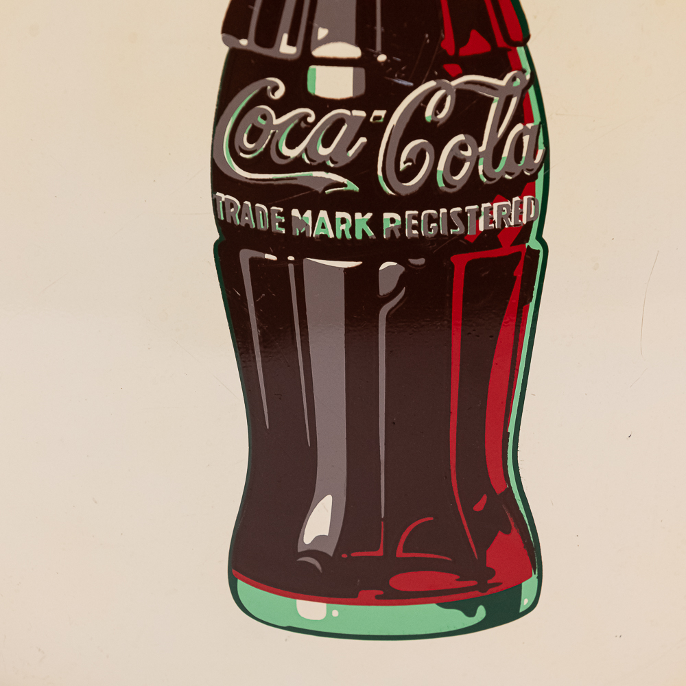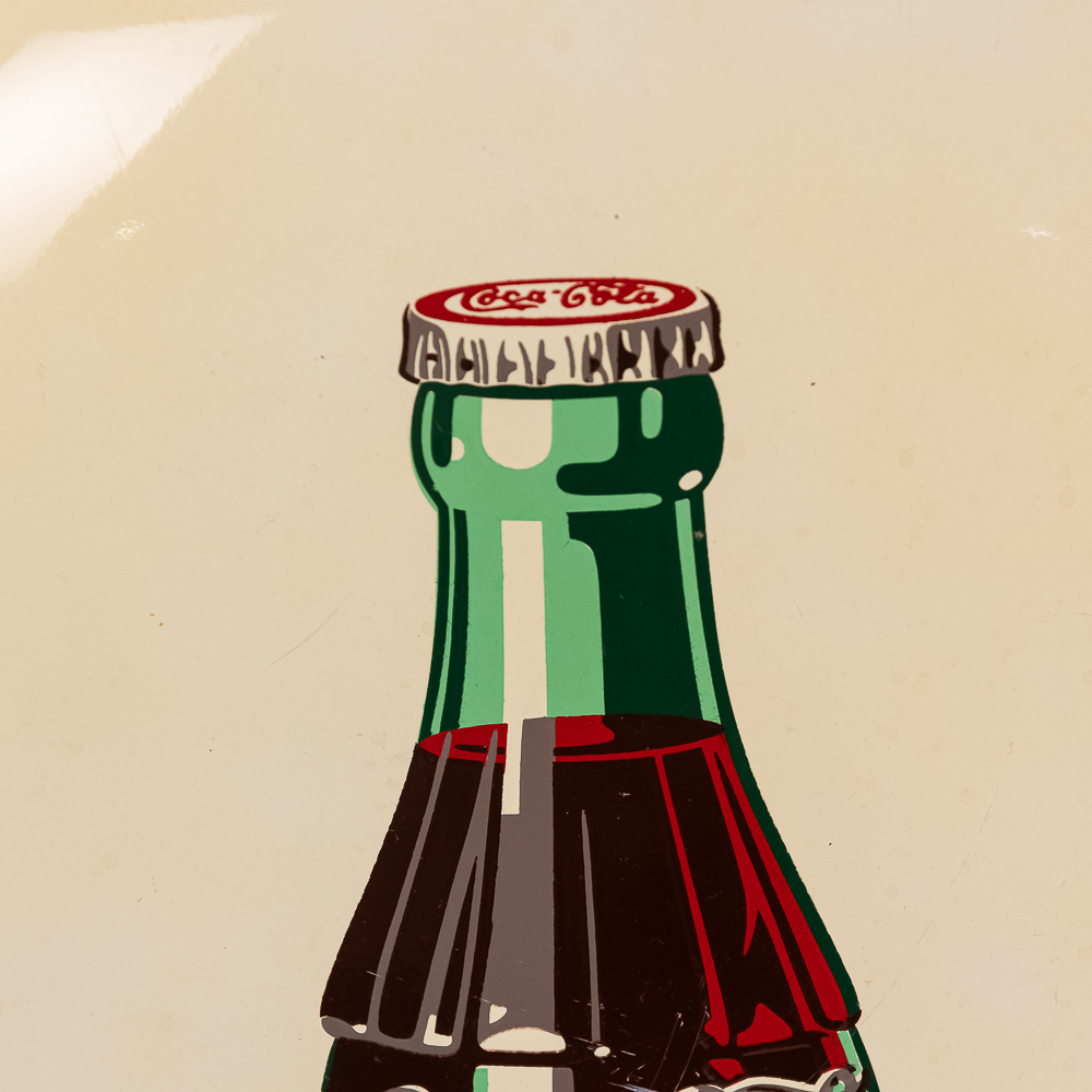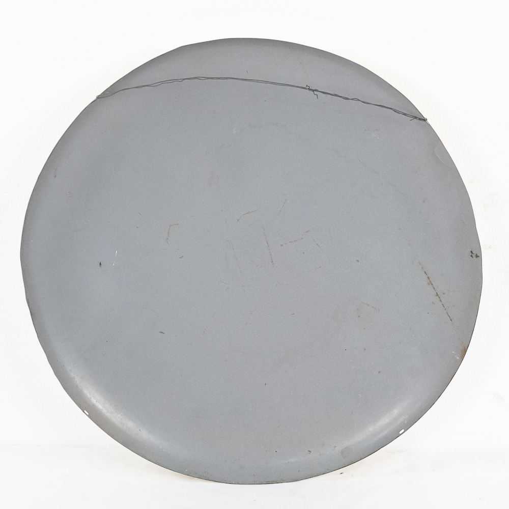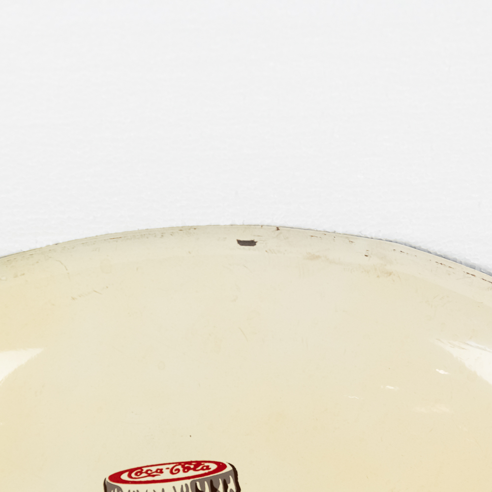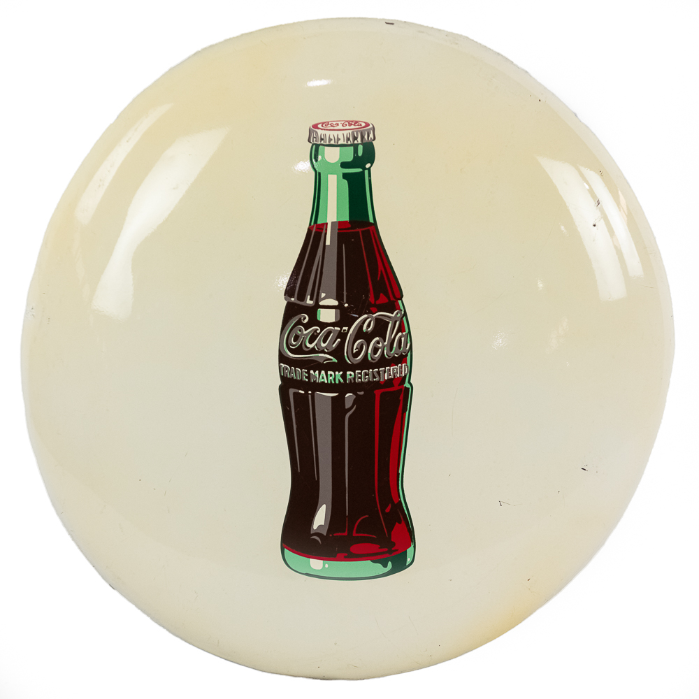These tin white painted button signs are hard to find, especially in this condition. A small ripple with touch up on the curve on the left side and a few small chips on the right side and a few small chips on the right side area, otherwise in very good condition. Dated 11-40. Measures approx. 24″ in dia.
