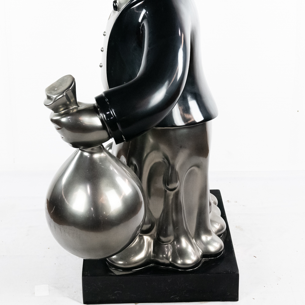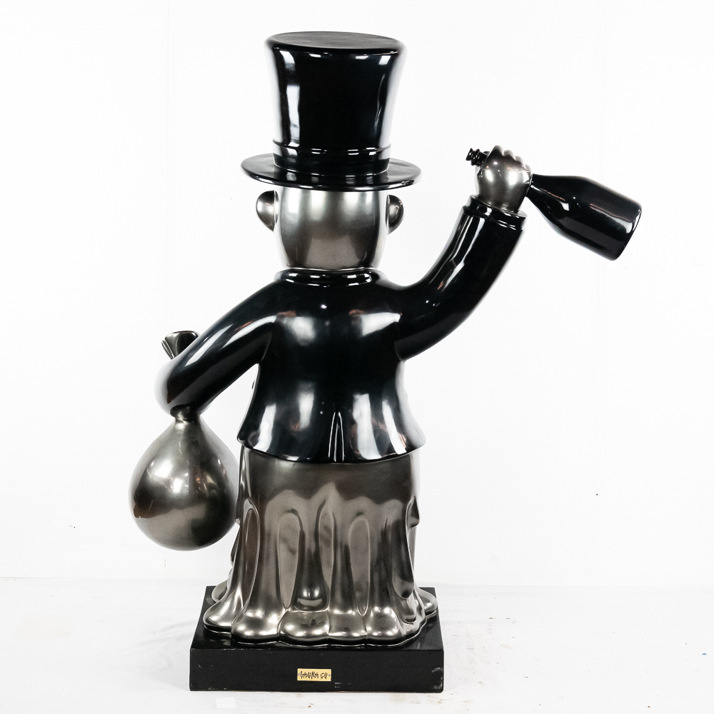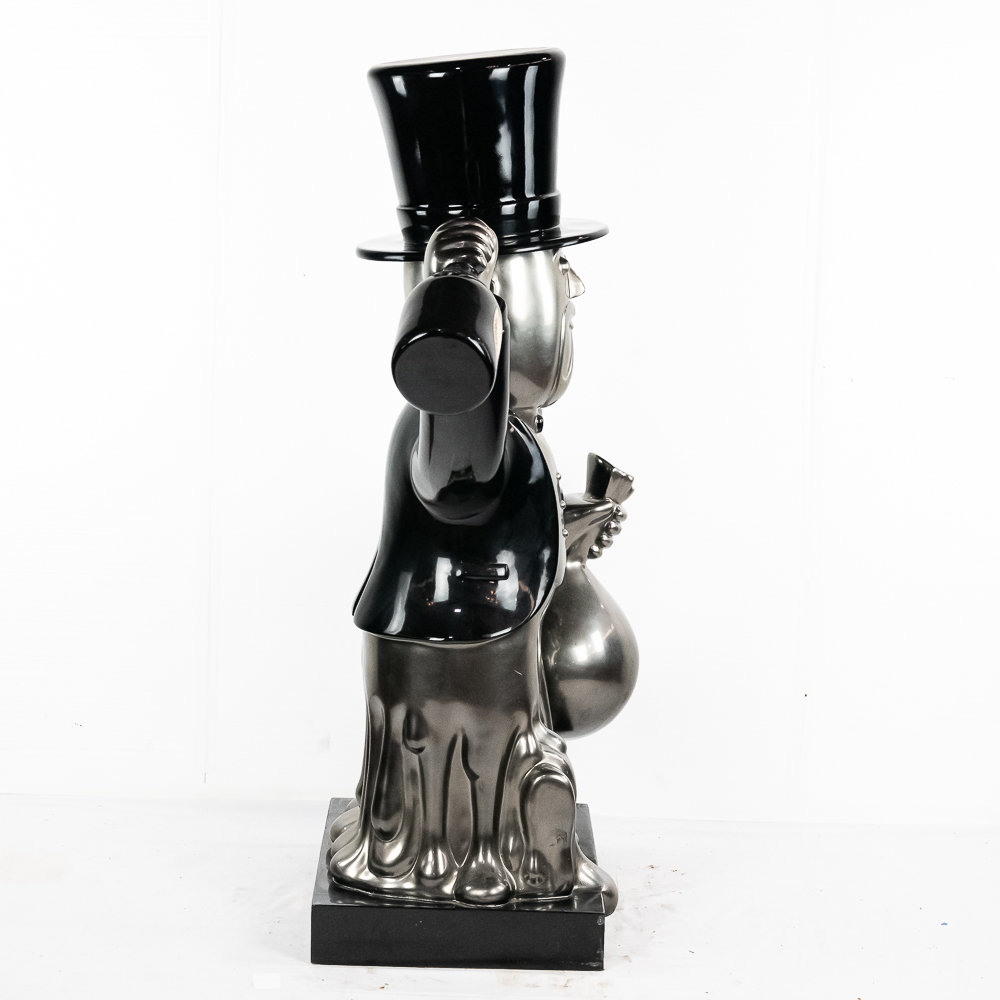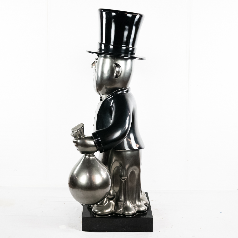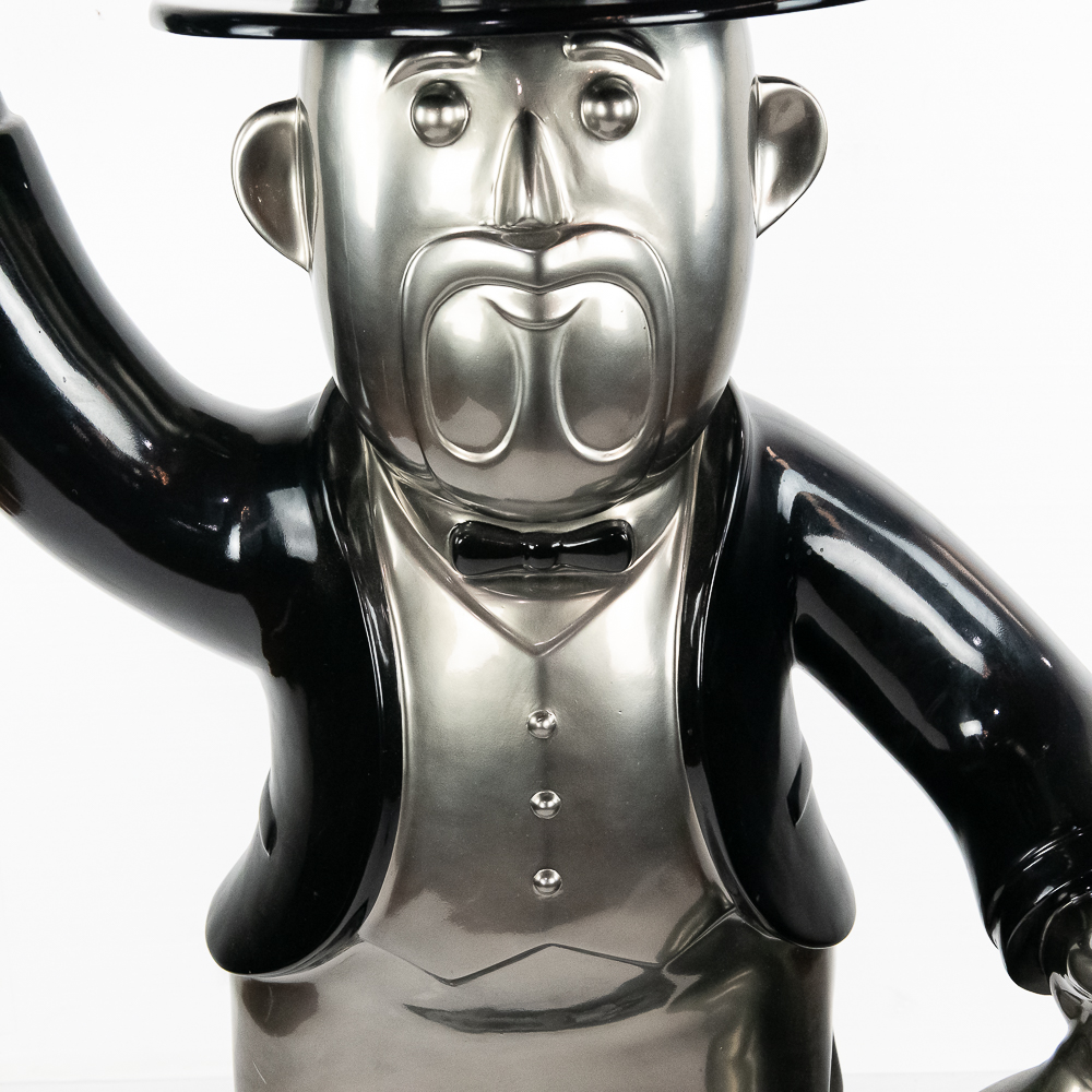 Life size sculpture of the iconic Monopoly Man, Mr. Money Bags, by known pop artist Laura Curiel. Statue is done in fiberglass and is in VG condition. Stands 61″ tall, 20″ wide, 46″ deep.