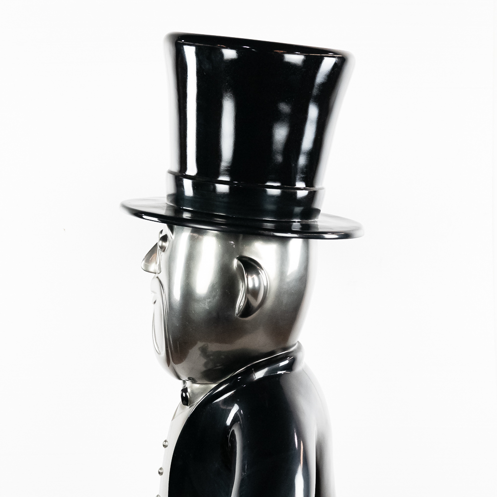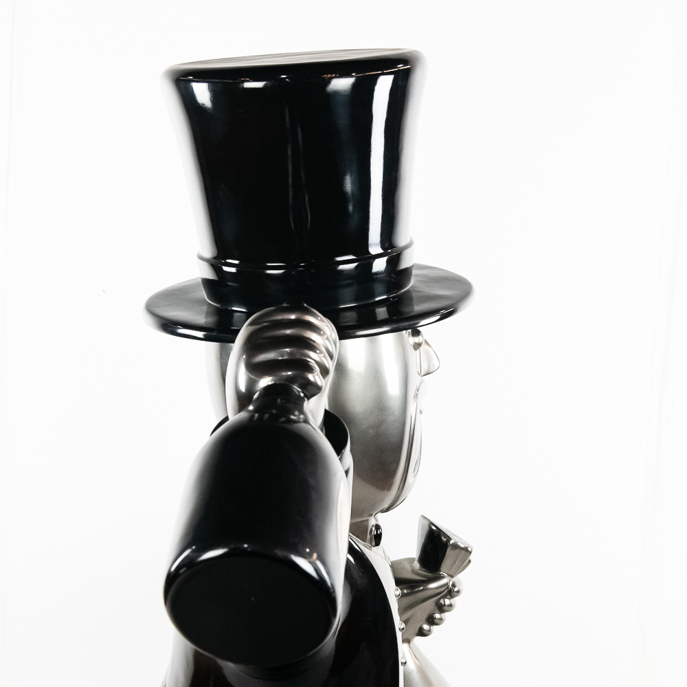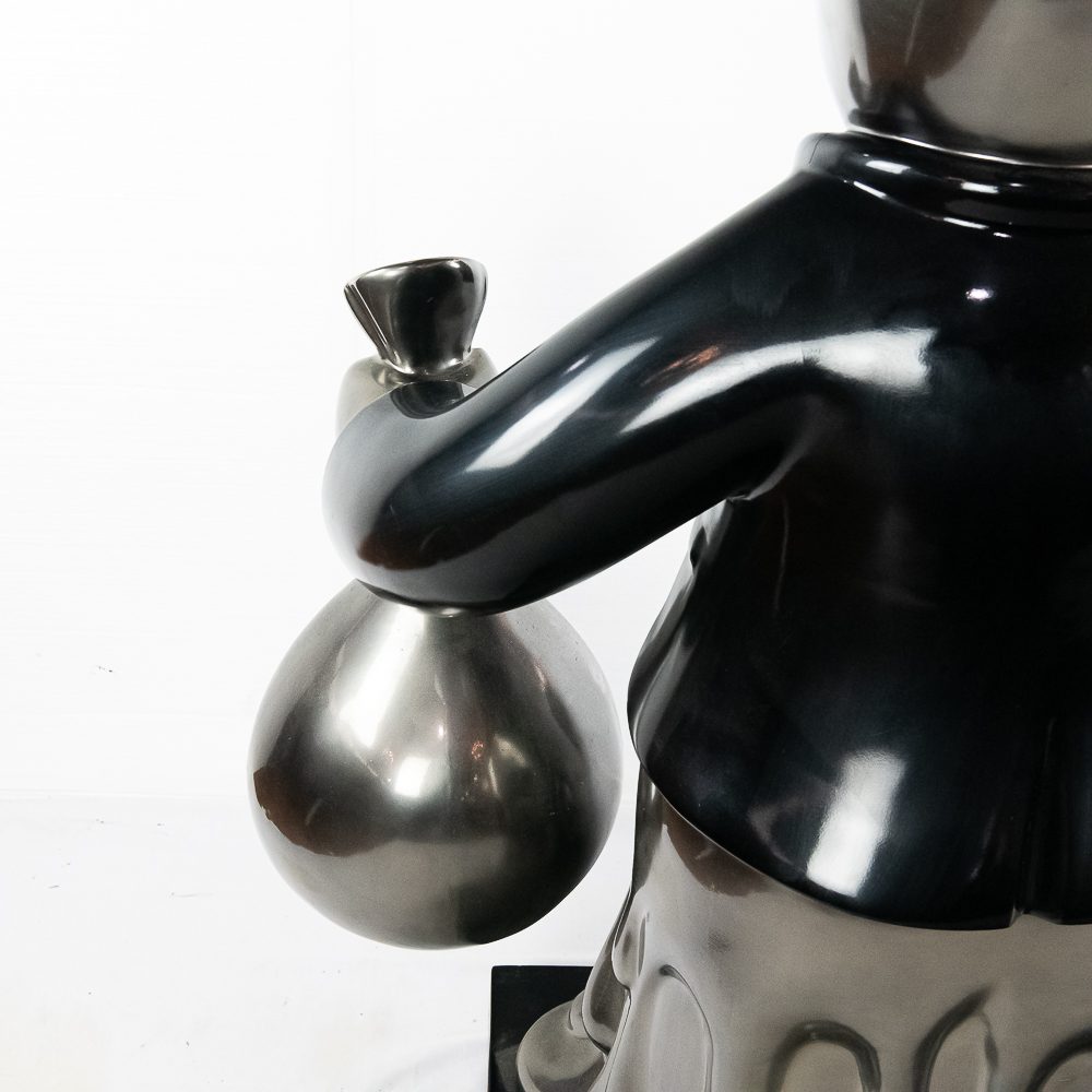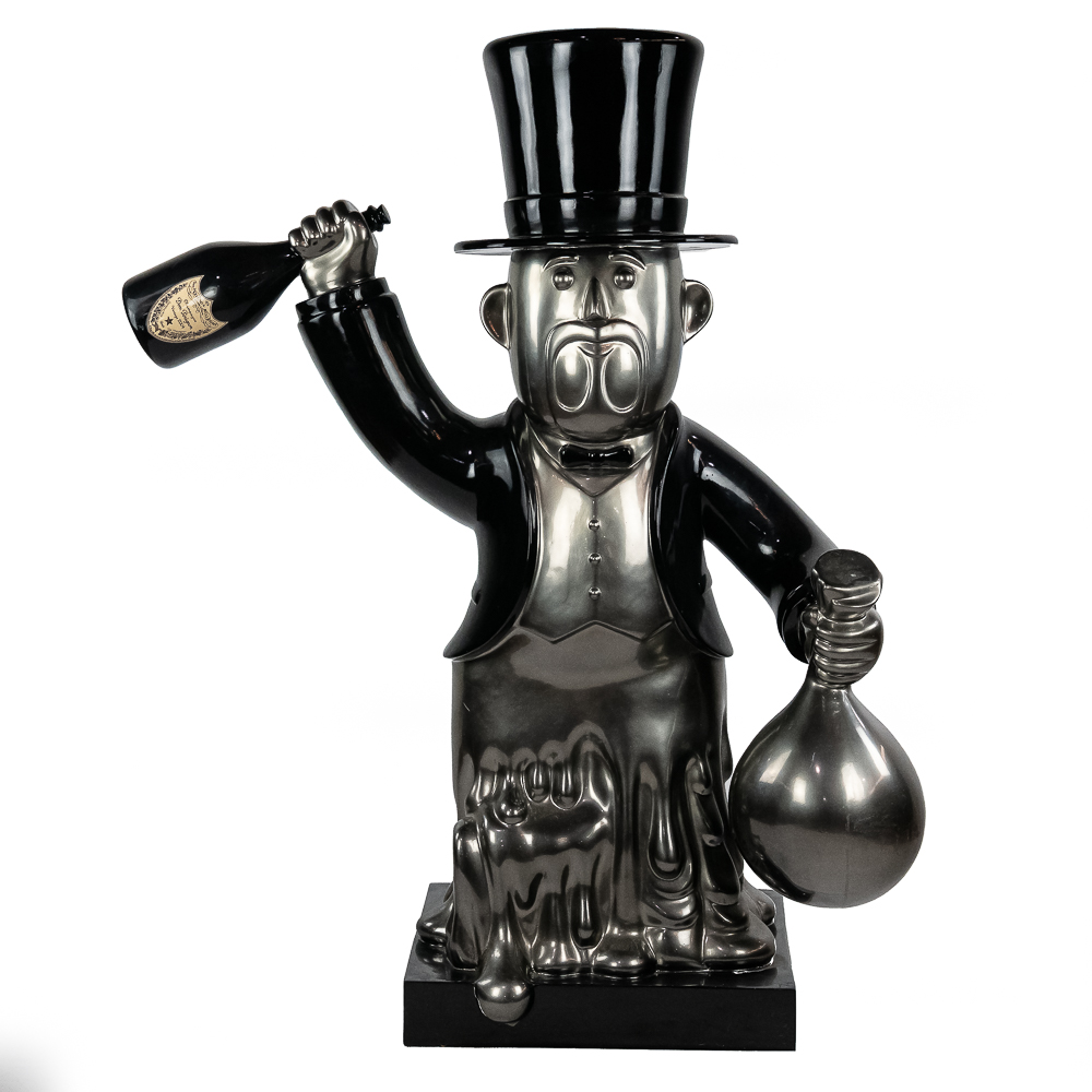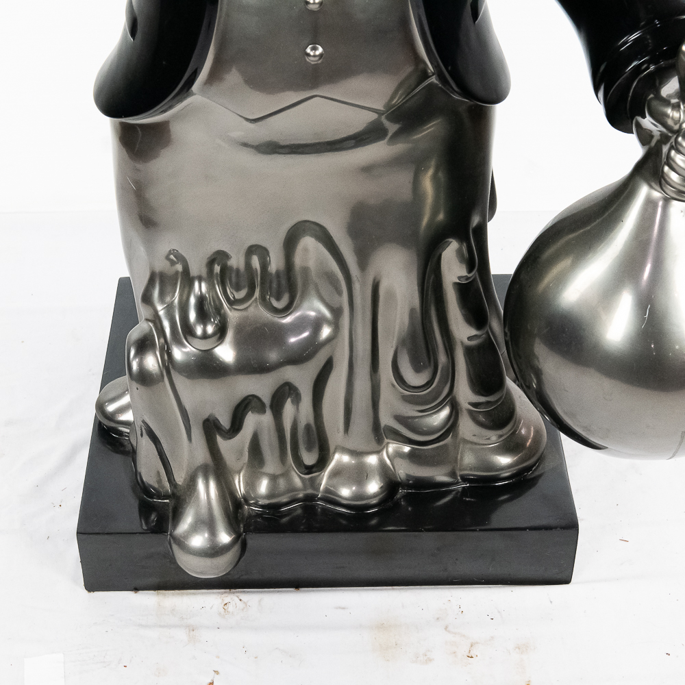 Life size sculpture of the iconic Monopoly Man, Mr. Money Bags, by known pop artist Laura Curiel. Statue is done in fiberglass and is in VG condition. Stands 61″ tall, 20″ wide, 46″ deep.