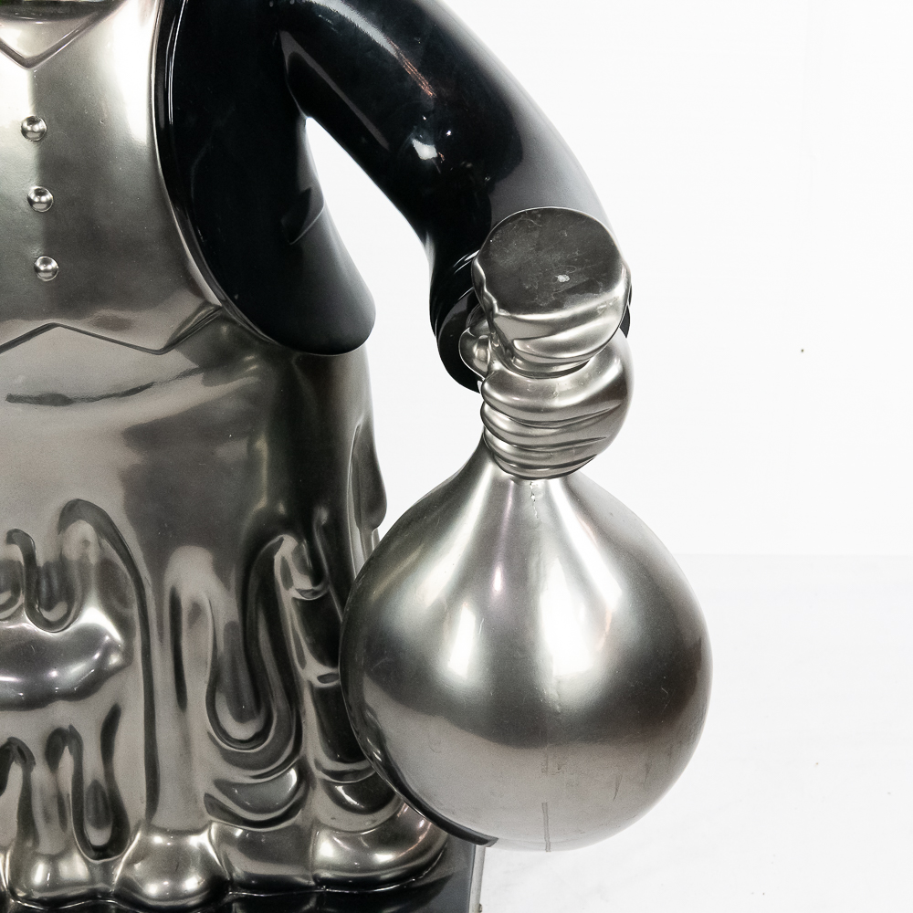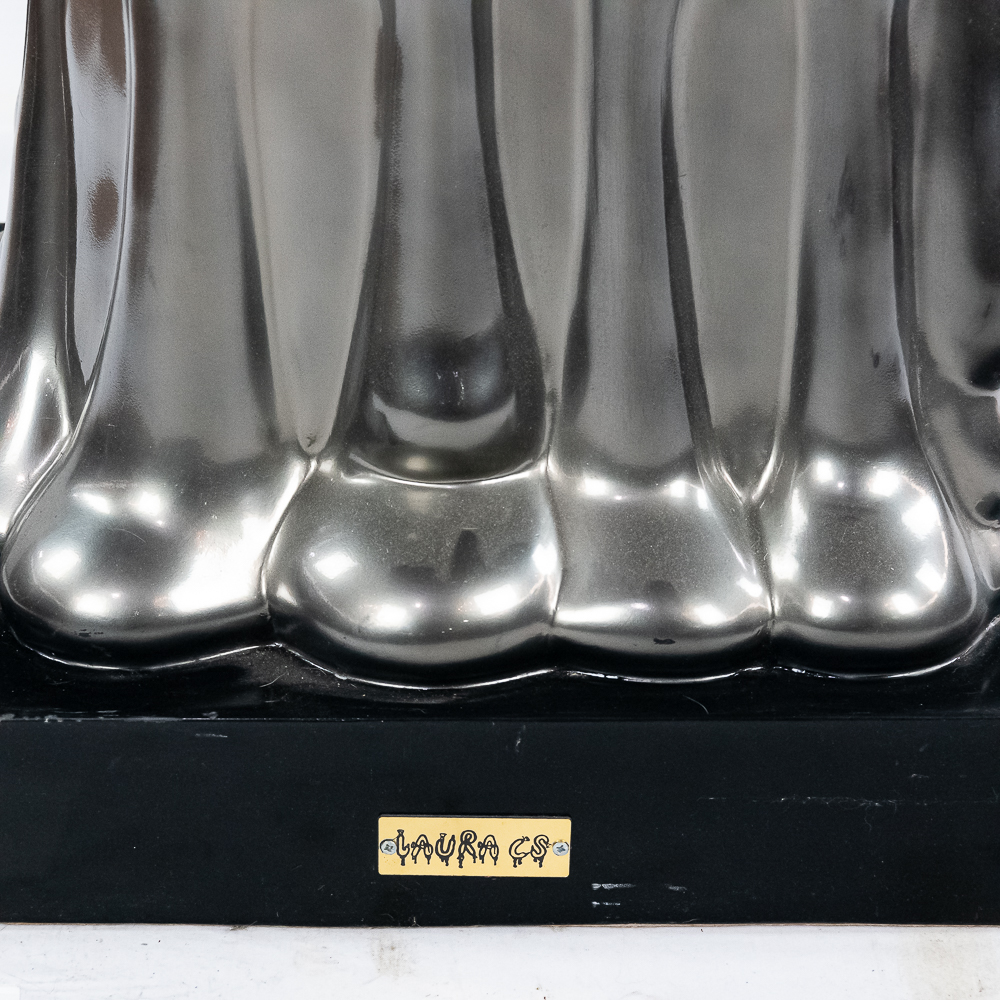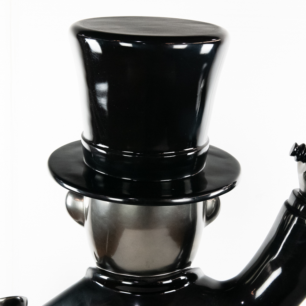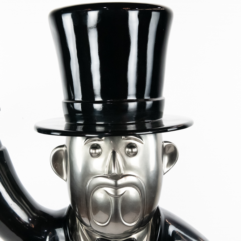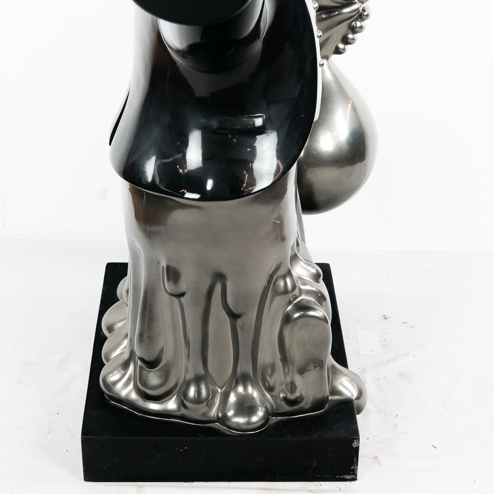Life size sculpture of the iconic Monopoly Man, Mr. Money Bags, by known pop artist Laura Curiel. Statue is done in fiberglass and is in VG condition. Stands 61″ tall, 20″ wide, 46″ deep.