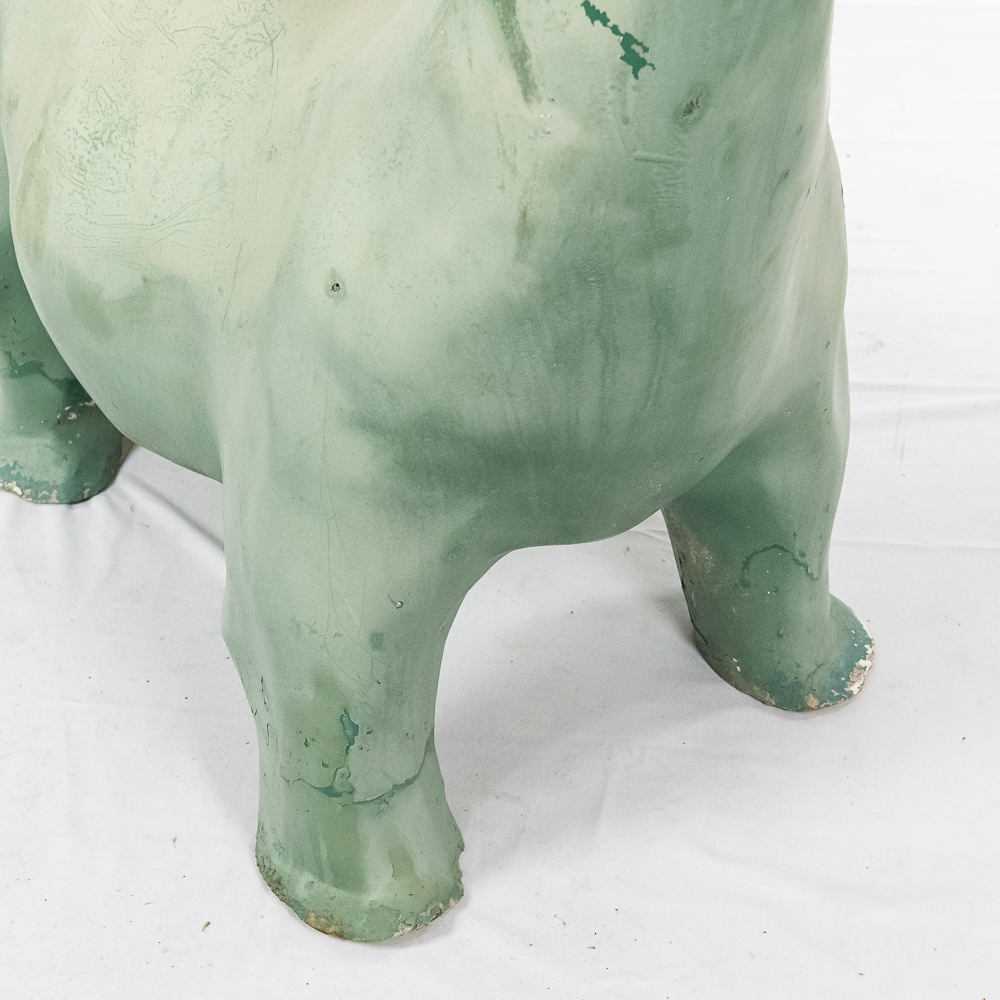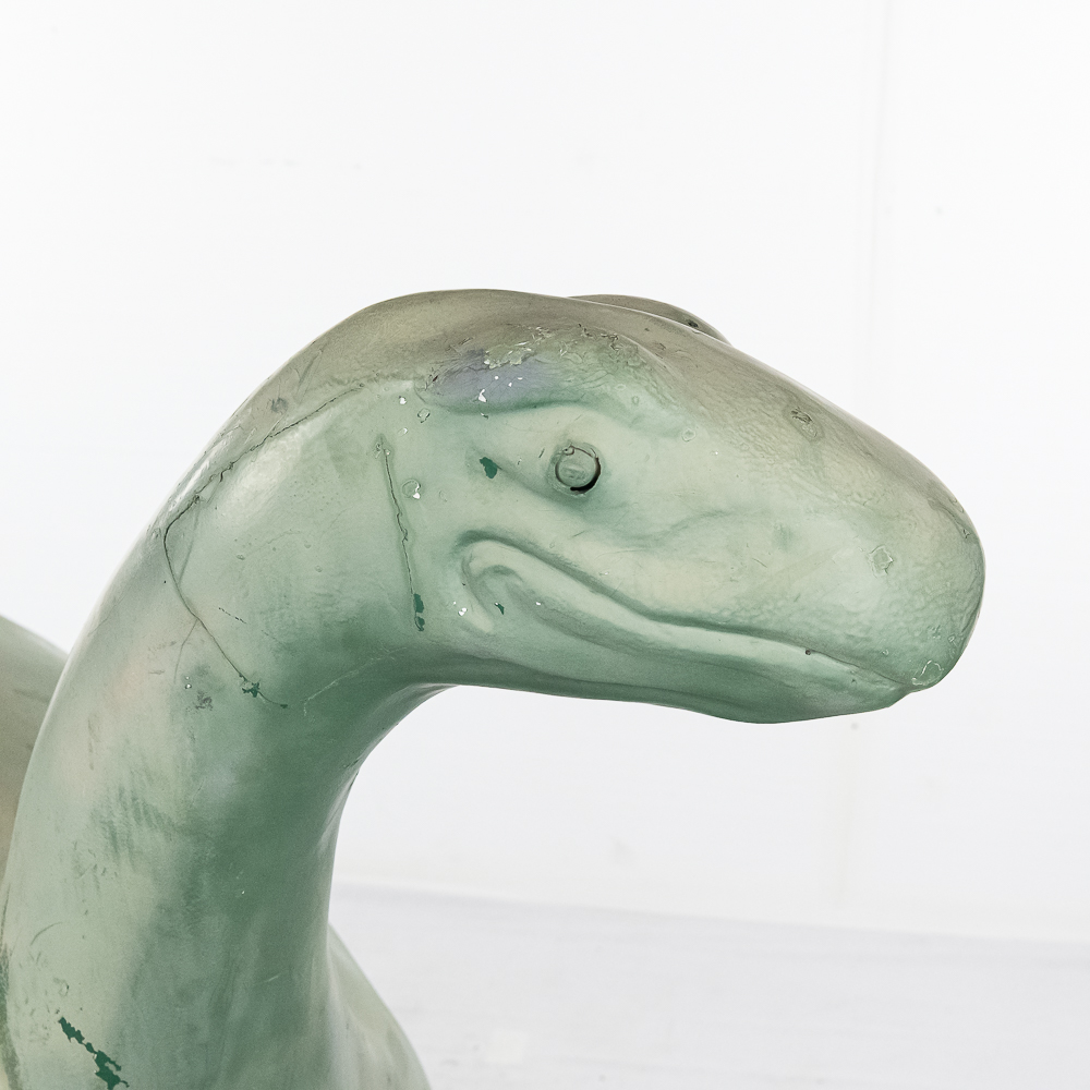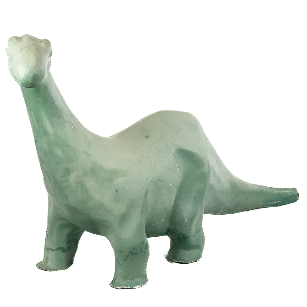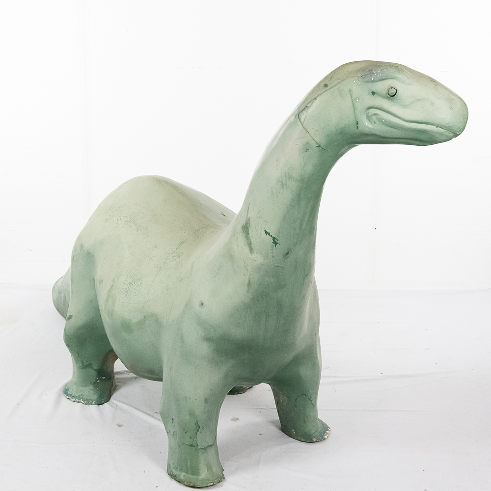 Fiberglass Dino the Dinosaur statue made for Sinclair Oil Co. These Apatosaurus Dino Statues Were Displayed At Sinclair Stations Beginning In 1964, And Were Manufactured By International Fiberglass Company of Venice California. This one is missing the end of his tail. Original green but faded paint. Measures 8′ long and 48″ tall.