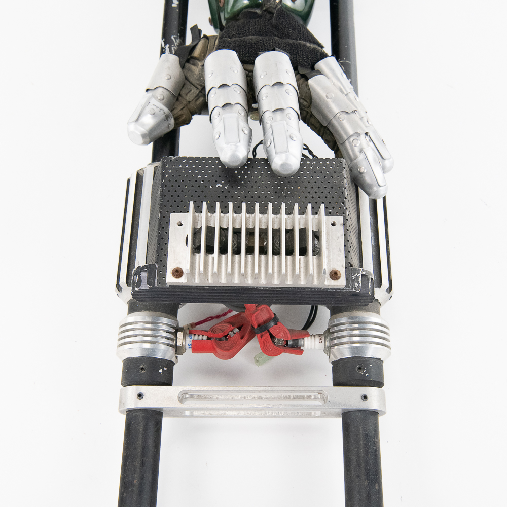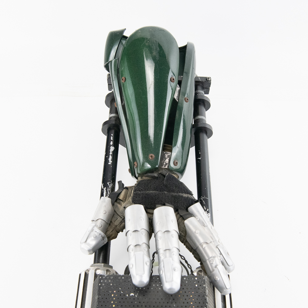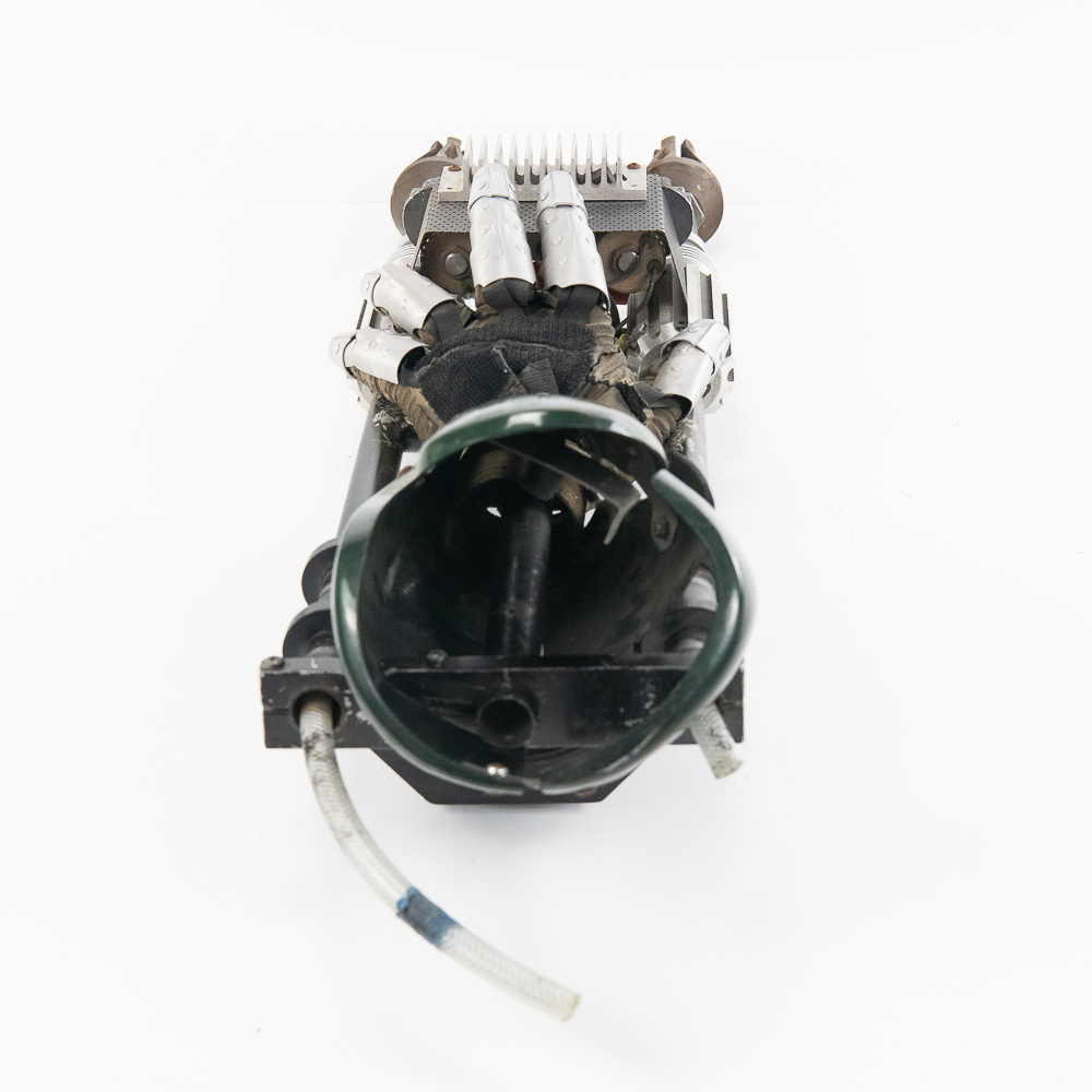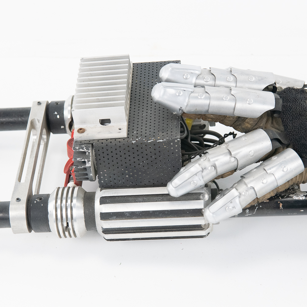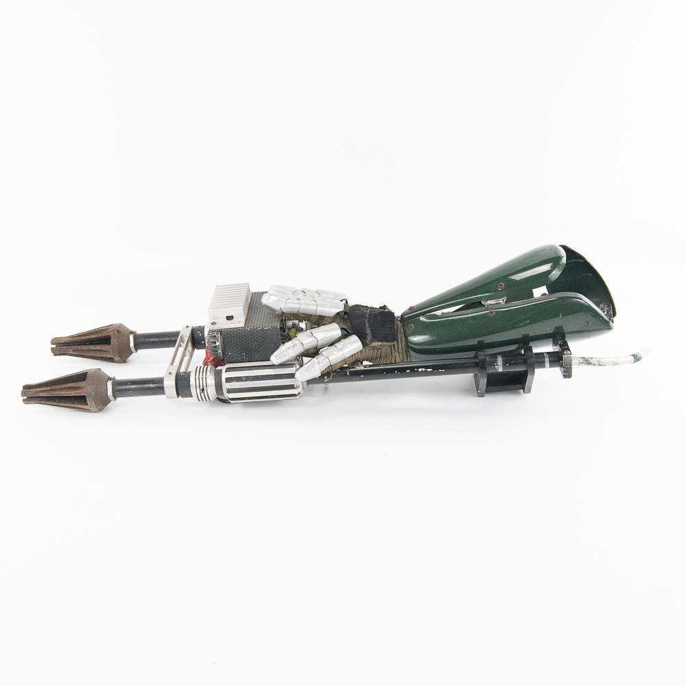 A very unique item that is a movie prop. Not sure if it ever did work but it sure looks like it could. Made of heavy metal materials. Has gas lines into item. Two coils with wires going to real spark plugs and a real porcelain ignition power supply. Awesome! Plastic protective arm guard is cracked, and glove shows some wear. What a great man cave decor!