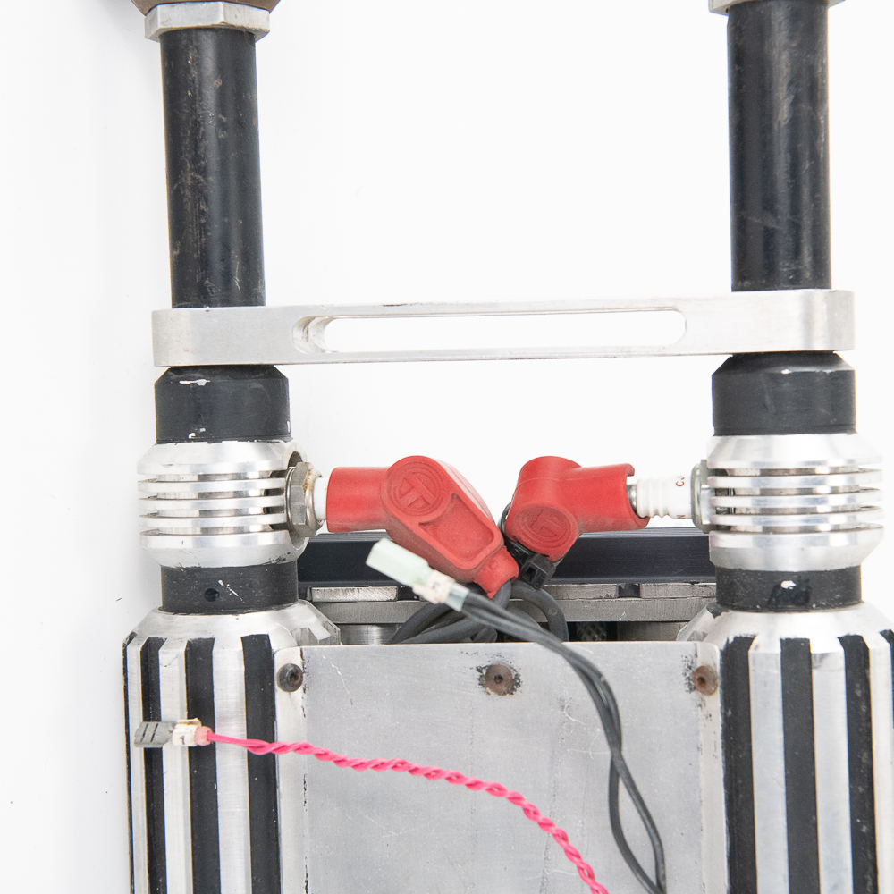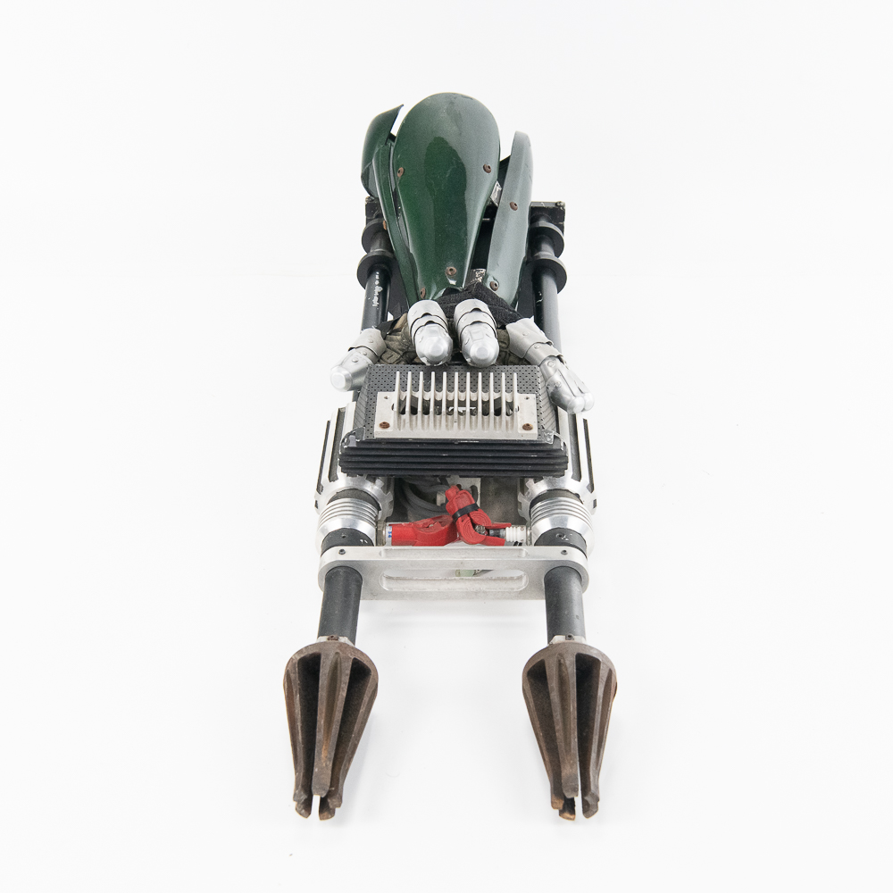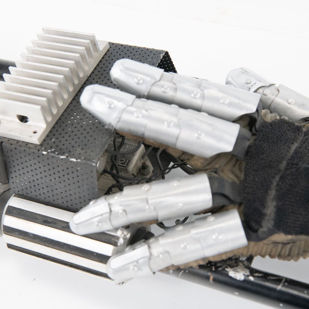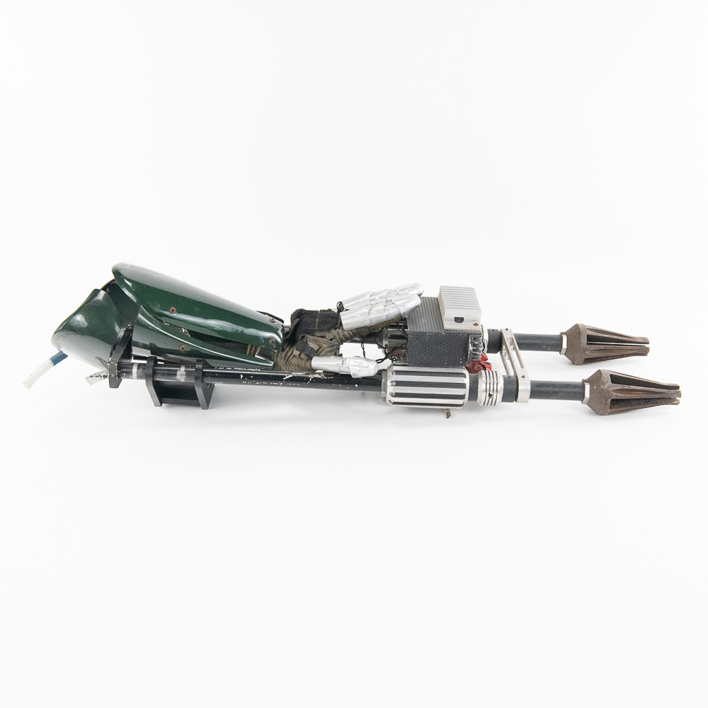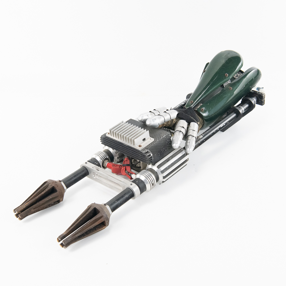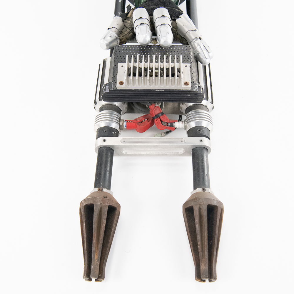 A very unique item that is a movie prop. Not sure if it ever did work but it sure looks like it could. Made of heavy metal materials. Has gas lines into item. Two coils with wires going to real spark plugs and a real porcelain ignition power supply. Awesome! Plastic protective arm guard is cracked, and glove shows some wear. What a great man cave decor!