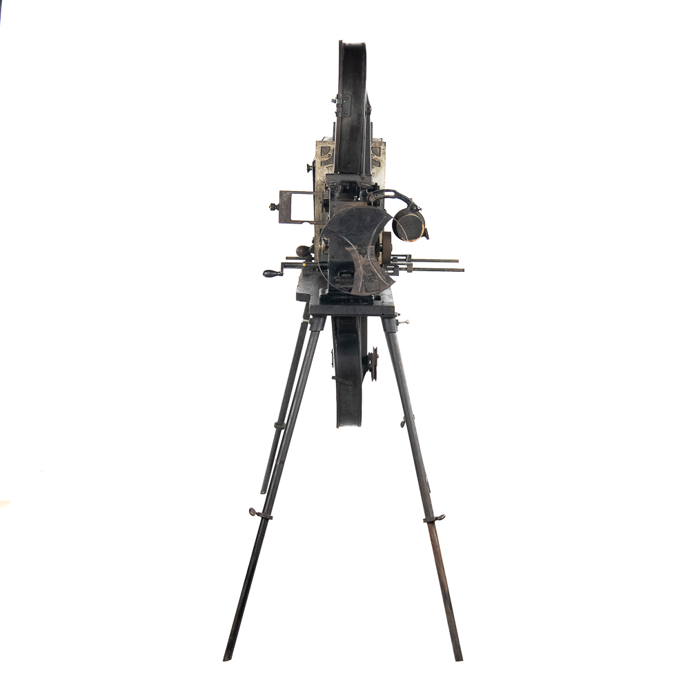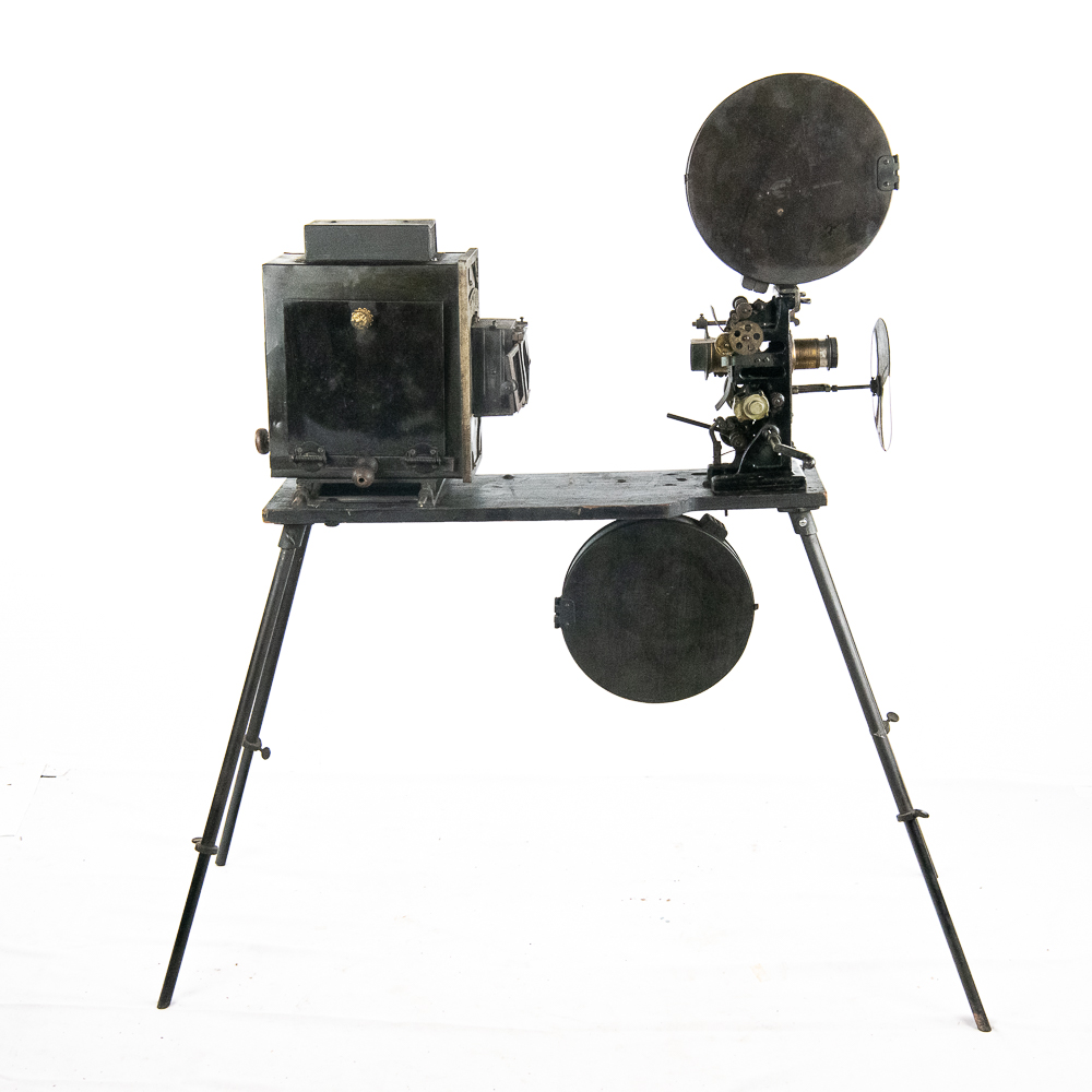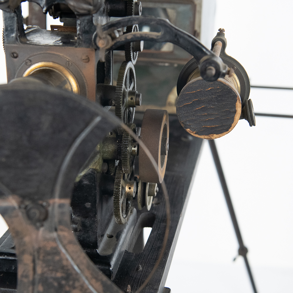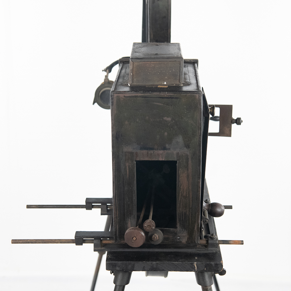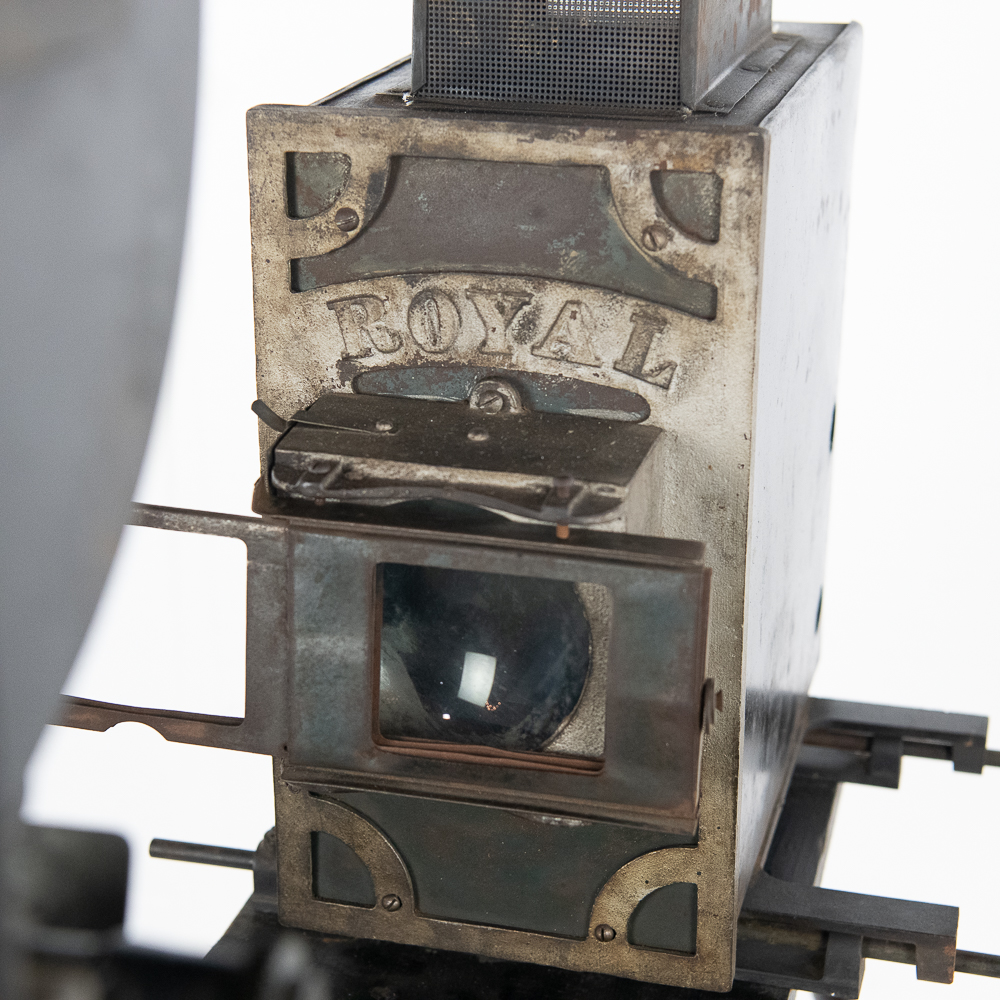 Before ‘Talkies’ there were silent movies and many would have been shown from this functioning machine. With an adjustable carbon arc lamp house and Magic Lantern slide carrier and lens, it’s mostly complete with the exception of the carbon arc rod holder. In as found condition – perfect candidate for a full restoration! Measures (assembled) approximately: 56″T X 37″L X 20″W