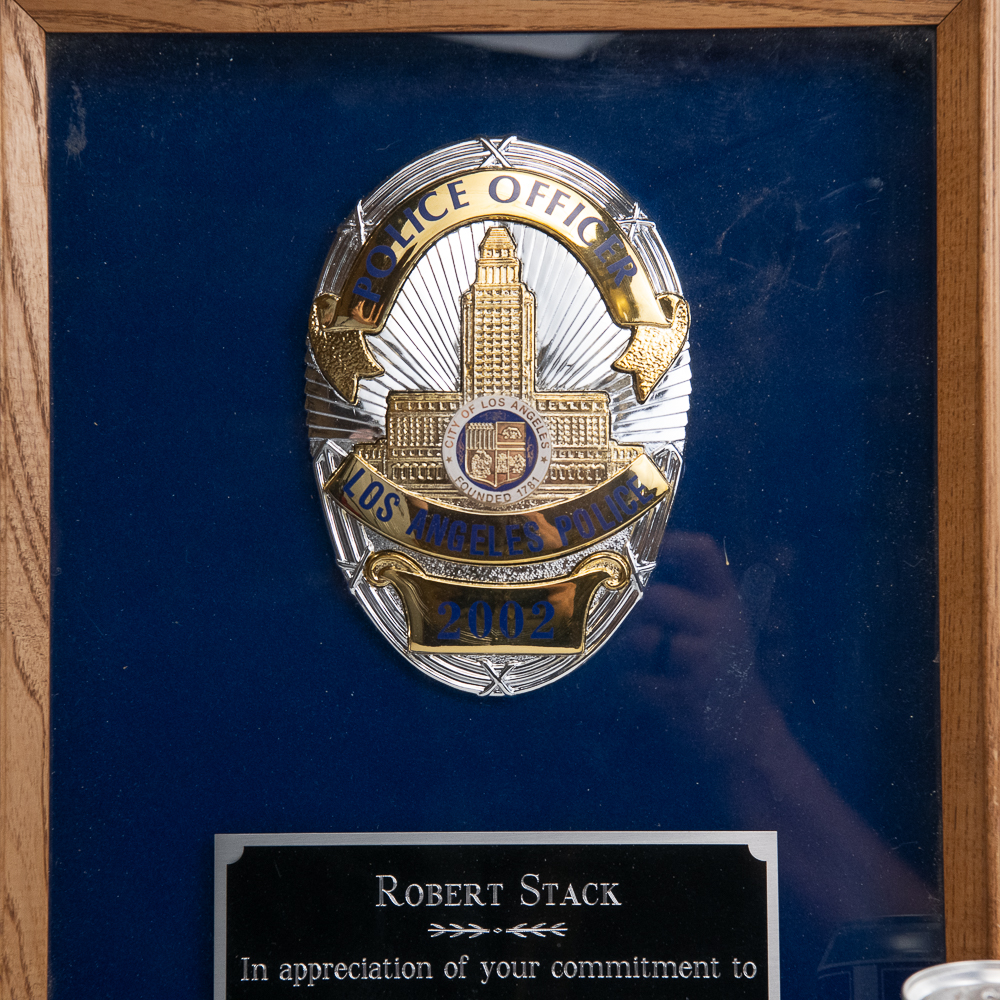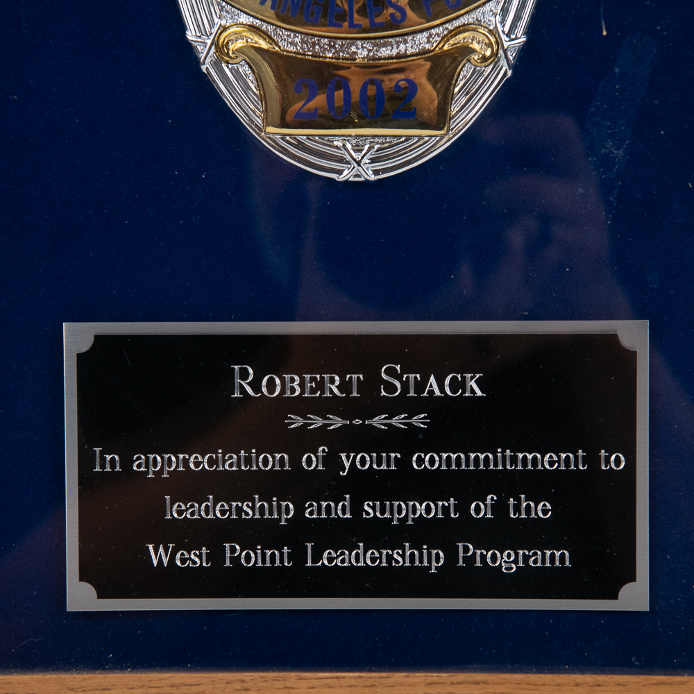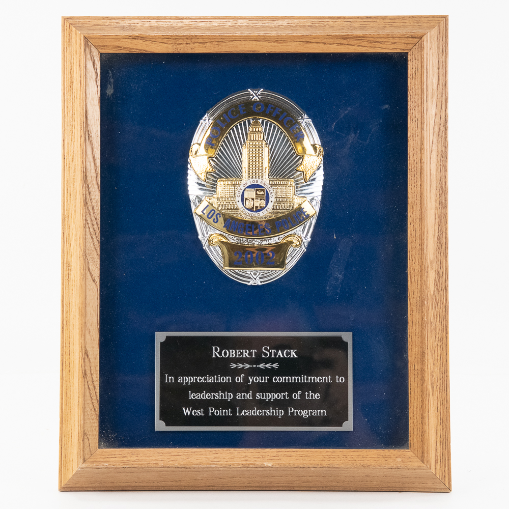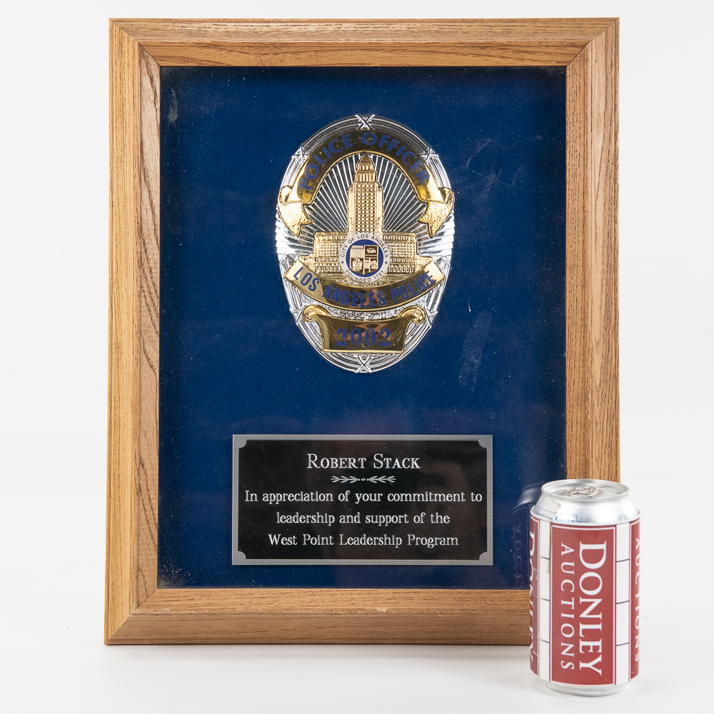 Actor Robert Stack LAPD Appreciation 14″ x 16.5″ Plaque with a 6.5″ badge in shadow frame. Like new.