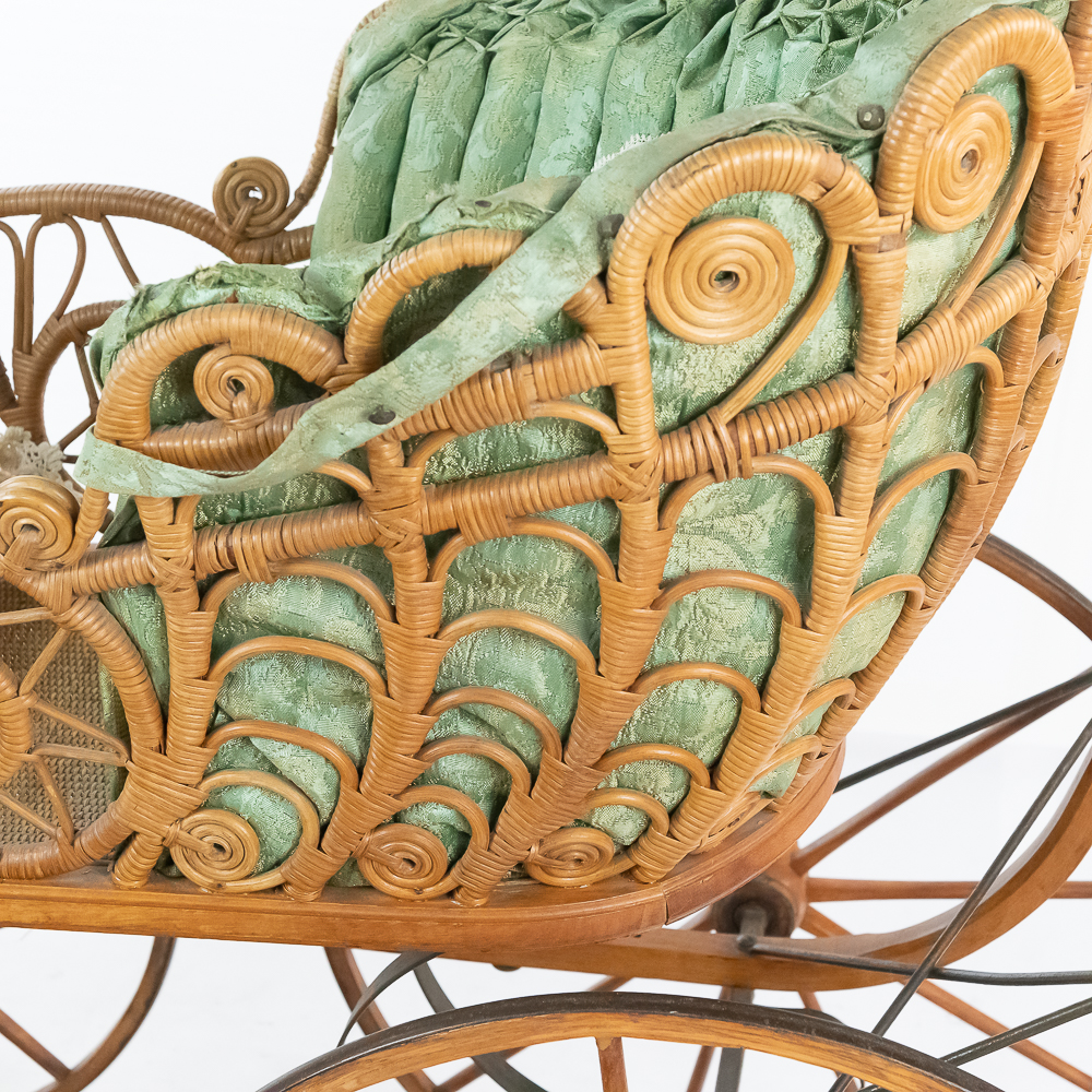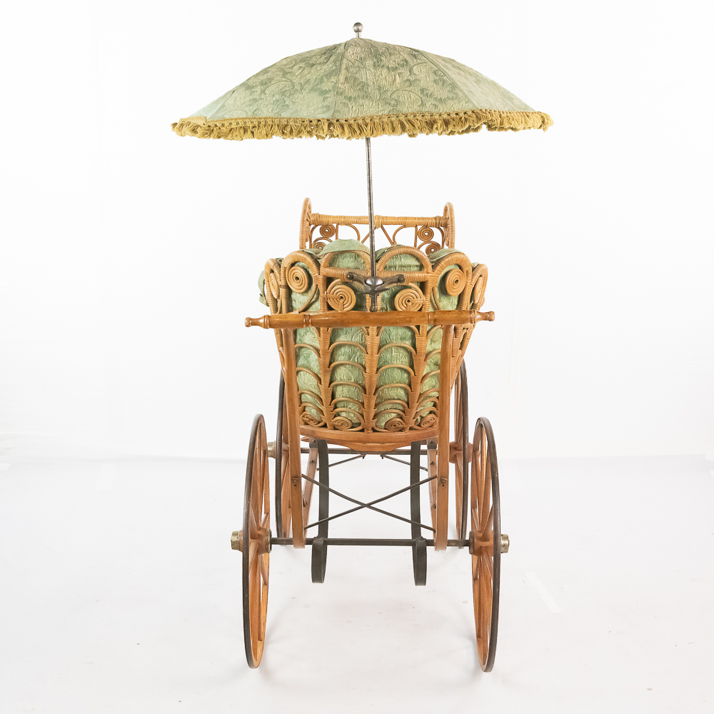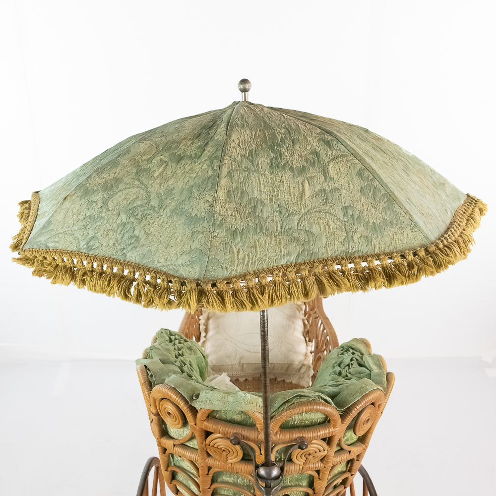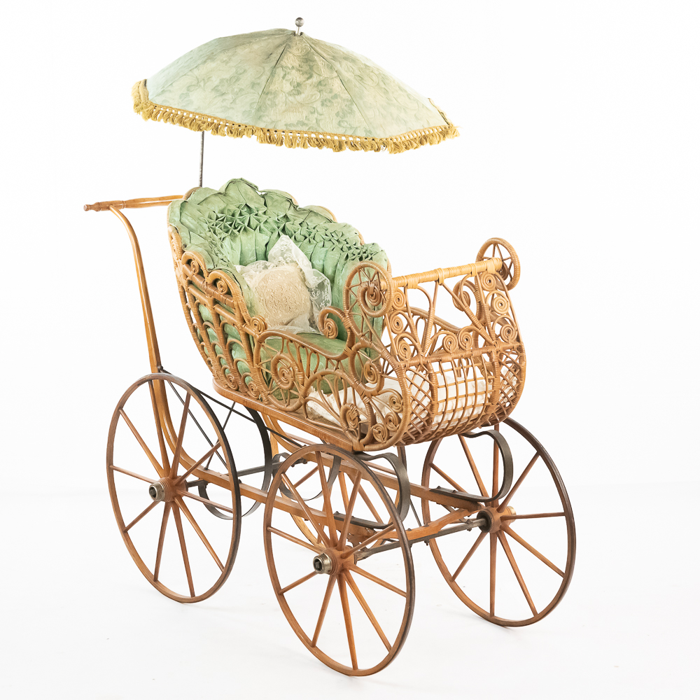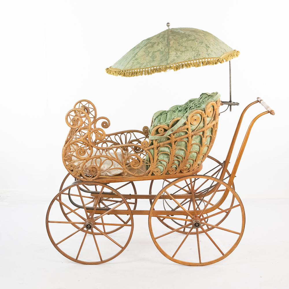 Eye catching ornate antique wicker baby carriage stroller. Features intricate detail, wood spoke wheels with metal treads,original floral fabric seat and parasol with brass appointments. Approximately 55″t x 24″d x 55″l and in good overall condition with minimal age and wear noted. Perfect addition to your collection, please use photos to judge condition and bid accordingly.