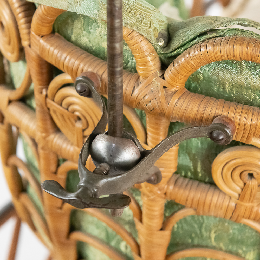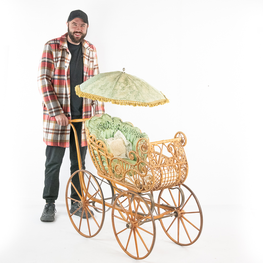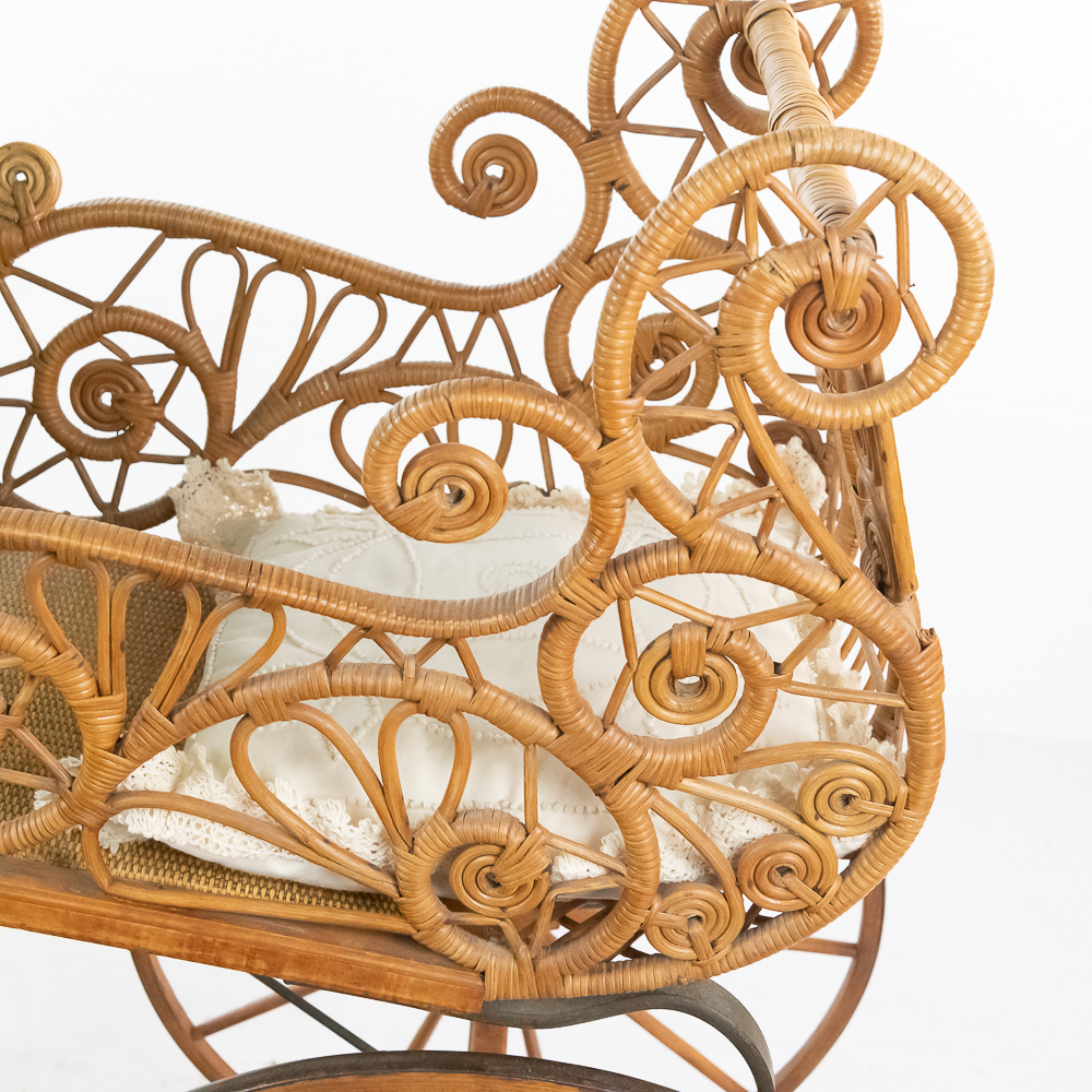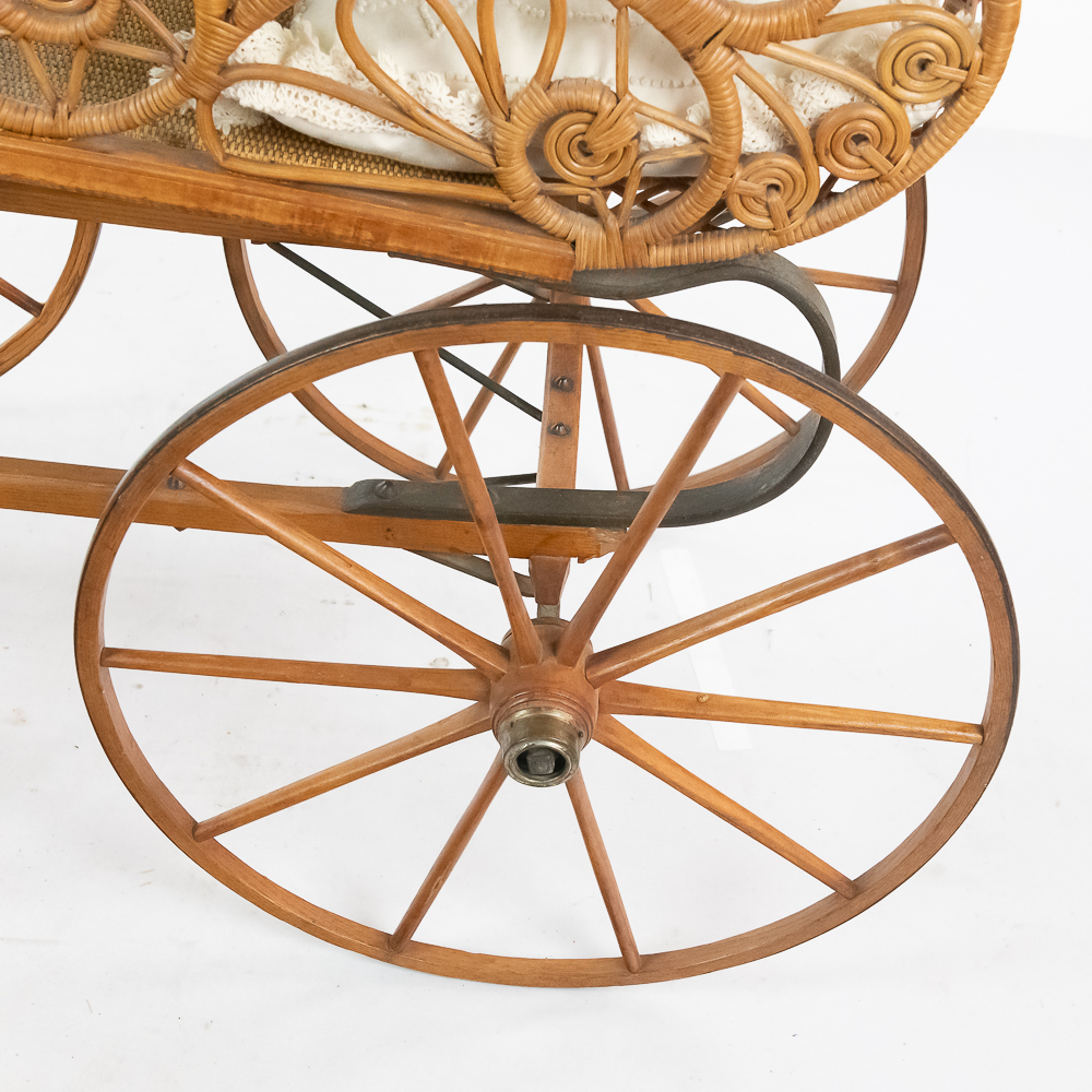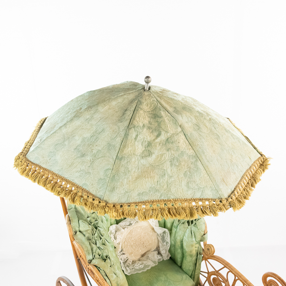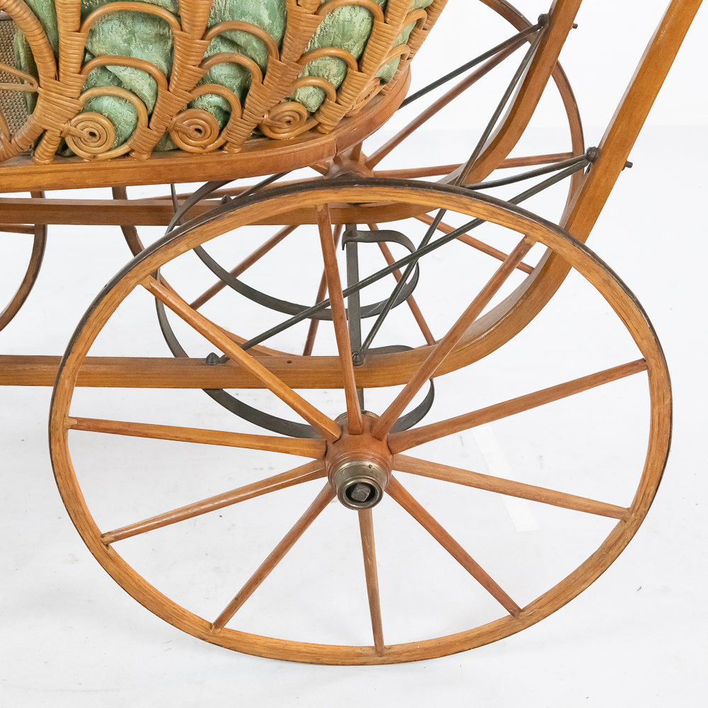 Eye catching ornate antique wicker baby carriage stroller. Features intricate detail, wood spoke wheels with metal treads,original floral fabric seat and parasol with brass appointments. Approximately 55″t x 24″d x 55″l and in good overall condition with minimal age and wear noted. Perfect addition to your collection, please use photos to judge condition and bid accordingly.