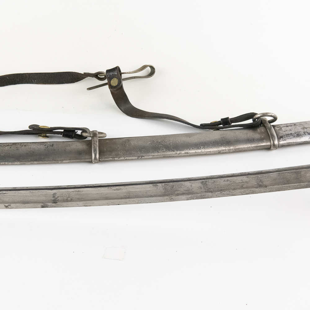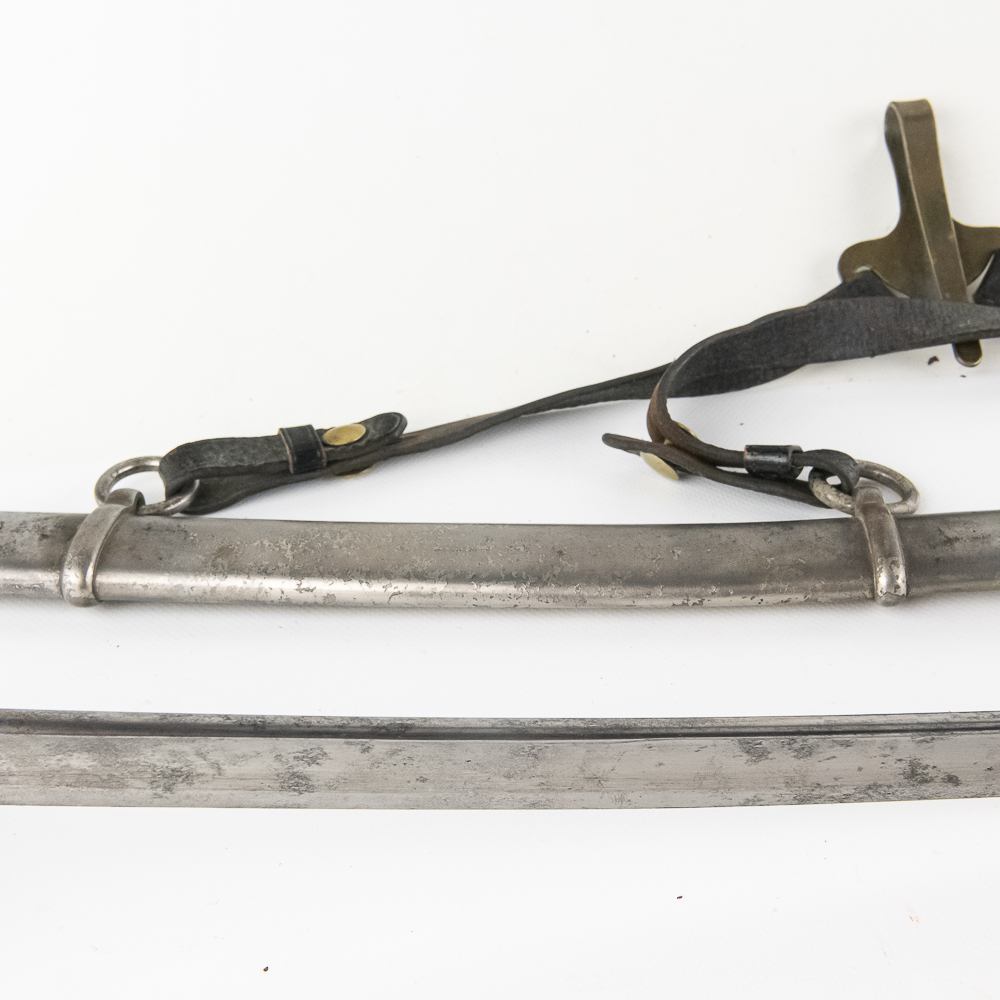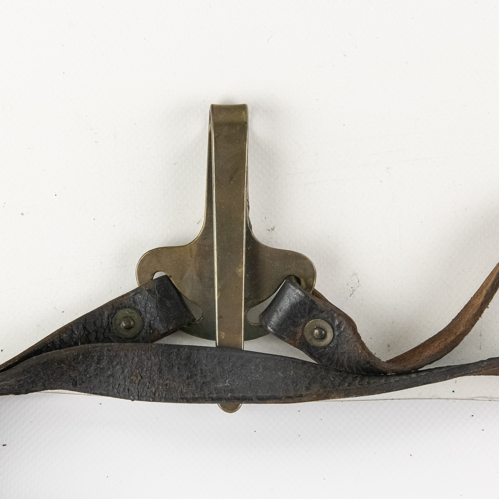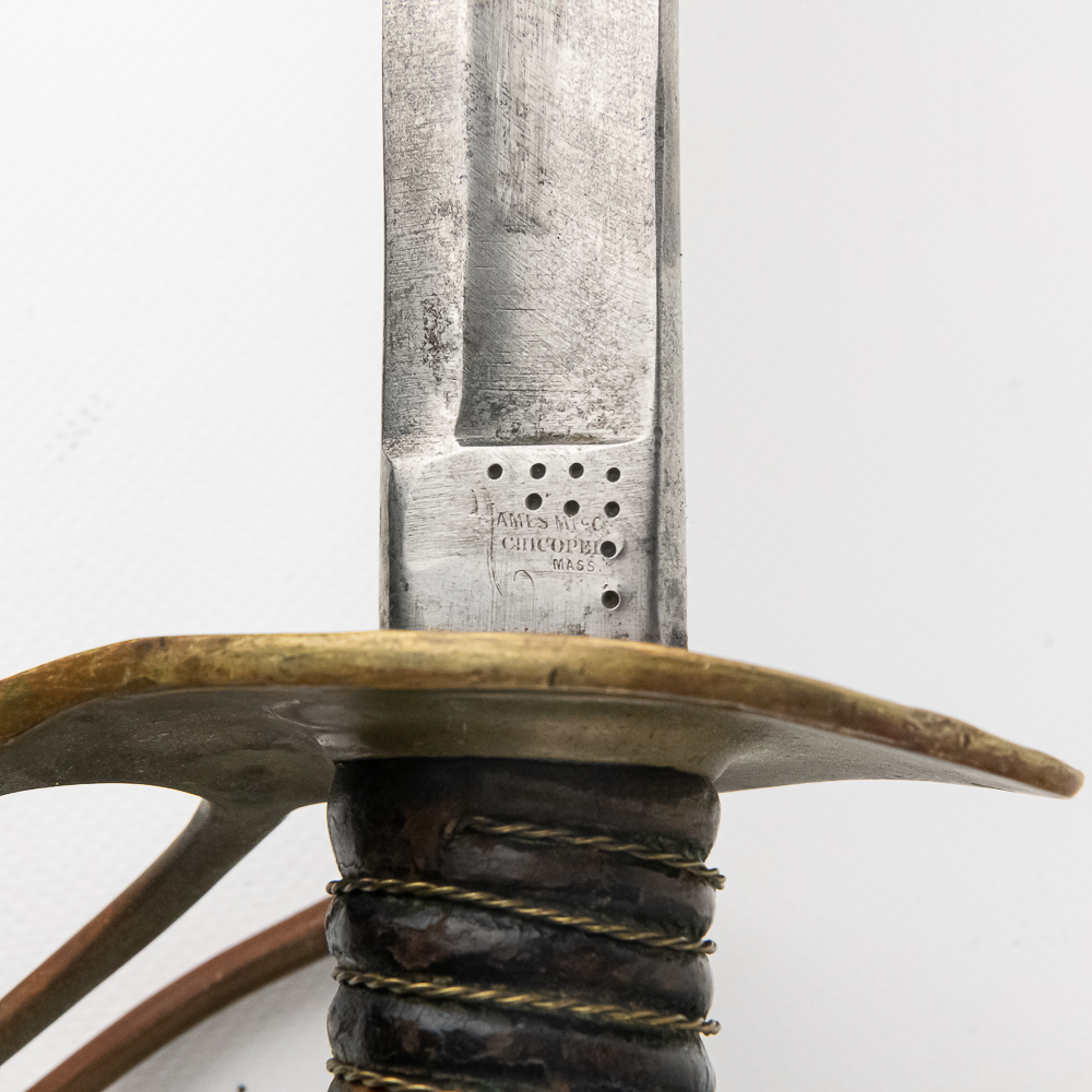 This sword with belt hangers is dated and marked Ames on blade ricasso with strange stamped dots. The dots may be a storage release from military use. Both sides have proofs and marks. The overall length is 42.25″ and 34.75″ blade. Blade is very bright and has series of nicks at 17″ out the further. Tips is good. The hangers are is amazingly good and servable condition. They show wear and green verdigris built up but they are ready for a torso or mannequin display. So many are fragile but not these hangers. The blade is bright with some nicks to middle of blade edge. The crossguard and hilt shows age and wear with a red hue to brass fittings. The leather and wire wrapped handle shows much wear and the wire very loose but still wrapped around. Scabbard has no dents or dings but looks like it is down to bare steel and was chromed a long time ago in our opinion. This is a very nice original set of hangers and sword.