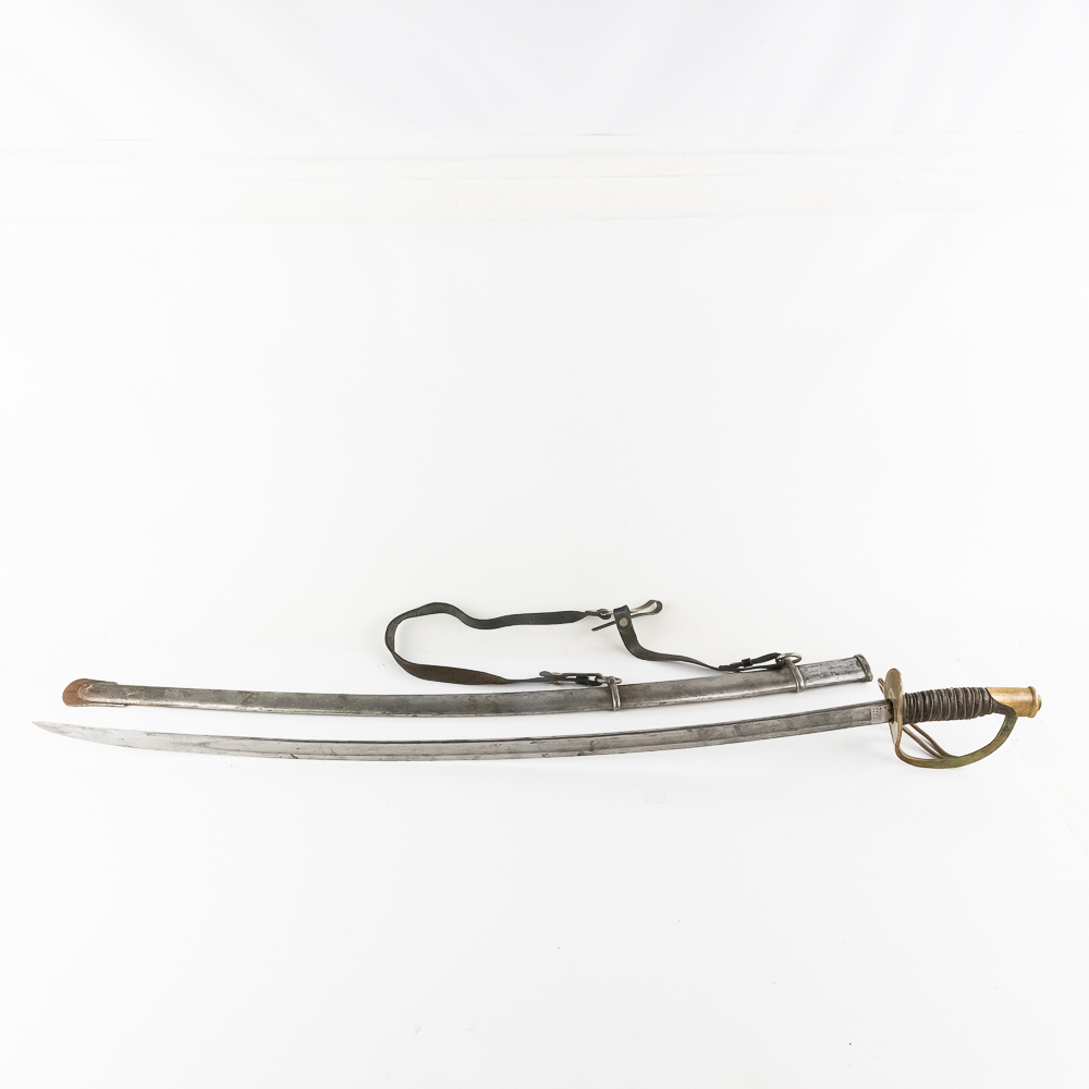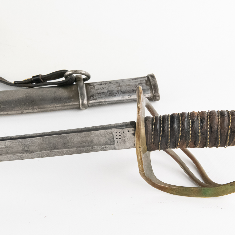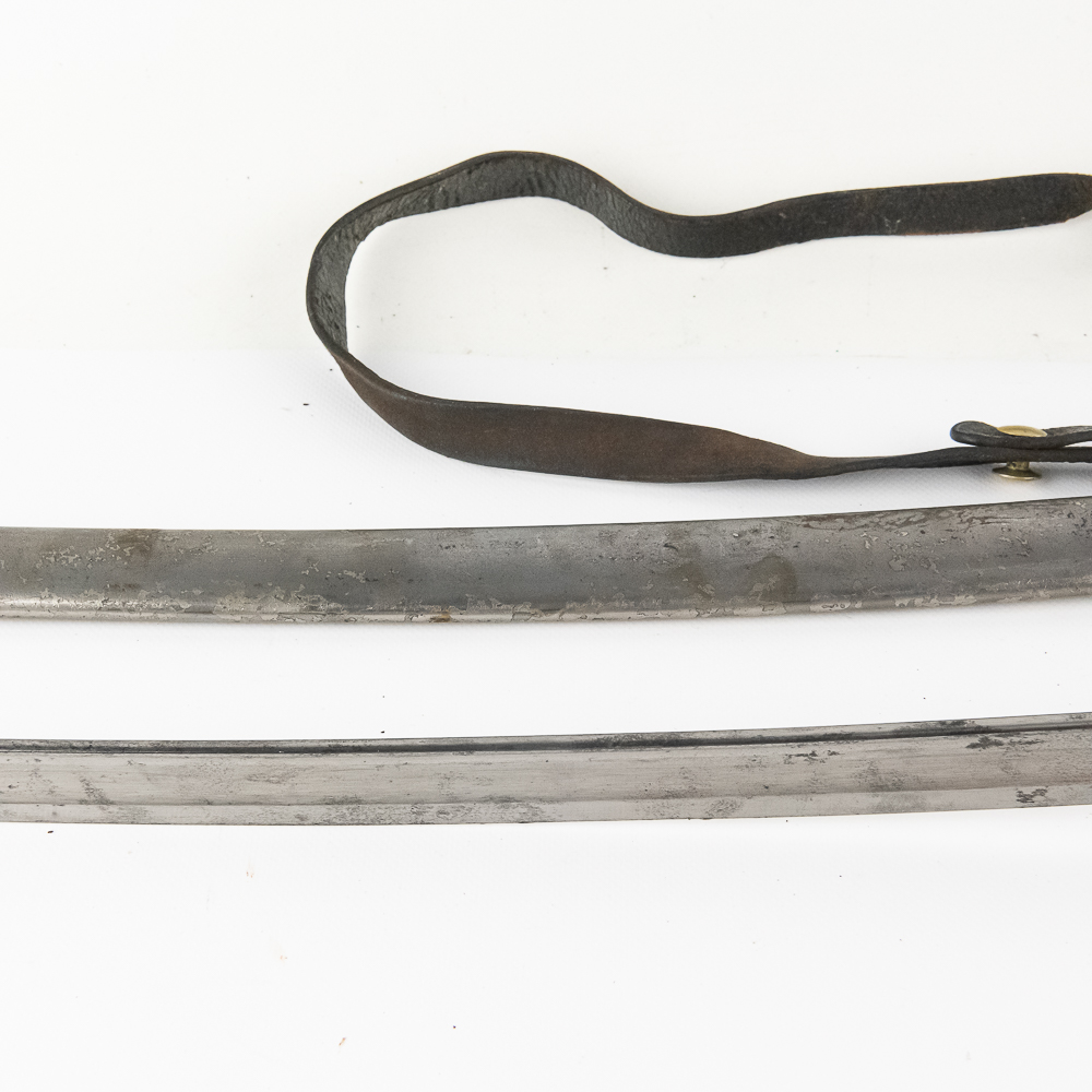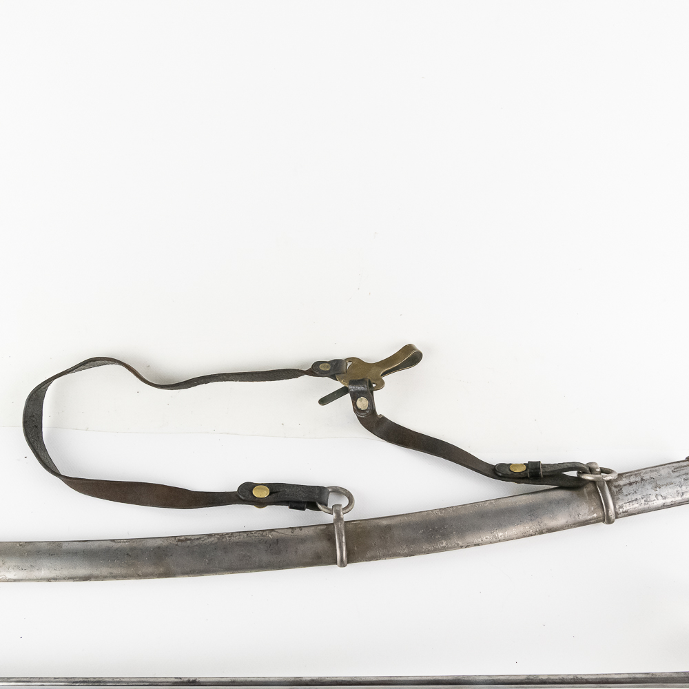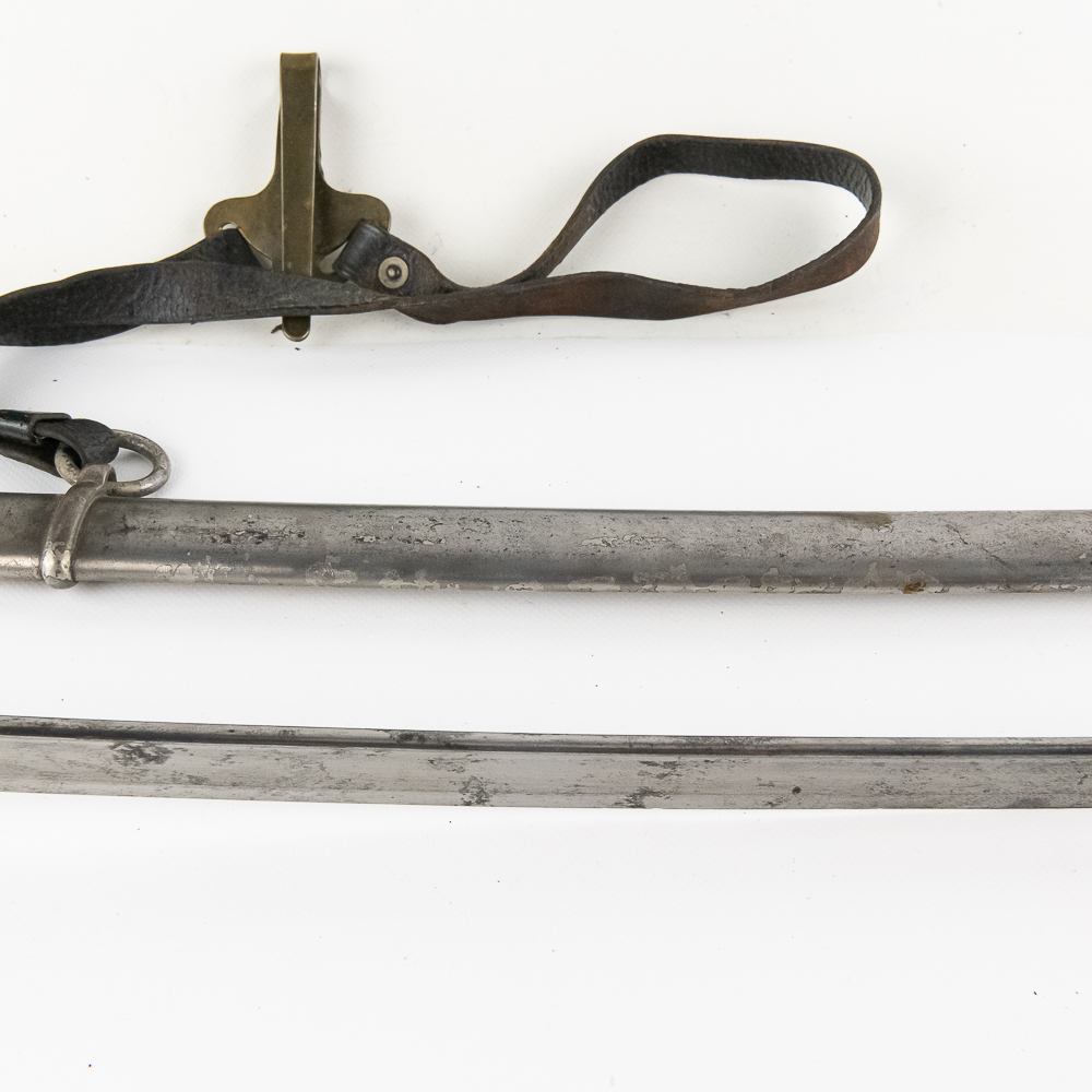 This sword with belt hangers is dated and marked Ames on blade ricasso with strange stamped dots. The dots may be a storage release from military use. Both sides have proofs and marks. The overall length is 42.25″ and 34.75″ blade. Blade is very bright and has series of nicks at 17″ out the further. Tips is good. The hangers are is amazingly good and servable condition. They show wear and green verdigris built up but they are ready for a torso or mannequin display. So many are fragile but not these hangers. The blade is bright with some nicks to middle of blade edge. The crossguard and hilt shows age and wear with a red hue to brass fittings. The leather and wire wrapped handle shows much wear and the wire very loose but still wrapped around. Scabbard has no dents or dings but looks like it is down to bare steel and was chromed a long time ago in our opinion. This is a very nice original set of hangers and sword.
