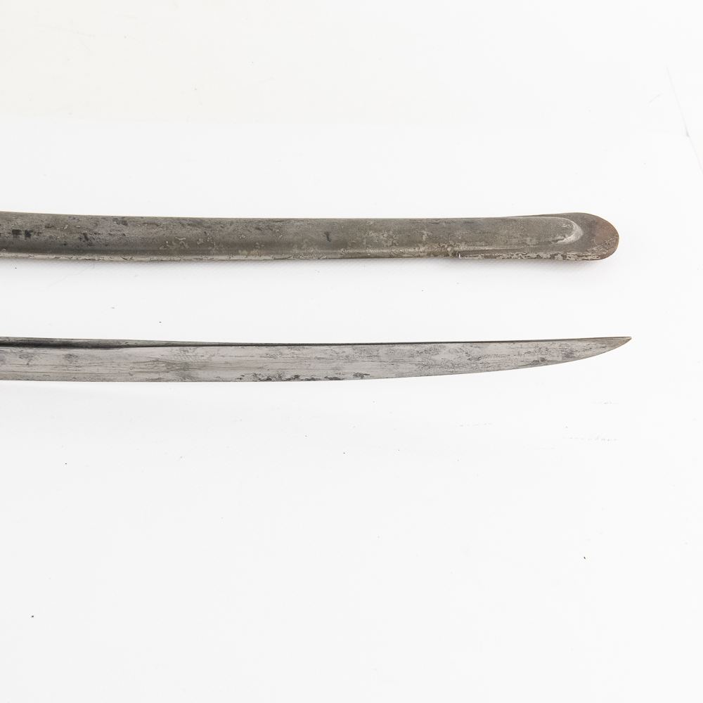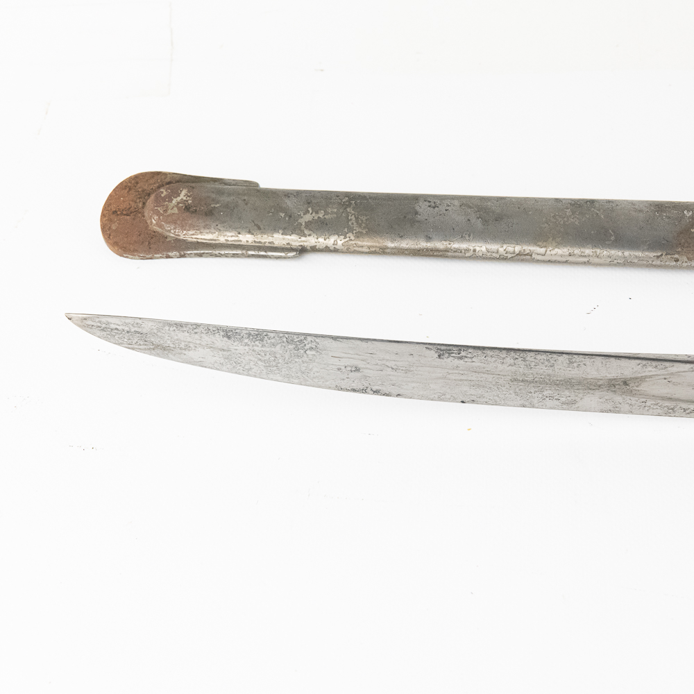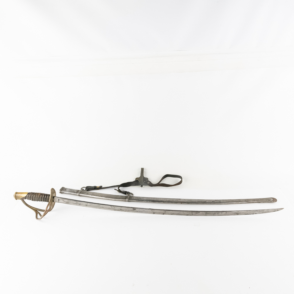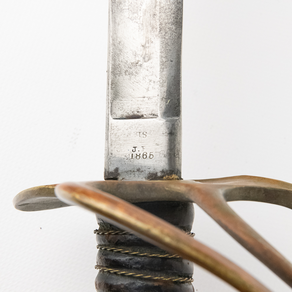 This sword with belt hangers is dated and marked Ames on blade ricasso with strange stamped dots. The dots may be a storage release from military use. Both sides have proofs and marks. The overall length is 42.25″ and 34.75″ blade. Blade is very bright and has series of nicks at 17″ out the further. Tips is good. The hangers are is amazingly good and servable condition. They show wear and green verdigris built up but they are ready for a torso or mannequin display. So many are fragile but not these hangers. The blade is bright with some nicks to middle of blade edge. The crossguard and hilt shows age and wear with a red hue to brass fittings. The leather and wire wrapped handle shows much wear and the wire very loose but still wrapped around. Scabbard has no dents or dings but looks like it is down to bare steel and was chromed a long time ago in our opinion. This is a very nice original set of hangers and sword.