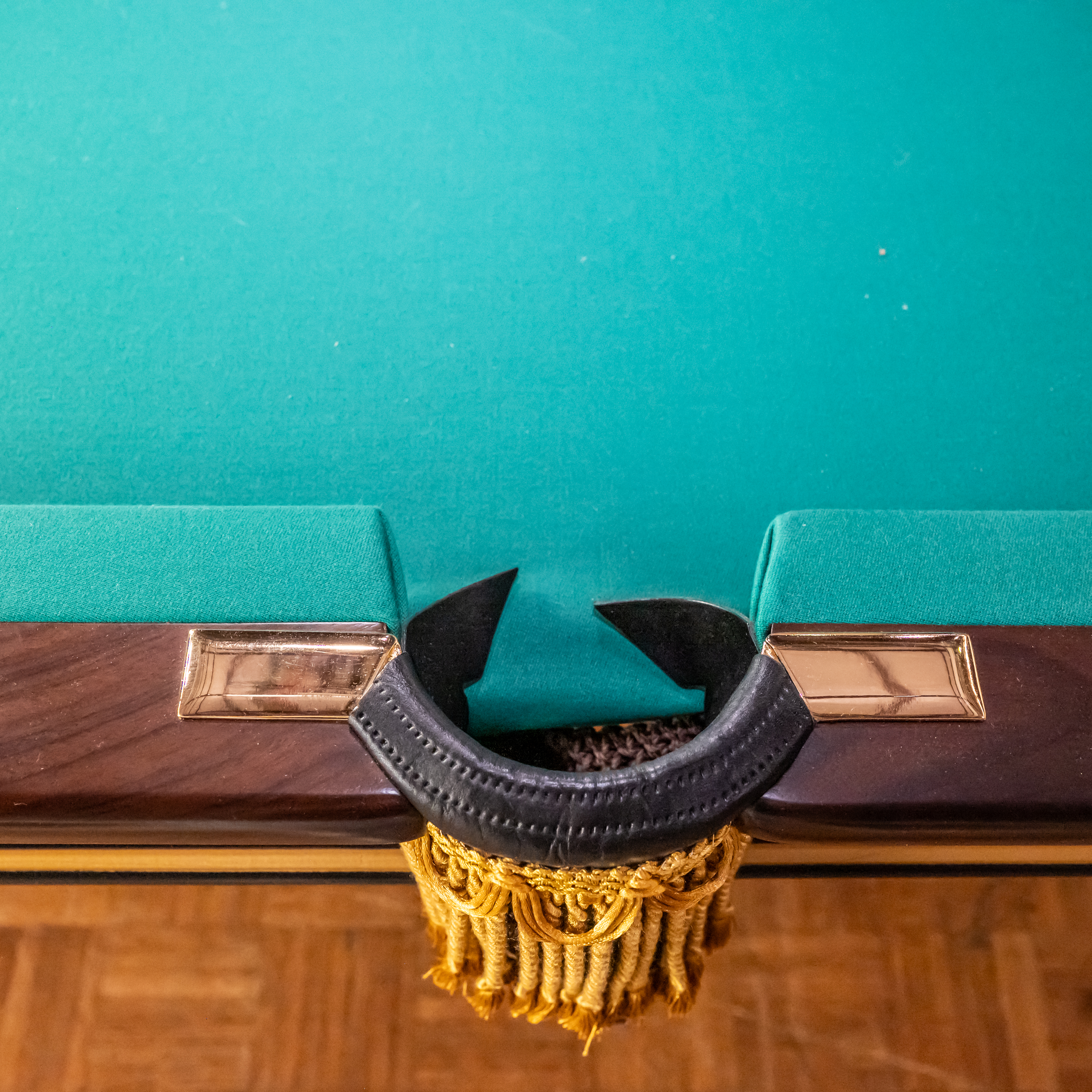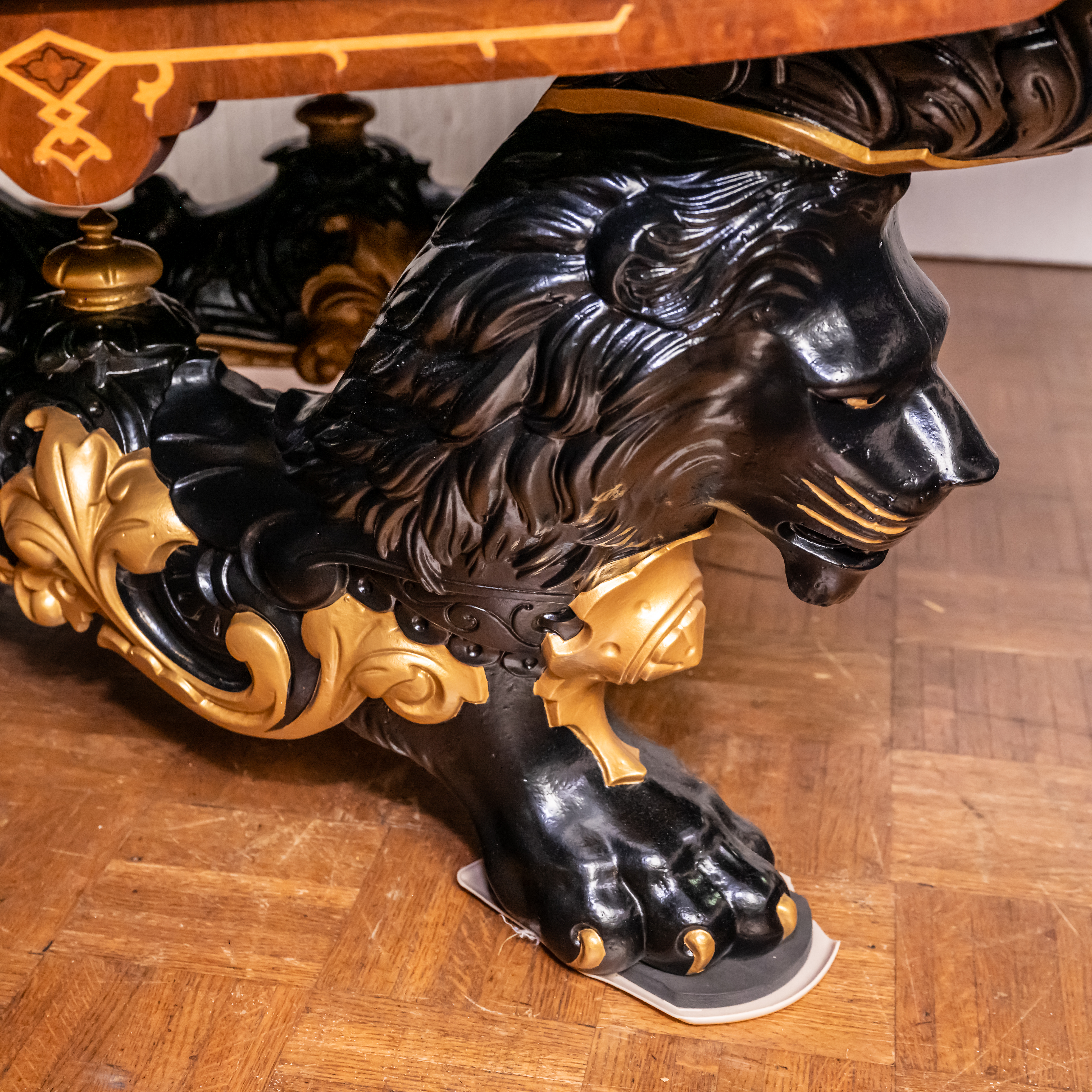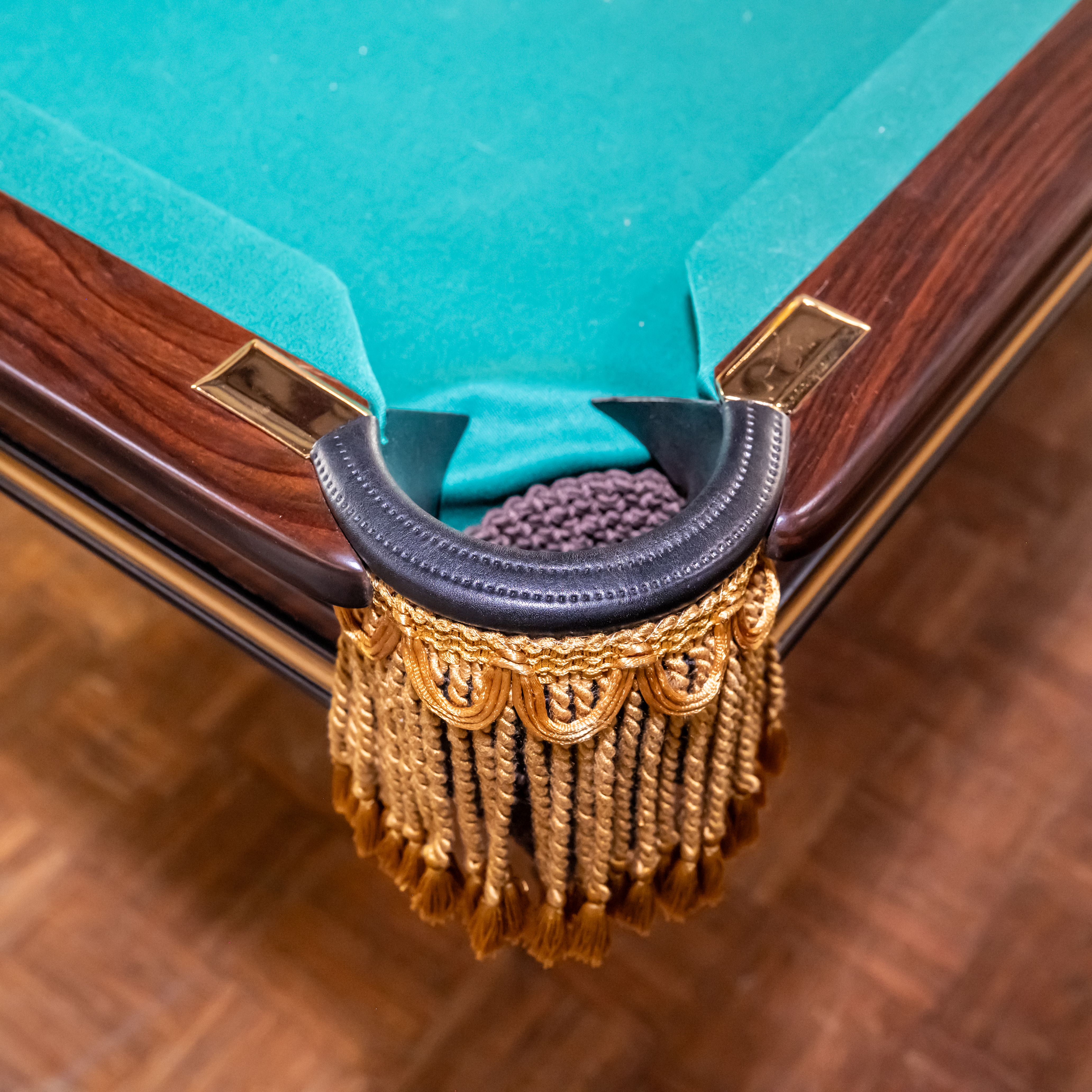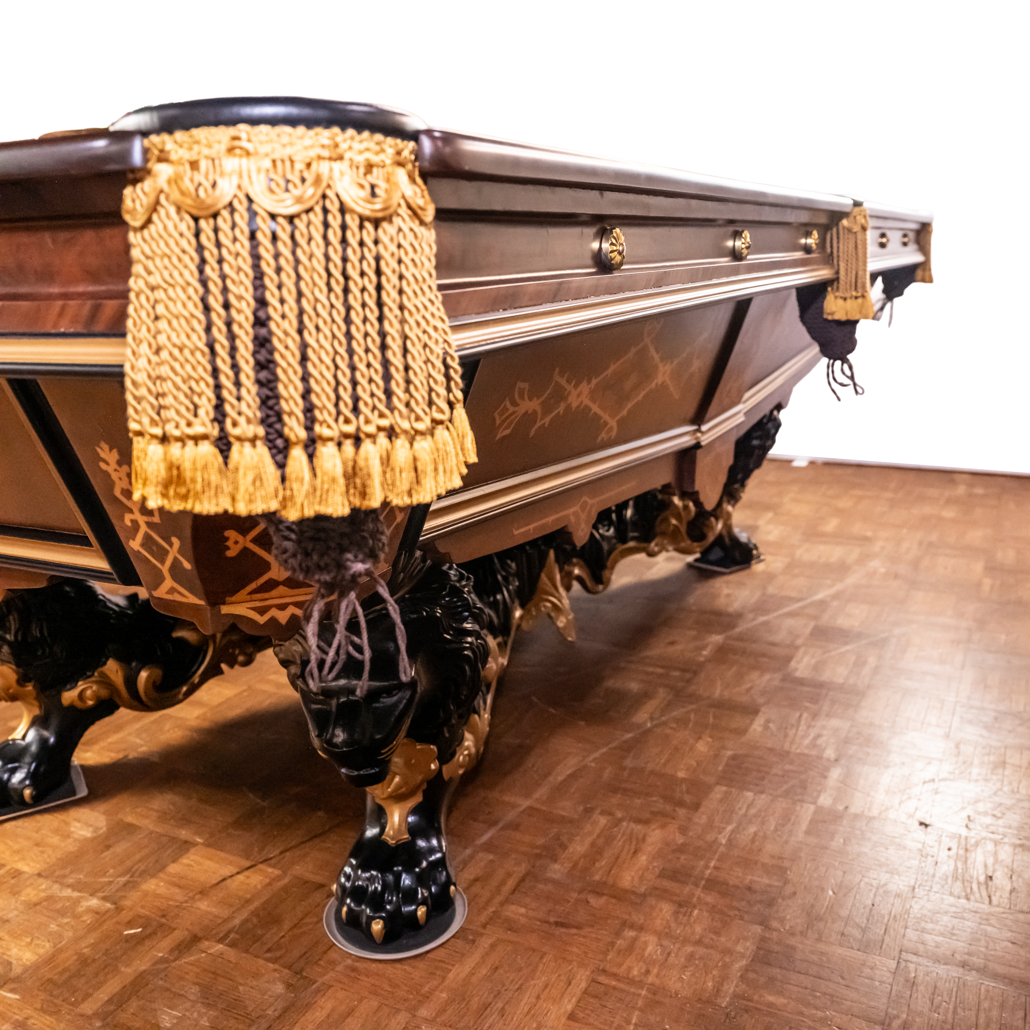 A very early example of the Brunswick Monarch table produced in the 1870s. Walnut background with extensive inlay of exotic woods on all surfaces. Genuine 18-karat gold accents. Highly desirable nine-foot X 4.5’W size. Four-piece slate playing surface.