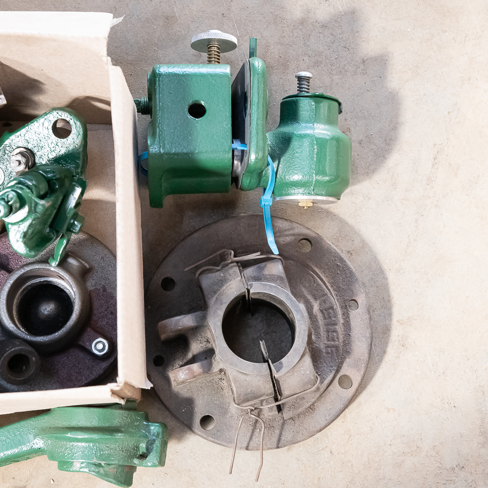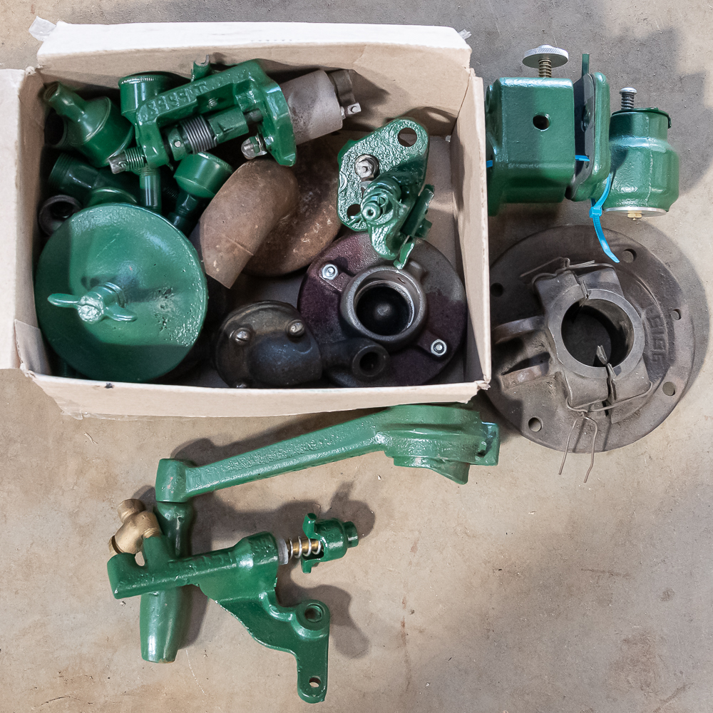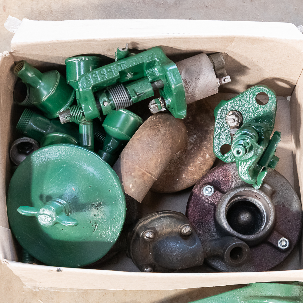 International M 1 1/2 HP parts include hand crank, igniter, grease cup, fuel pump, new and used mufflers. See photos