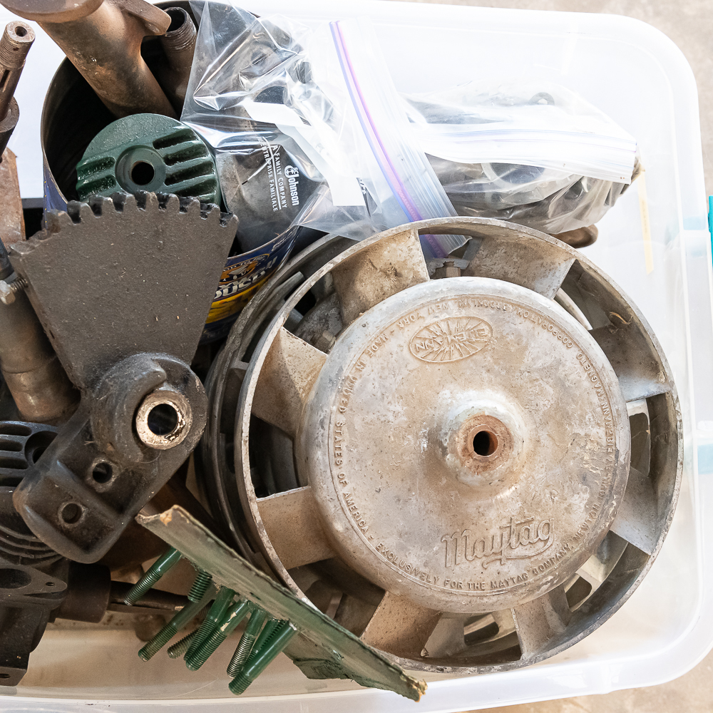 Maytag 92 & 72 engine parts includes flywheels, crankshafts, cylinders, and misc parts for single and twin cylinder engines. See photos