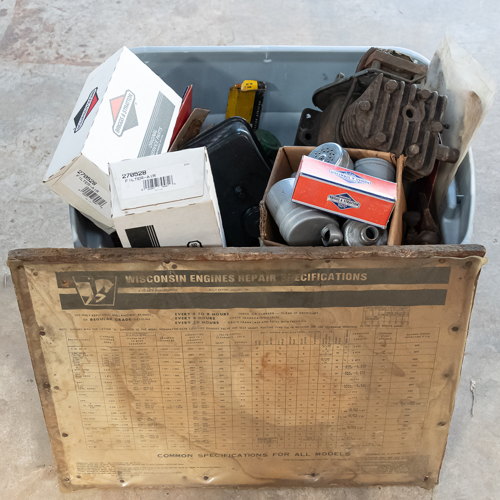 Gaskets, fuel tanks, air filters, muffler, and many misc parts for Briggs & Stratton, Kohler, & Wisconsin engines. See photos
