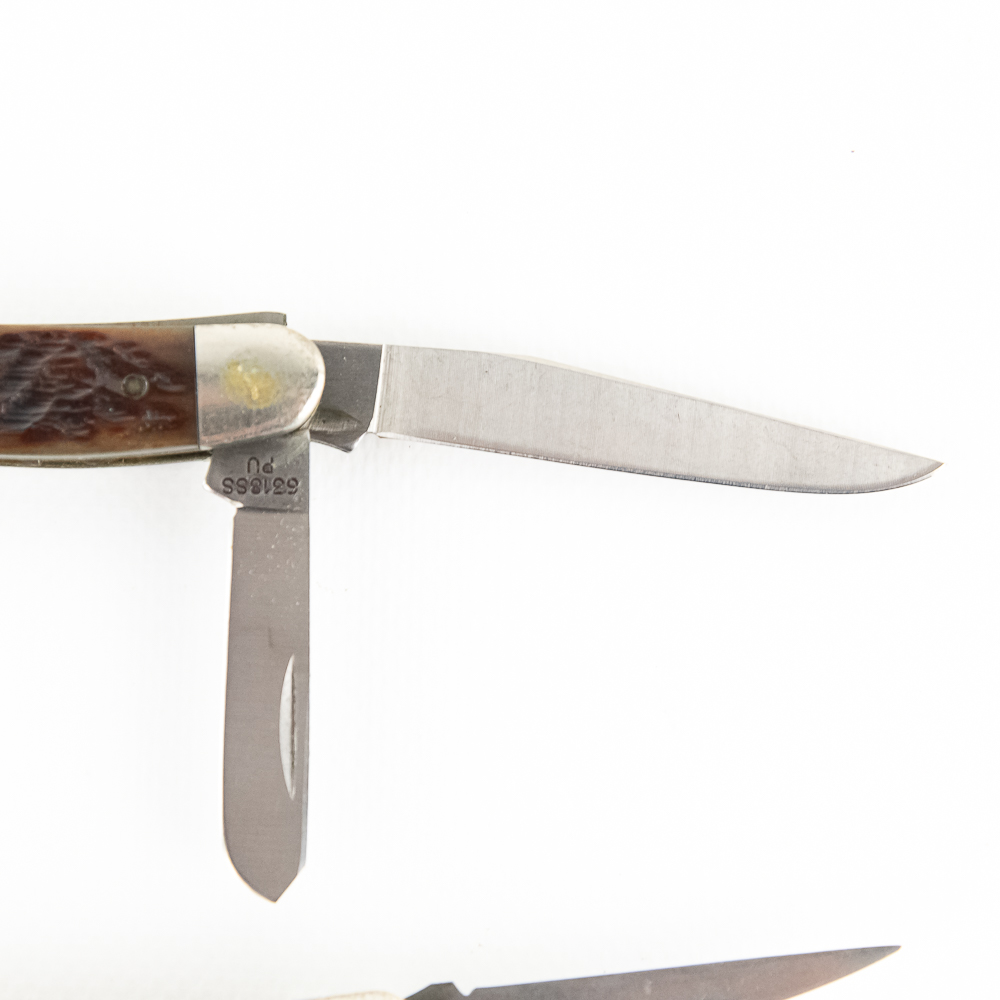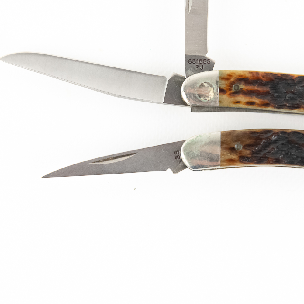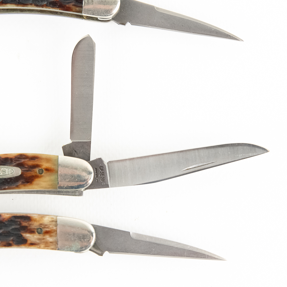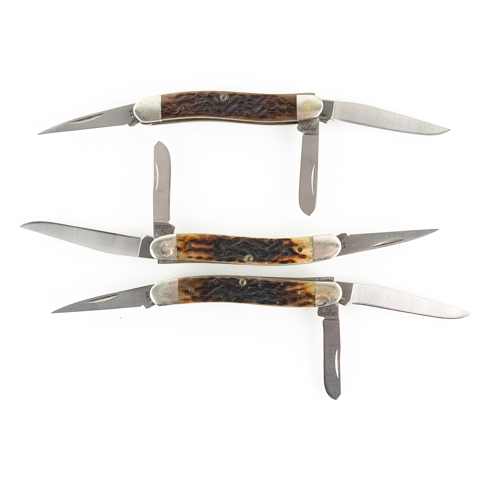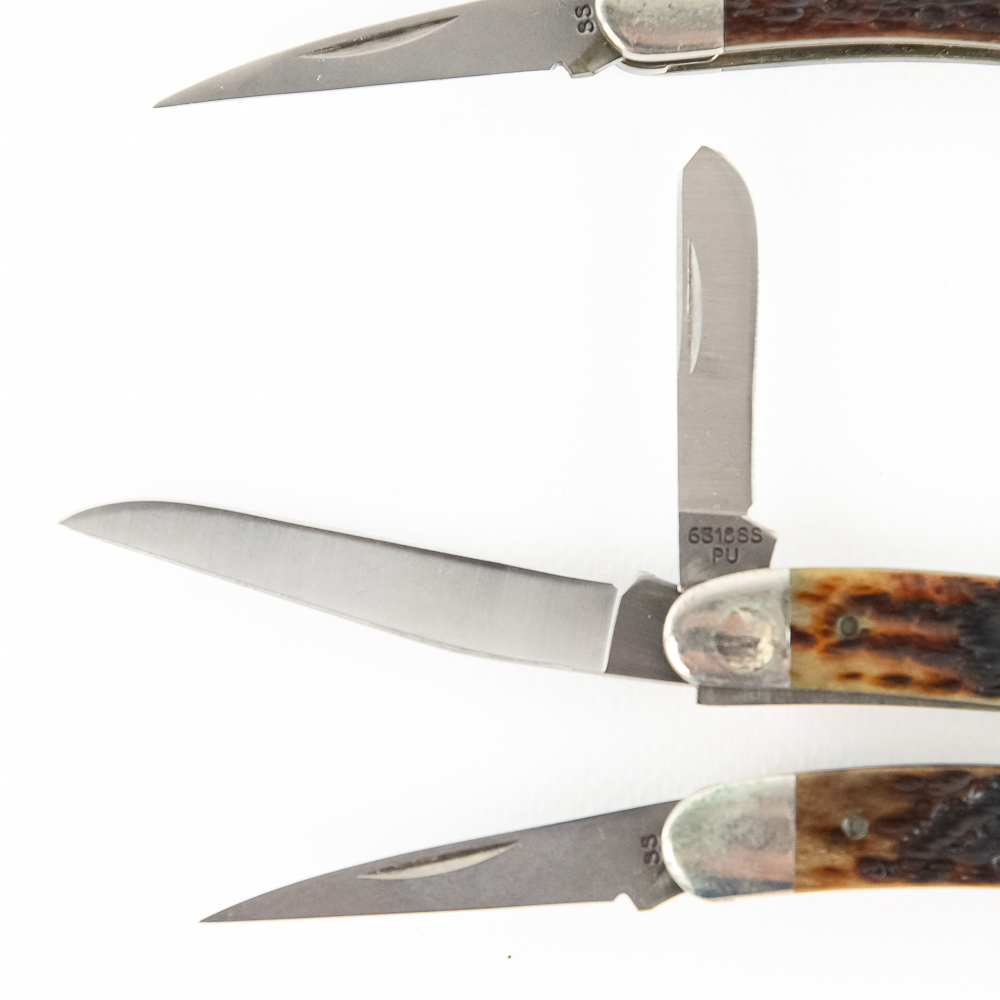 3 Case XX USA Model 6318SS Stockman Knives. 1990s production knives are like new with only minor storage wear on bolsters. Very nice high quality US made knives with Stag handles. Excellent collector lot or gift items. 3.6″ closed length. See photos.